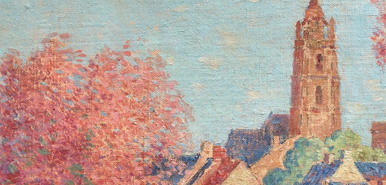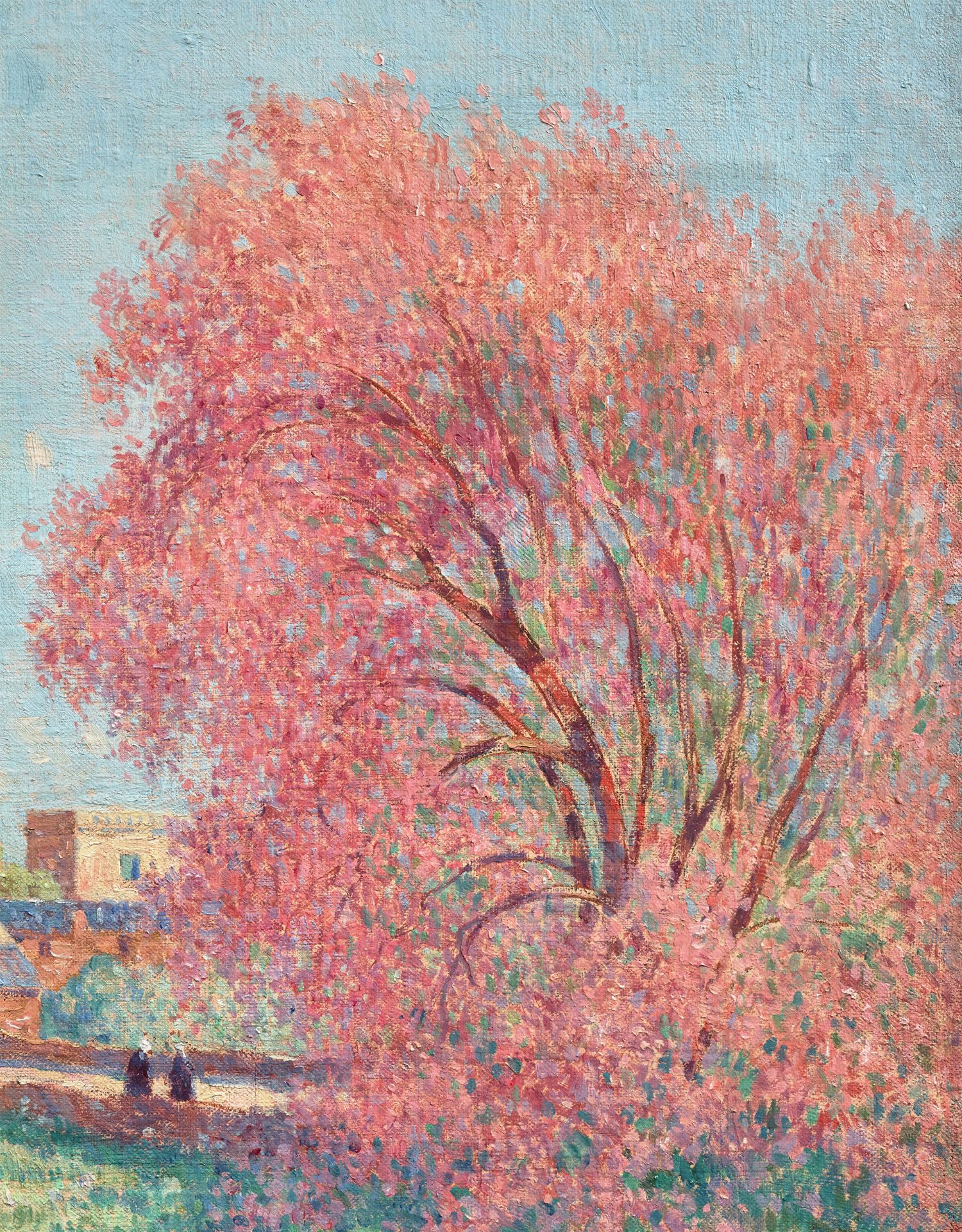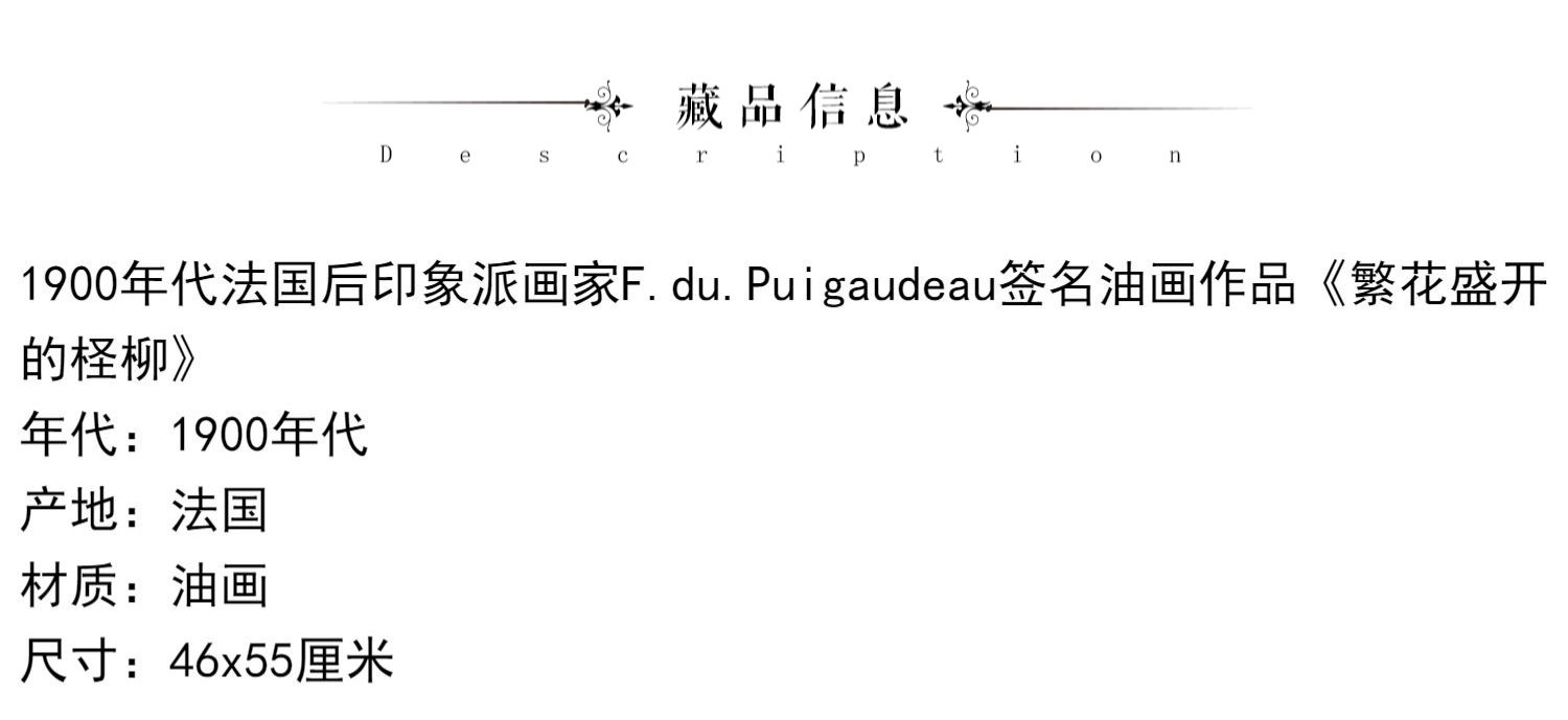独角鹿西洋古董F.du.Puigaudeau签名油画作品《繁花盛开的柽柳》