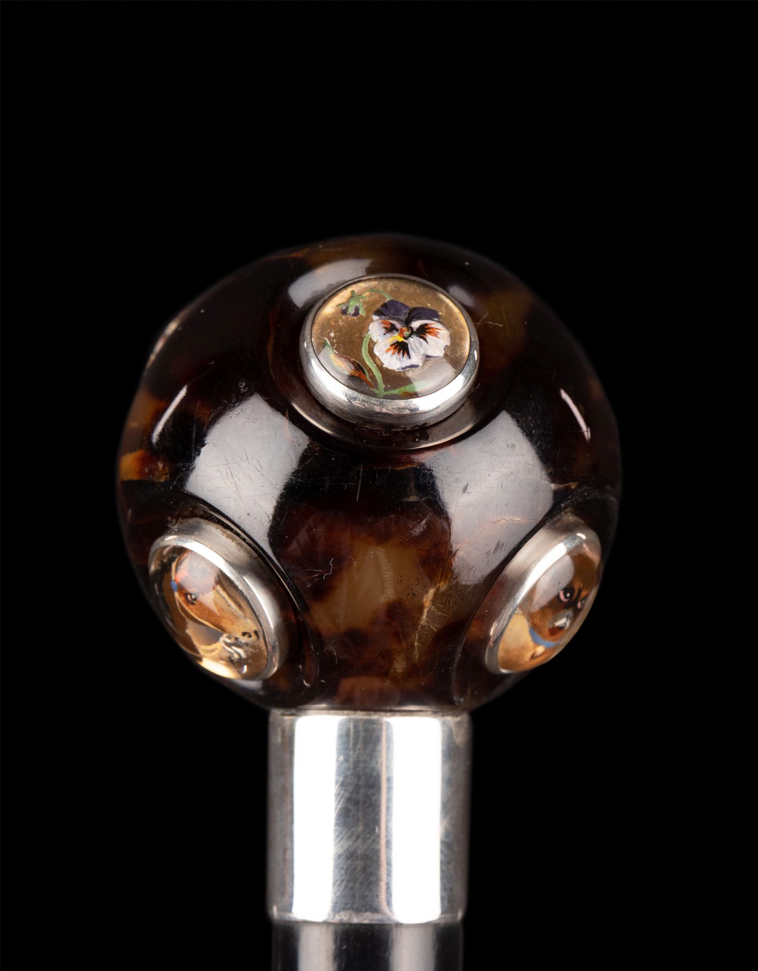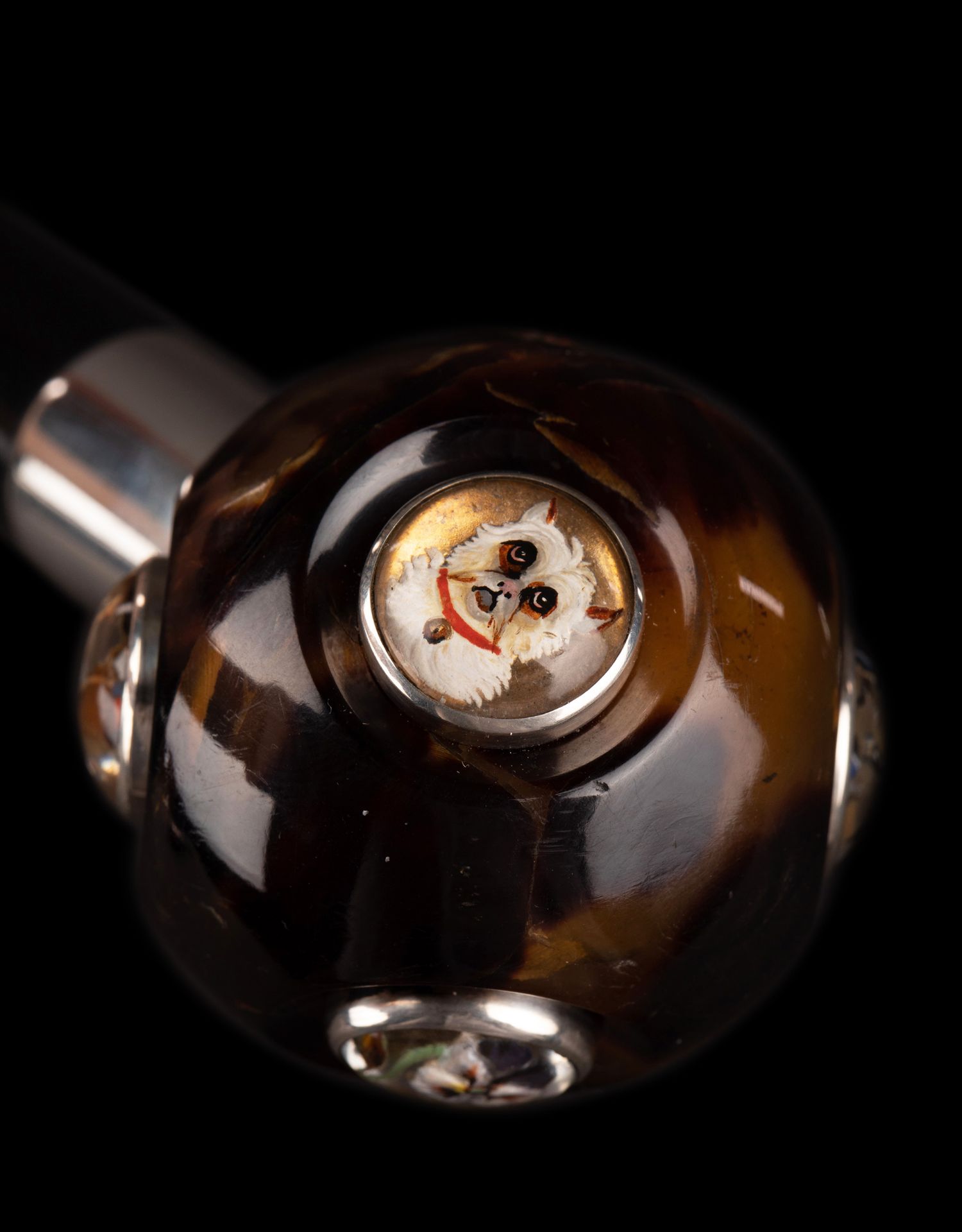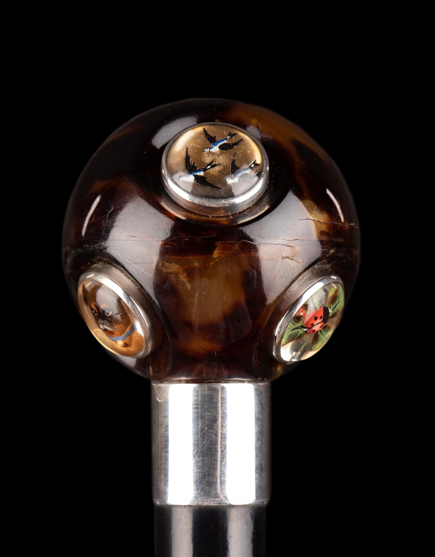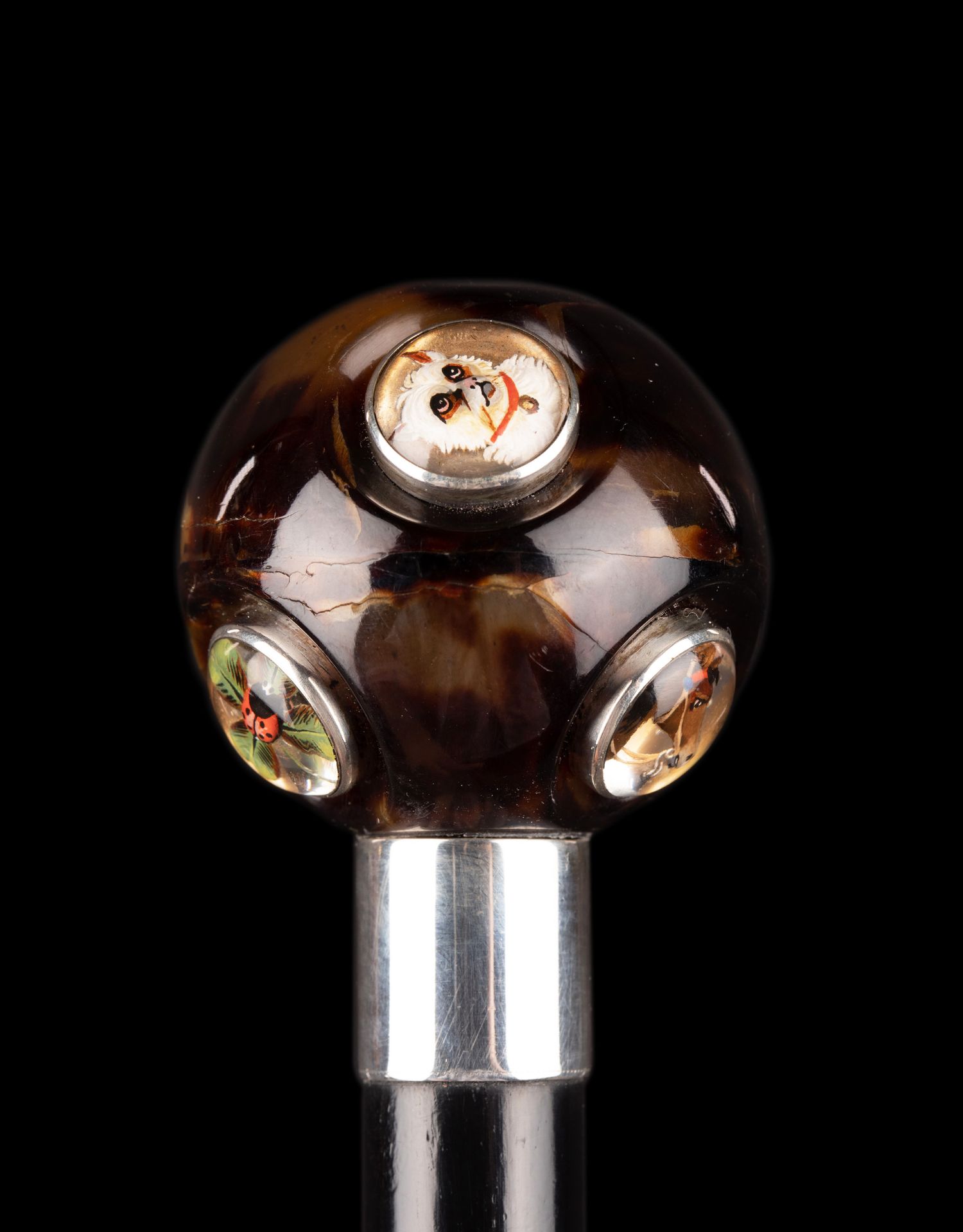 独角鹿西洋古董英国彩绘细密画装饰水晶球形杖柄黑漆硬木杖身手杖