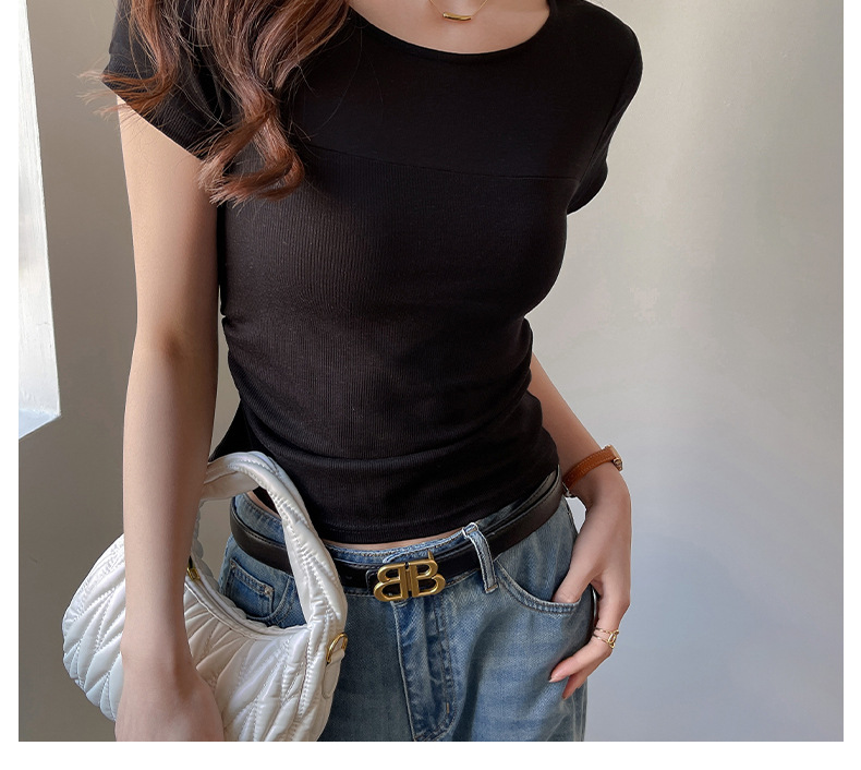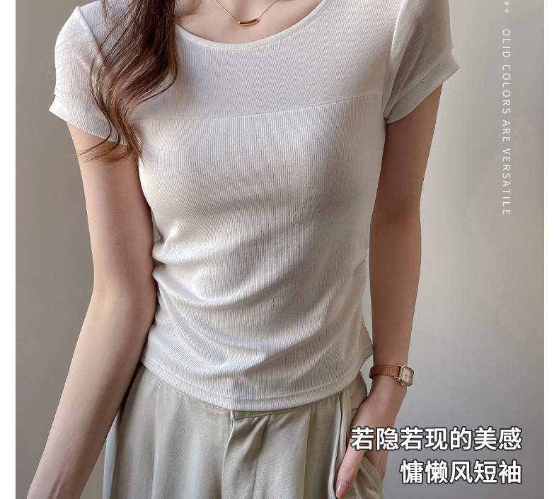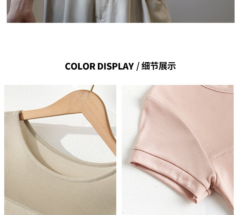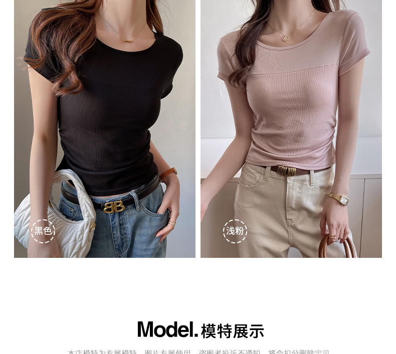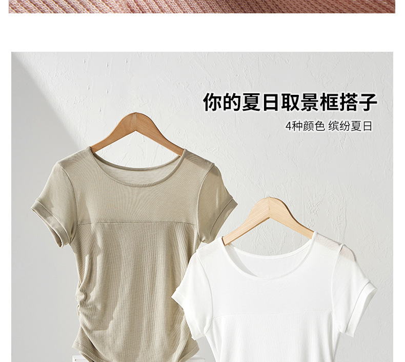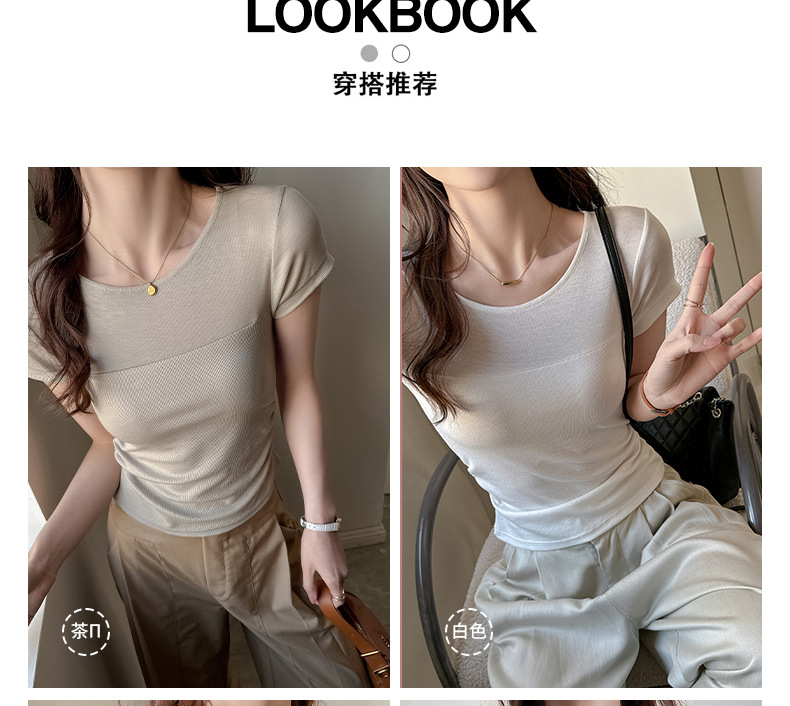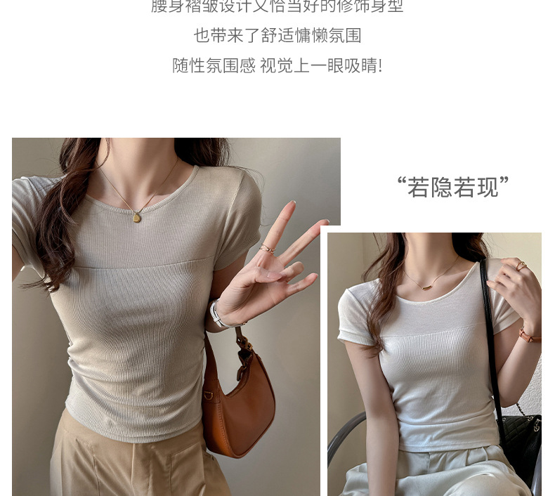 ✨莱赛尔天丝韩系女装【小圆领正肩t恤】女短袖高级拼接收腰设计感上衣