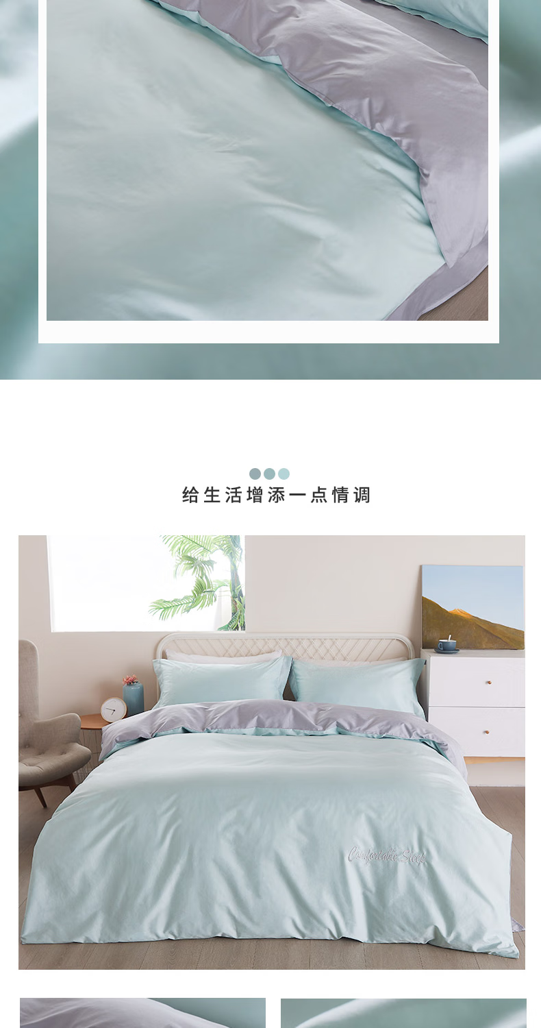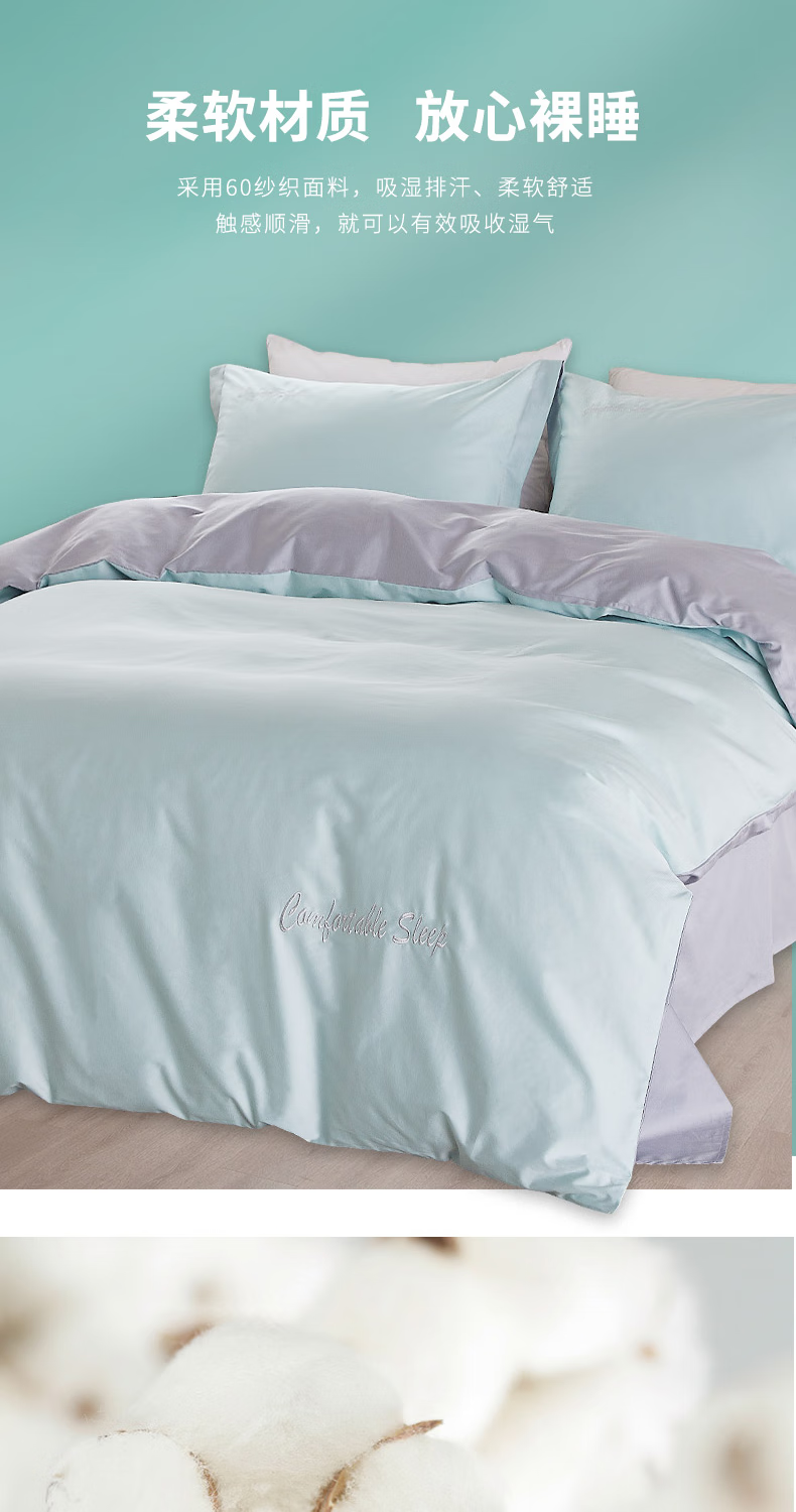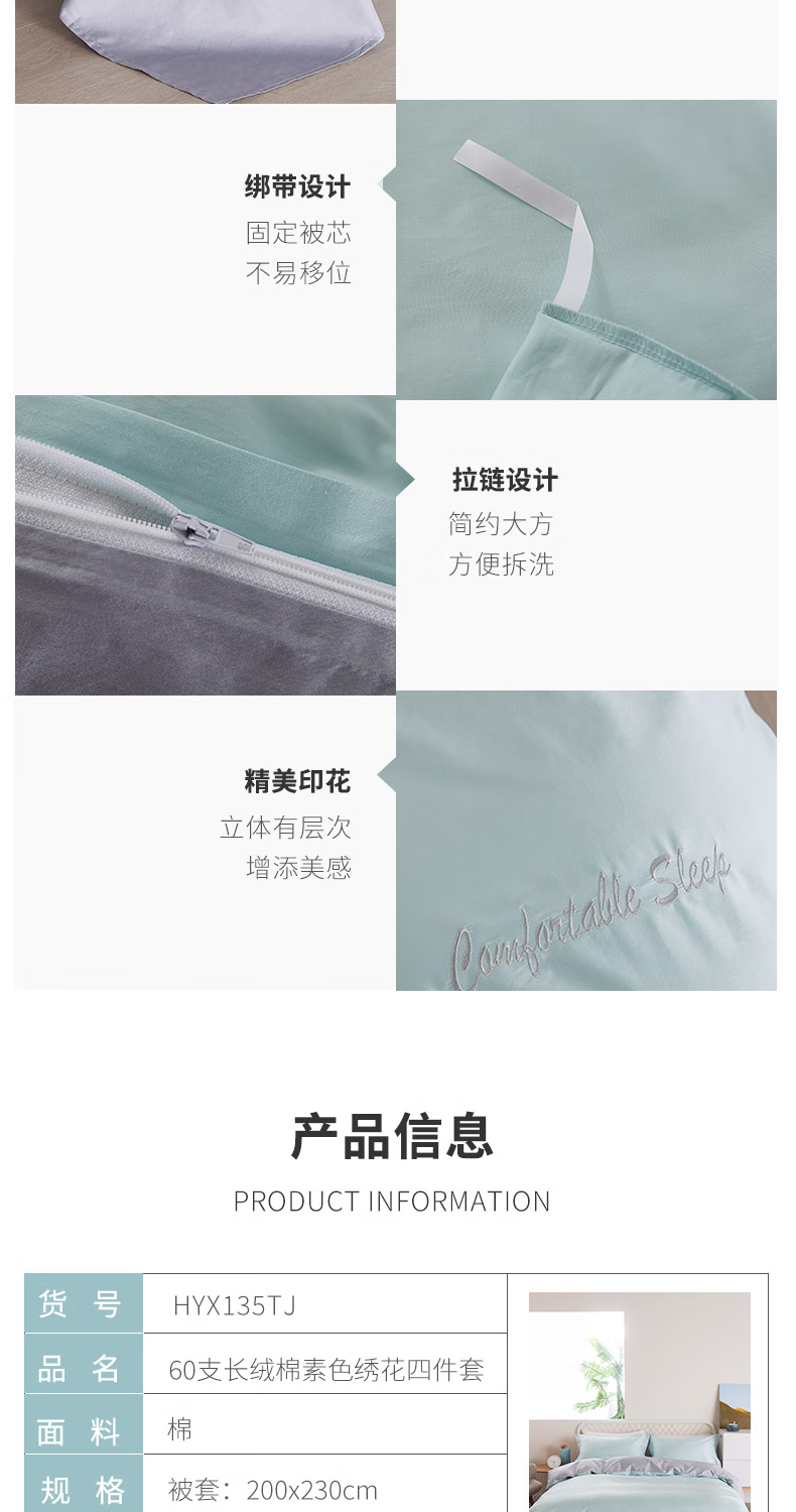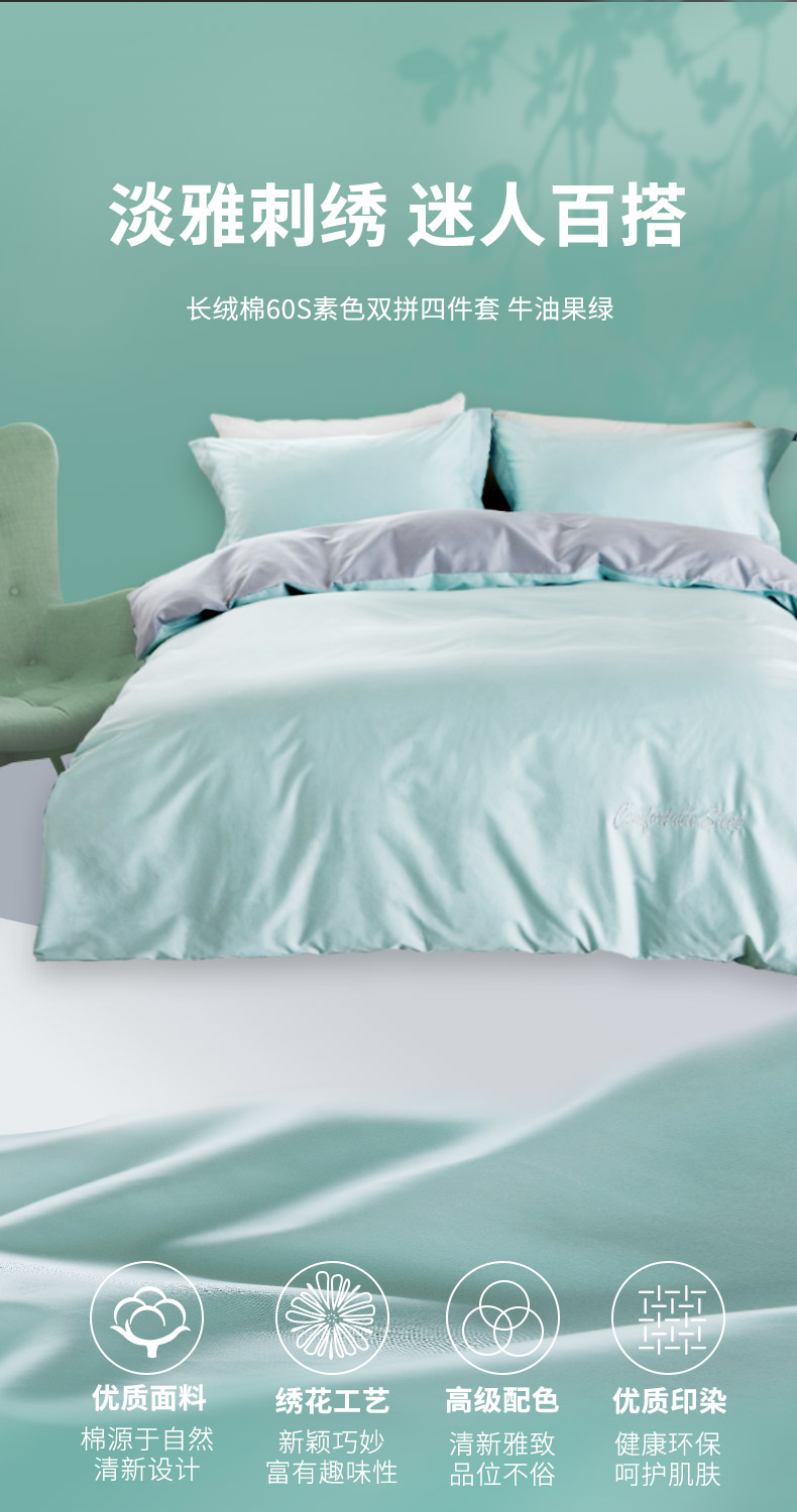 恒源祥60支长绒棉四件套简约纯色刺绣套件高端礼盒装 牛油果绿200*230cm