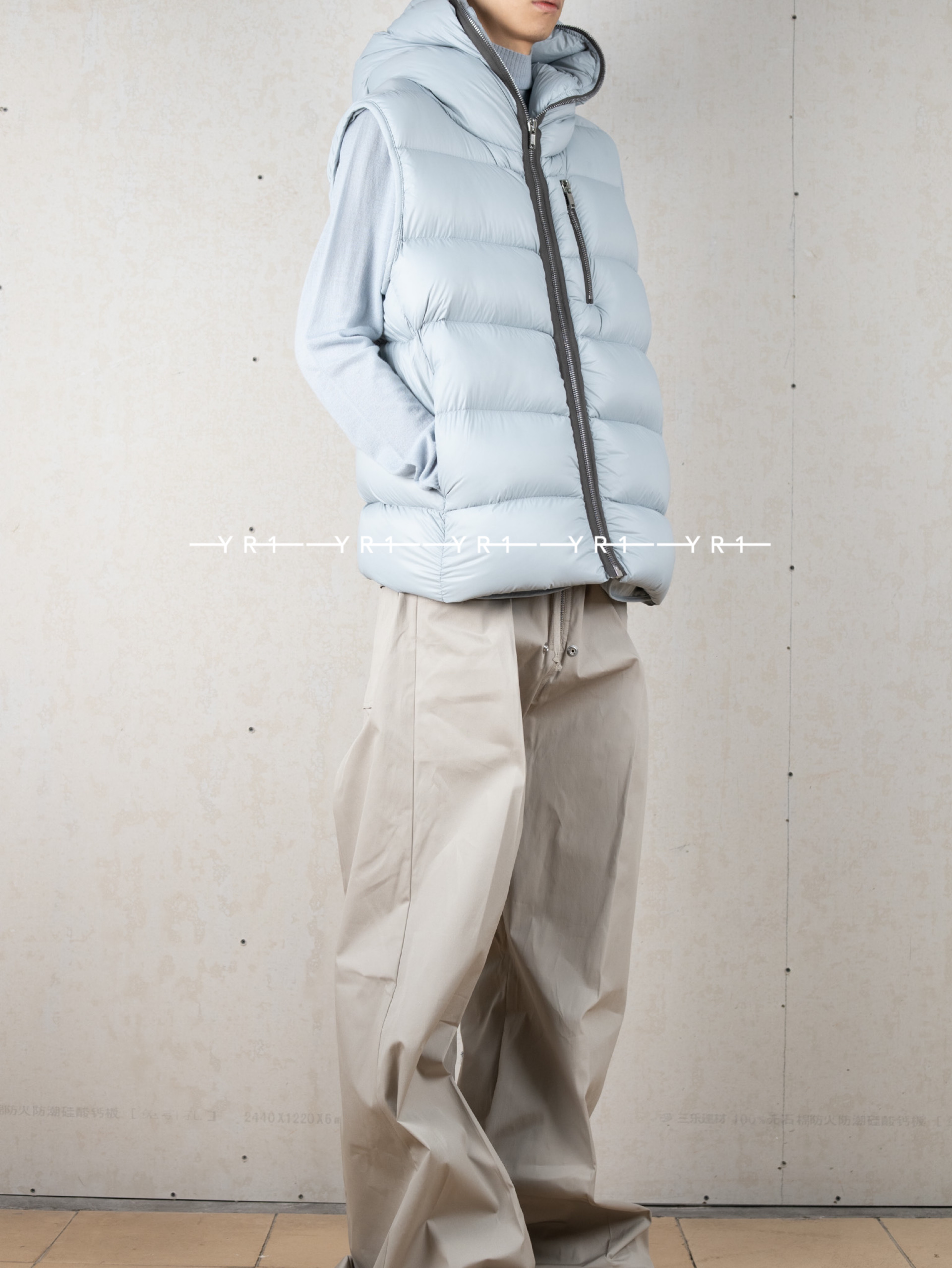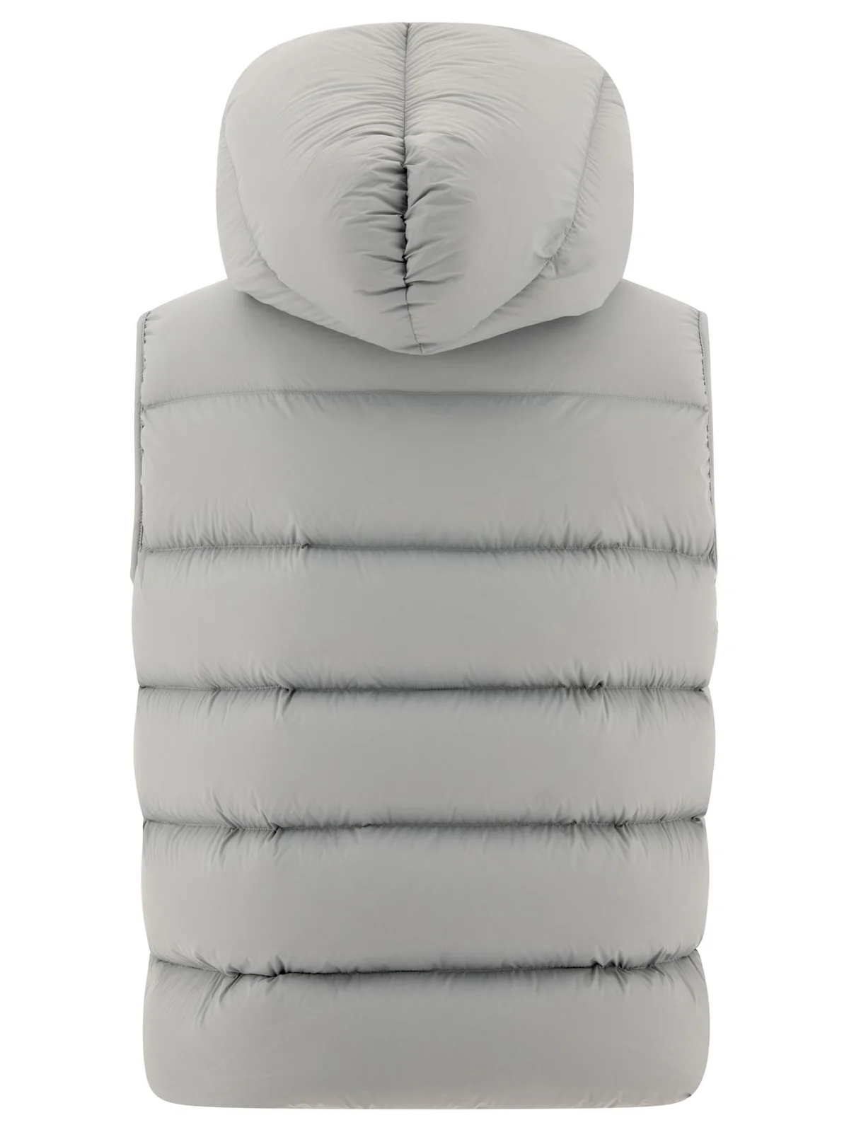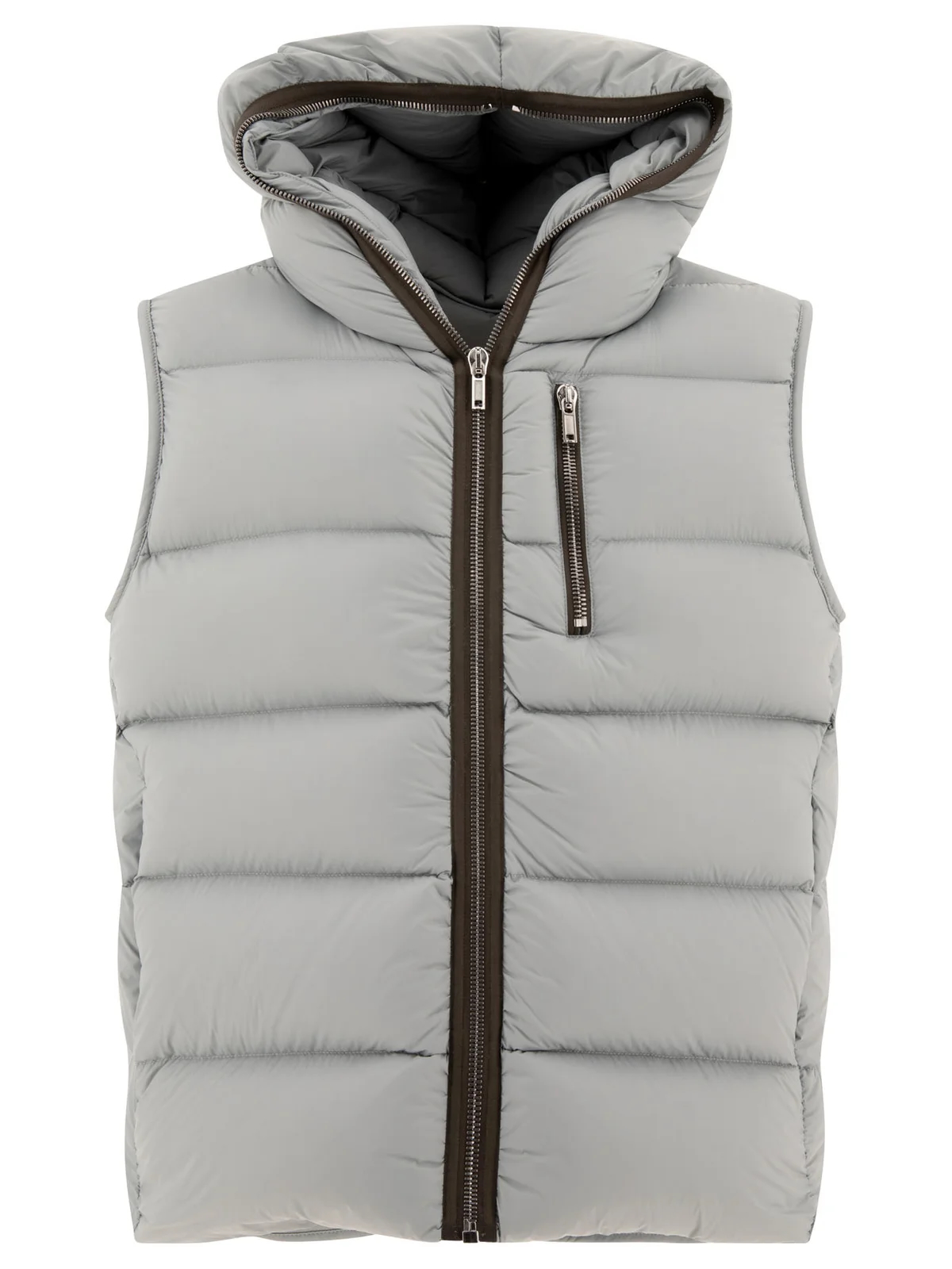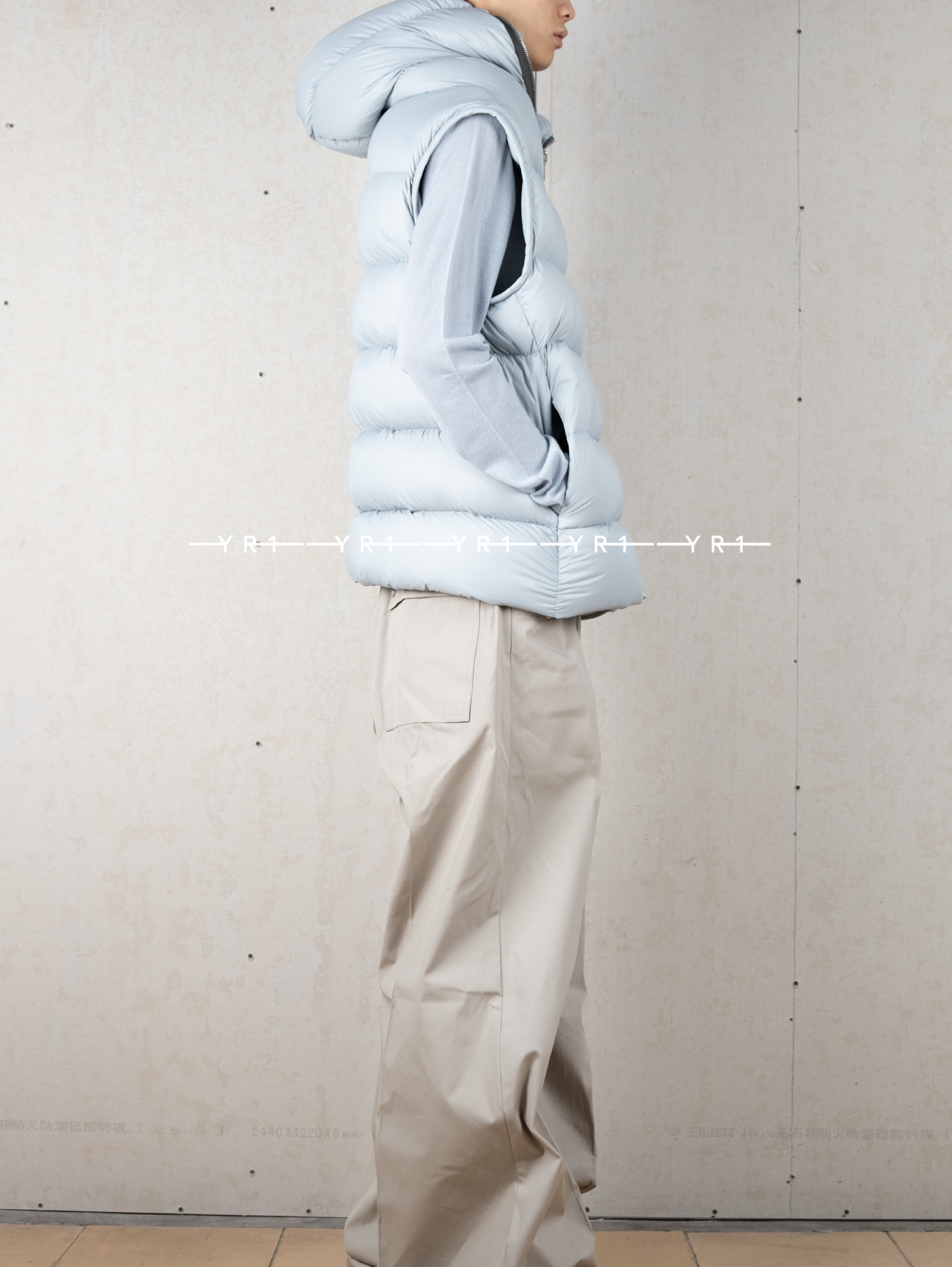 这款密封背心无袖,长度及臀,采用厚重羽绒材料和水平缝线设计。