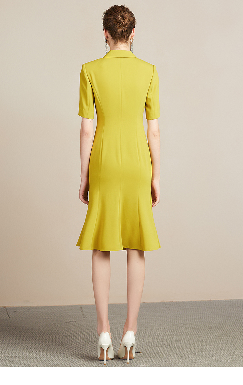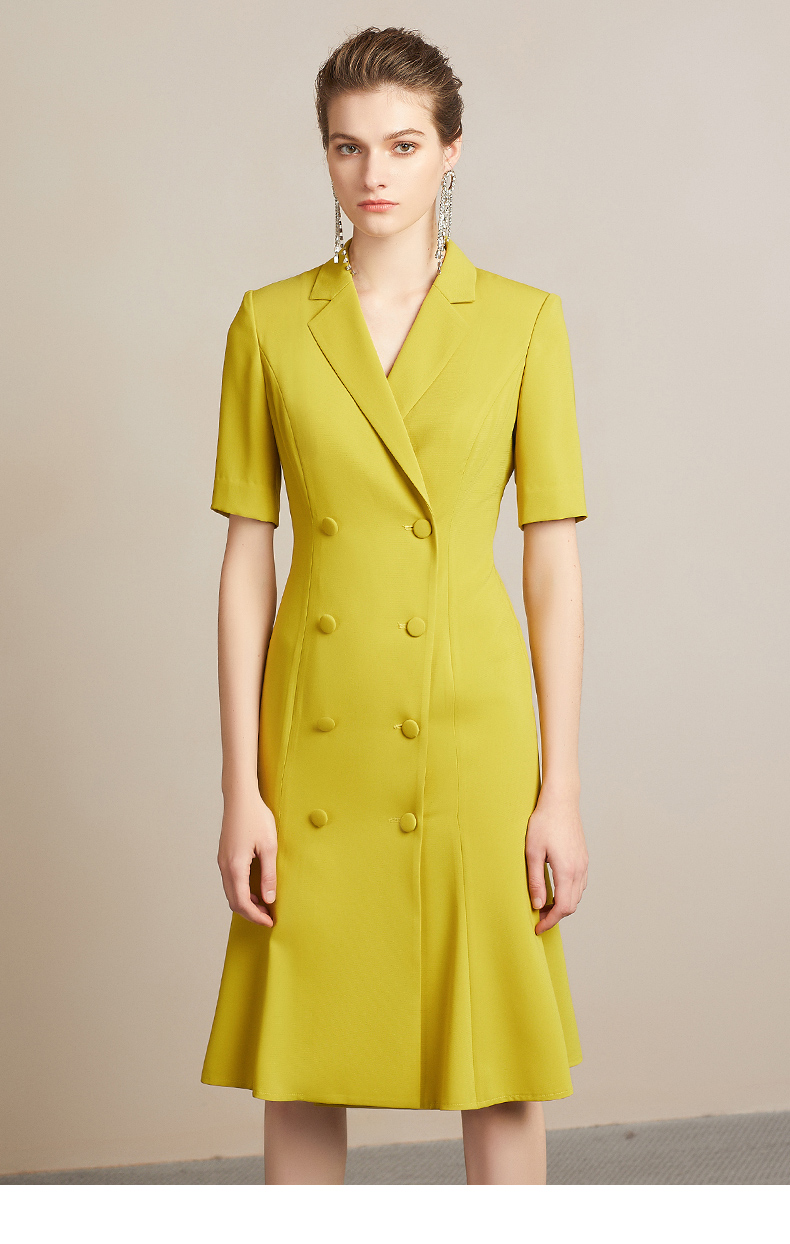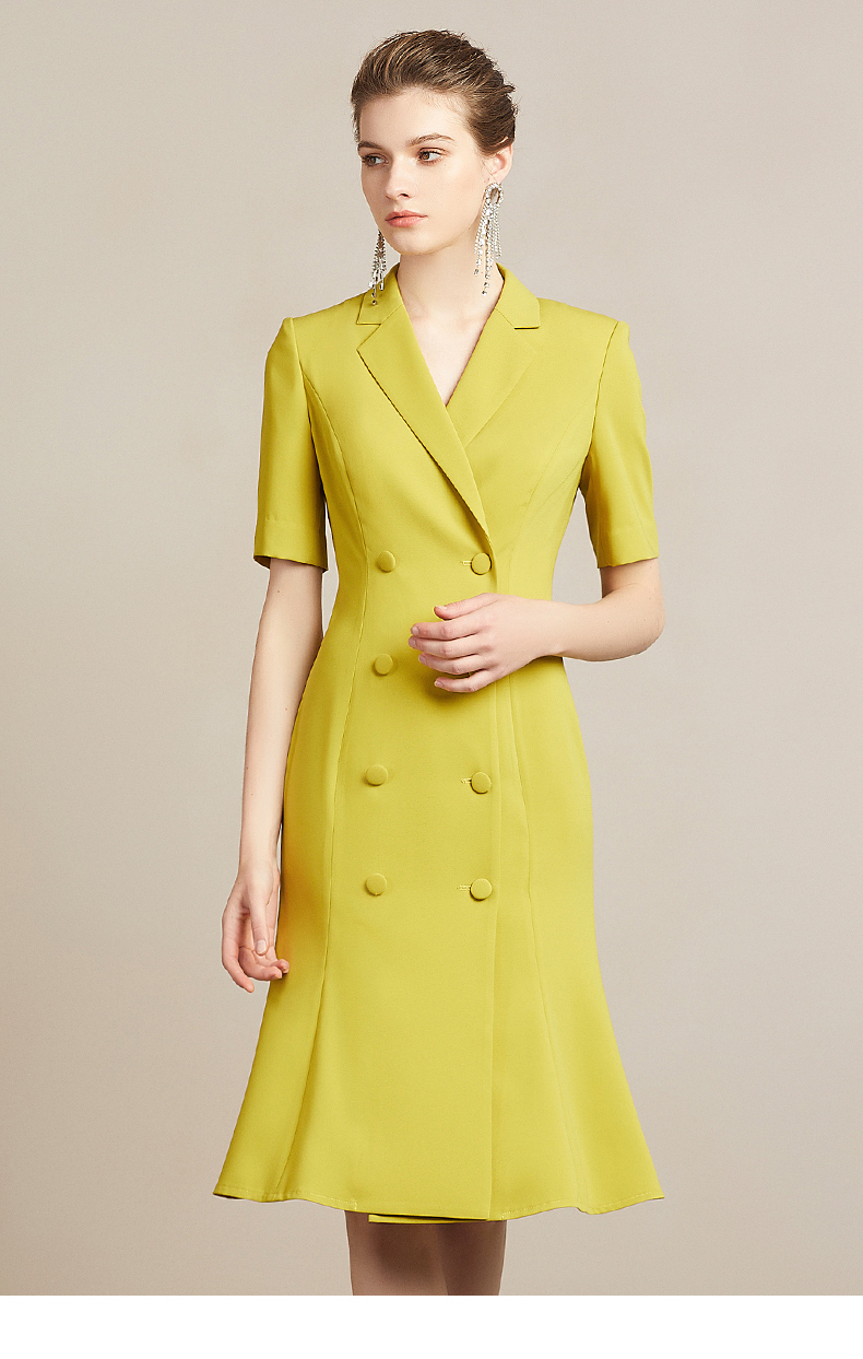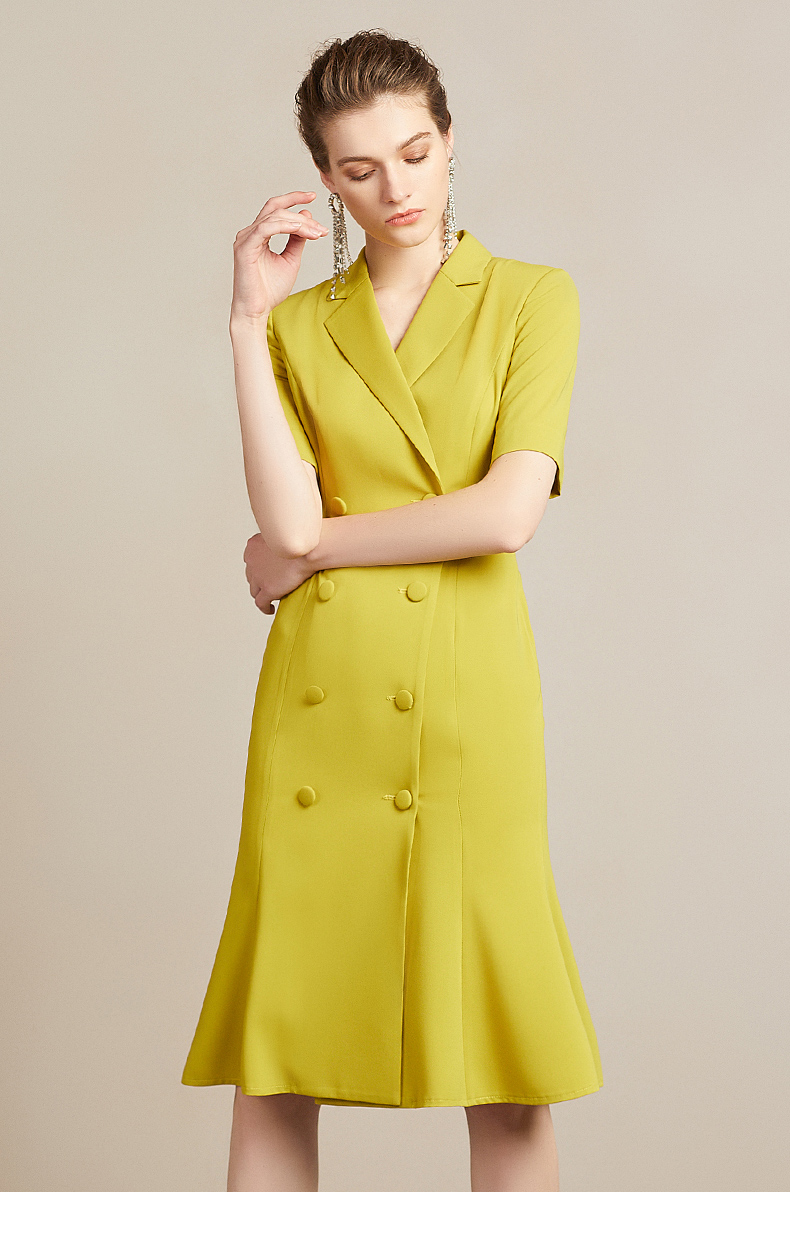 IWY/高端时尚芥末黄中袖连衣裙欧美女装西装领修身气质名媛裙212035Q1