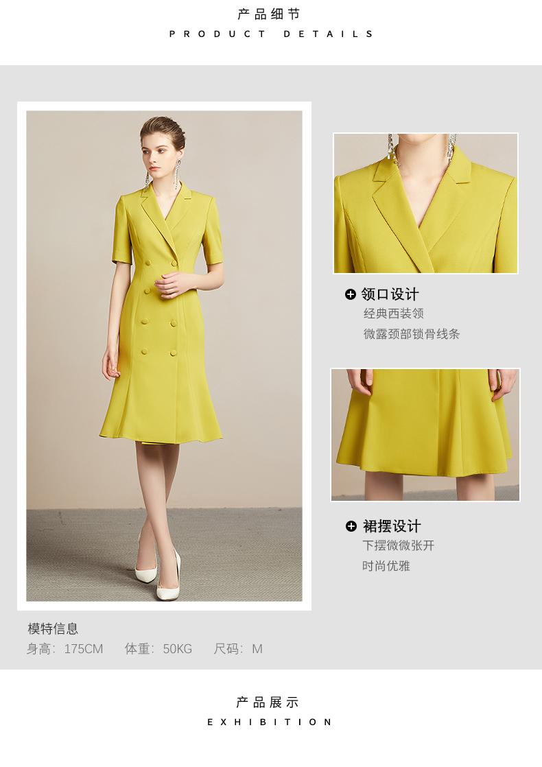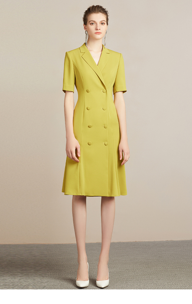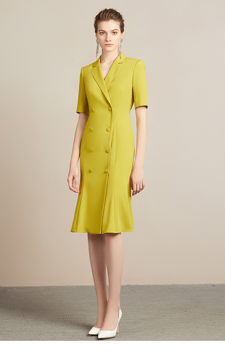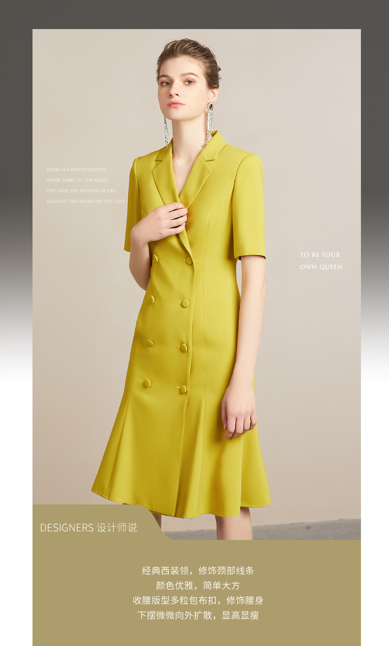 IWY/高端时尚芥末黄中袖连衣裙欧美女装西装领修身气质名媛裙212035Q1