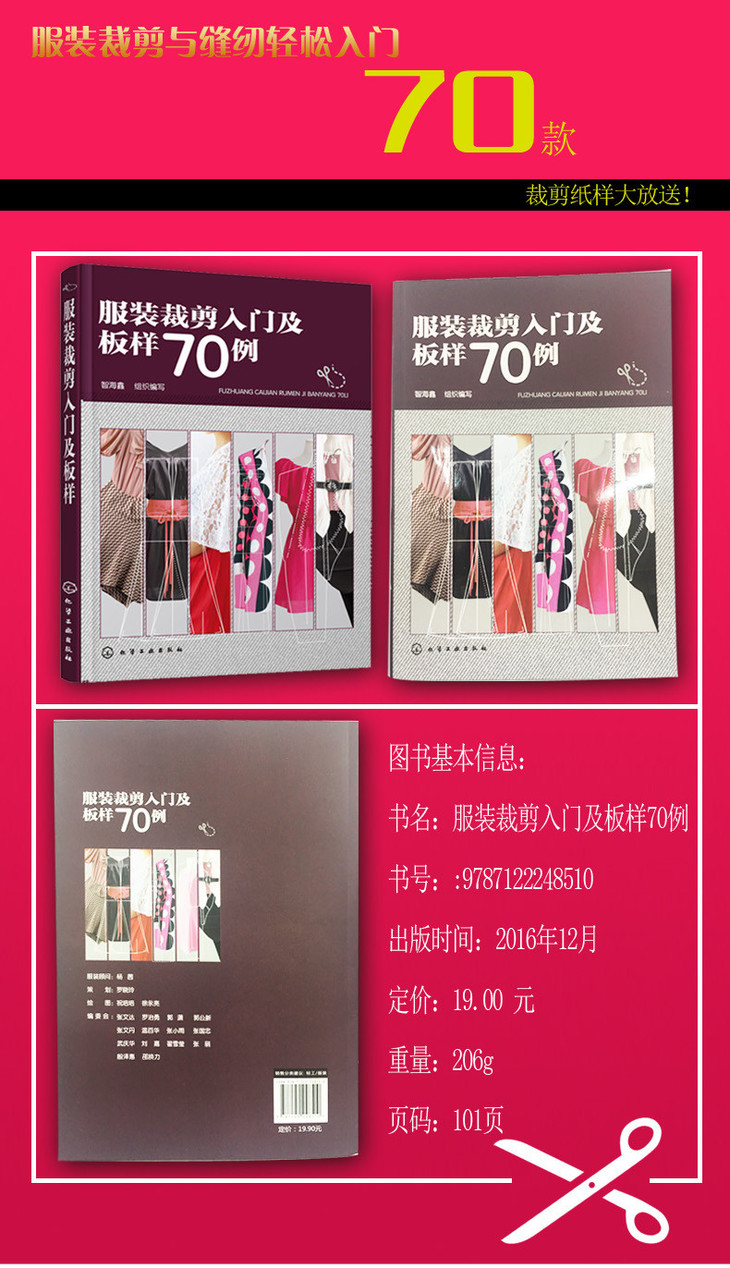 《服装裁剪入门及板样70例》,介绍了西服上衣、西裤、马甲、女士西裙、男士夹大衣、特殊体型的测量和加放经验数据;还介绍了男士服装、女士服装、儿童服装的制板与裁剪说明。