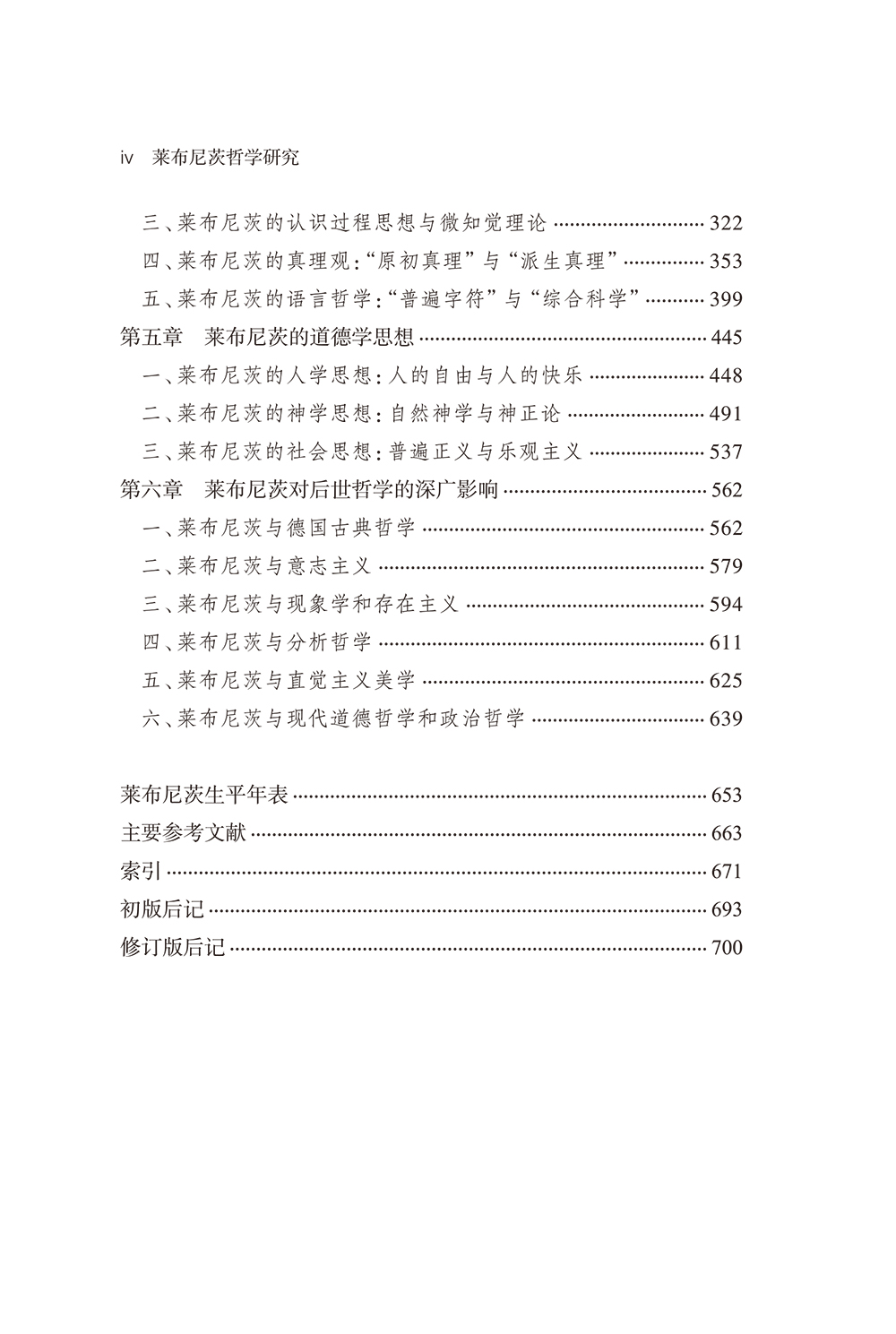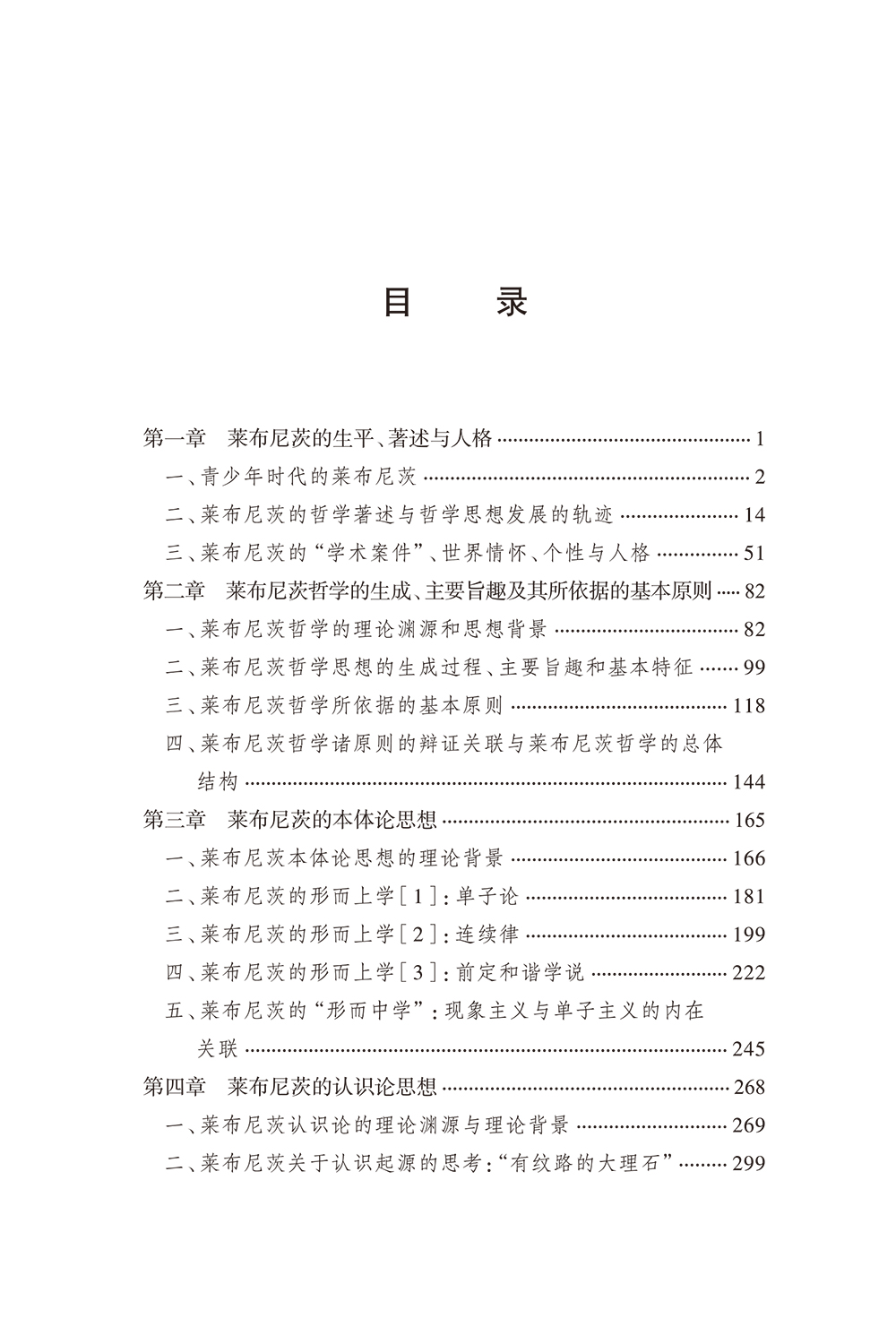 本书旨在尽可能多地依据文本,尽可能多地结合其语境,对莱布尼茨的哲学思想作出较为全面、较为系统、较为深入的阐释。全书分6章。其中第1章旨在将作为哲学家的莱布尼茨的一生刻画成其酝酿、阐扬、完善和进一步深化其哲学体系的过程,可以看作是对莱布尼茨哲学思想的一种历时性考察。第2—5章,则可以看作是对莱布尼茨哲学思想的一种逻辑的或共时性的考察。其中,第2章着重阐述了莱布尼茨哲学思想所依据的三项基本原则,即矛盾原则,充足理由原则和完满性原则。接下来的三章依次考察了莱布尼茨哲学体系的三个基本构件,亦即它的本体论、认识论和道德学。最后,在第6章,从德国古典哲学、意志主义、现象学与存在主义、分析哲学、直觉主义美学、现代道德哲学和政治哲学等六个层面对莱布尼茨哲学对后世的深广影响作出较为简洁的说明。