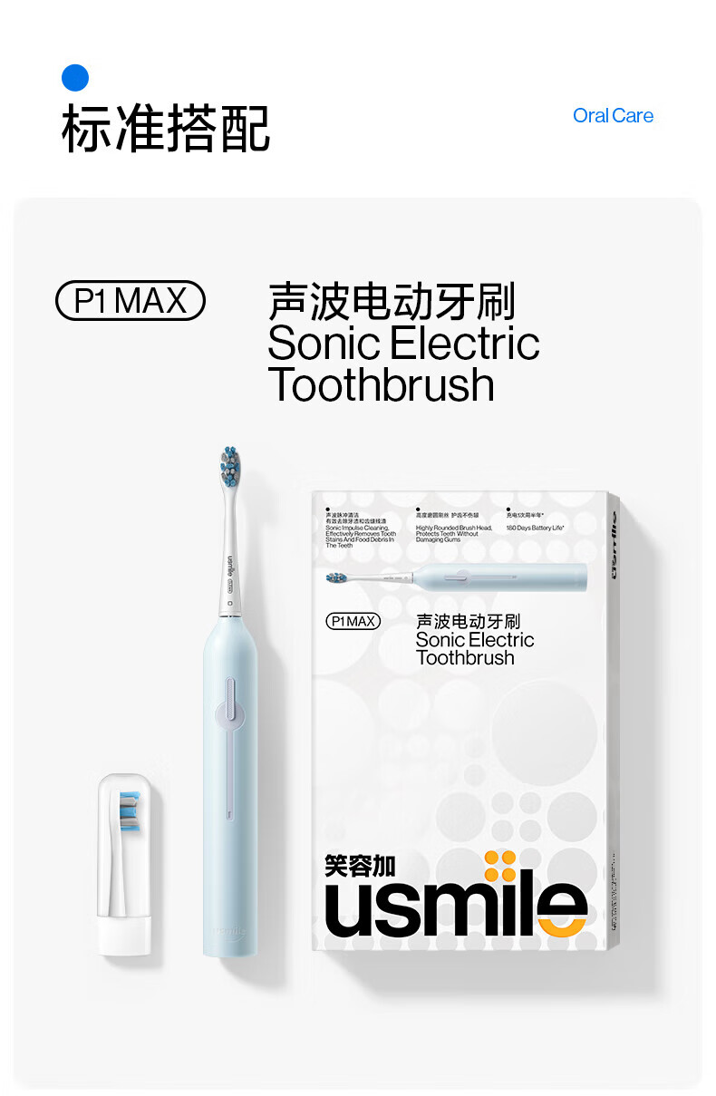 usmile笑容加电动牙刷 P1MAX精灵蓝 声波震动牙刷杜邦刷毛USB充电IPX7防水三档调节