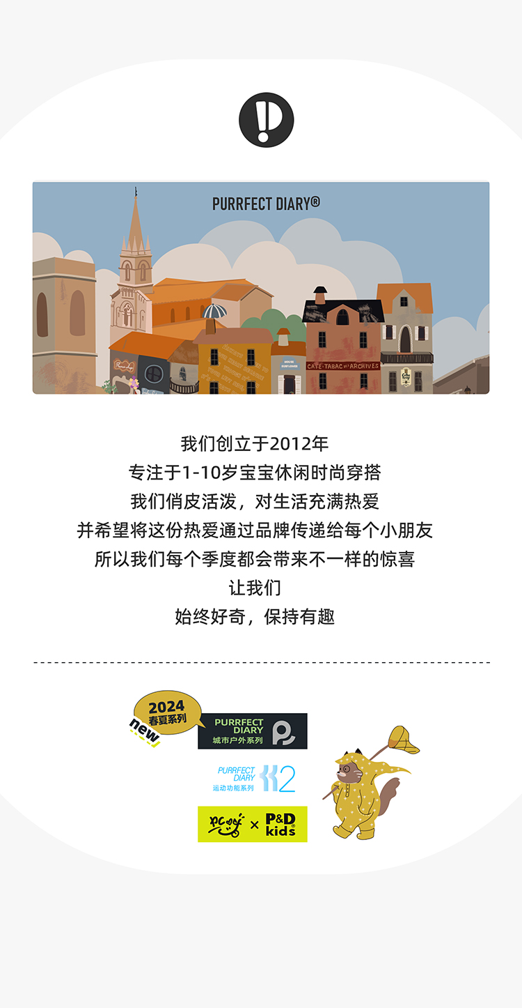 - Purrfect-Diary专注于贴近自然随性的穿着概念,轻奢平价的童装文化传播,在产品设计上更加注重婴童穿着的舒适性、安全性、更出众的国际化品牌,将欧美的育婴文化在中国进行深入的传播与推广。