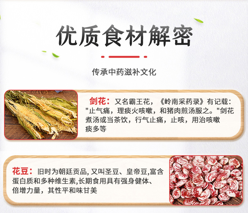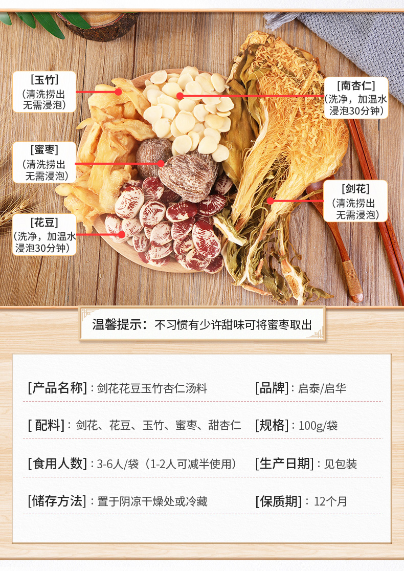 香港啟泰剑花花豆玉竹杏仁汤料100g广东煲汤材料炖料老火汤包 (4-5人食用)