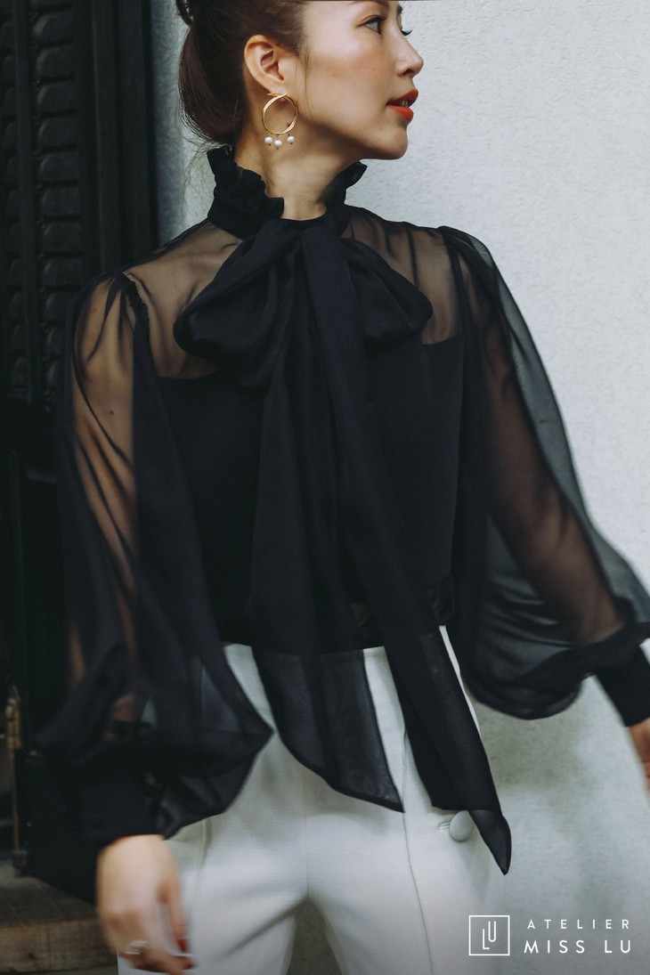 AtelierMissLu / Loulia-黑色拼纱蝴蝶结装饰衬衫上衣