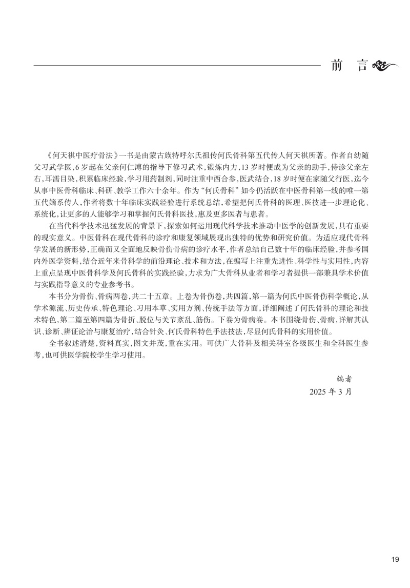 本书内容包括何氏骨科的历史渊源以及中医骨伤科学和骨病学所涉及的各具体疾病的诊治内容。本书内容主要分为骨伤和骨病两篇。骨伤篇主要包括骨折、脱位及筋伤三部分;骨病篇包括非化脓性关节炎、骨与关节化脓性感染、骨与关节结核、骨坏死疾患、代谢性骨病、先天性骨与关节畸形以及骨肿瘤等内容。本书详细地介绍了何氏骨科的渊源和特色,介绍了何氏骨科的正骨手法和推拿手法,以及何氏骨科的常用药物,对有治疗特色的骨折、脱位、关节紊乱及一些疑难骨病进行了详细的论述,书中还特别注重中医与西医相结合、内治与外治相结合,药物治疗与非药物治疗相结合。