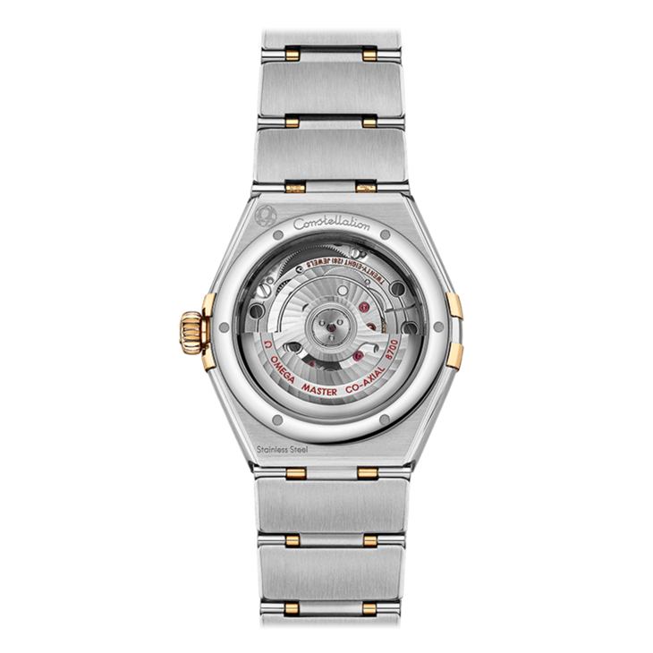 镜面材质 | 蓝宝石水晶玻璃 | 表盘 | 精钢黄色18K金与精钢表圈,星座系列特有的“托爪”设计。 香槟色太阳纹饰表盘饰有钻石小时刻度,6点钟位置设有日历窗口。指针、欧米茄品牌标识、星座徽标以及钻石托槽亦以Sedna® 18K黄金打造而成。 透底 |
