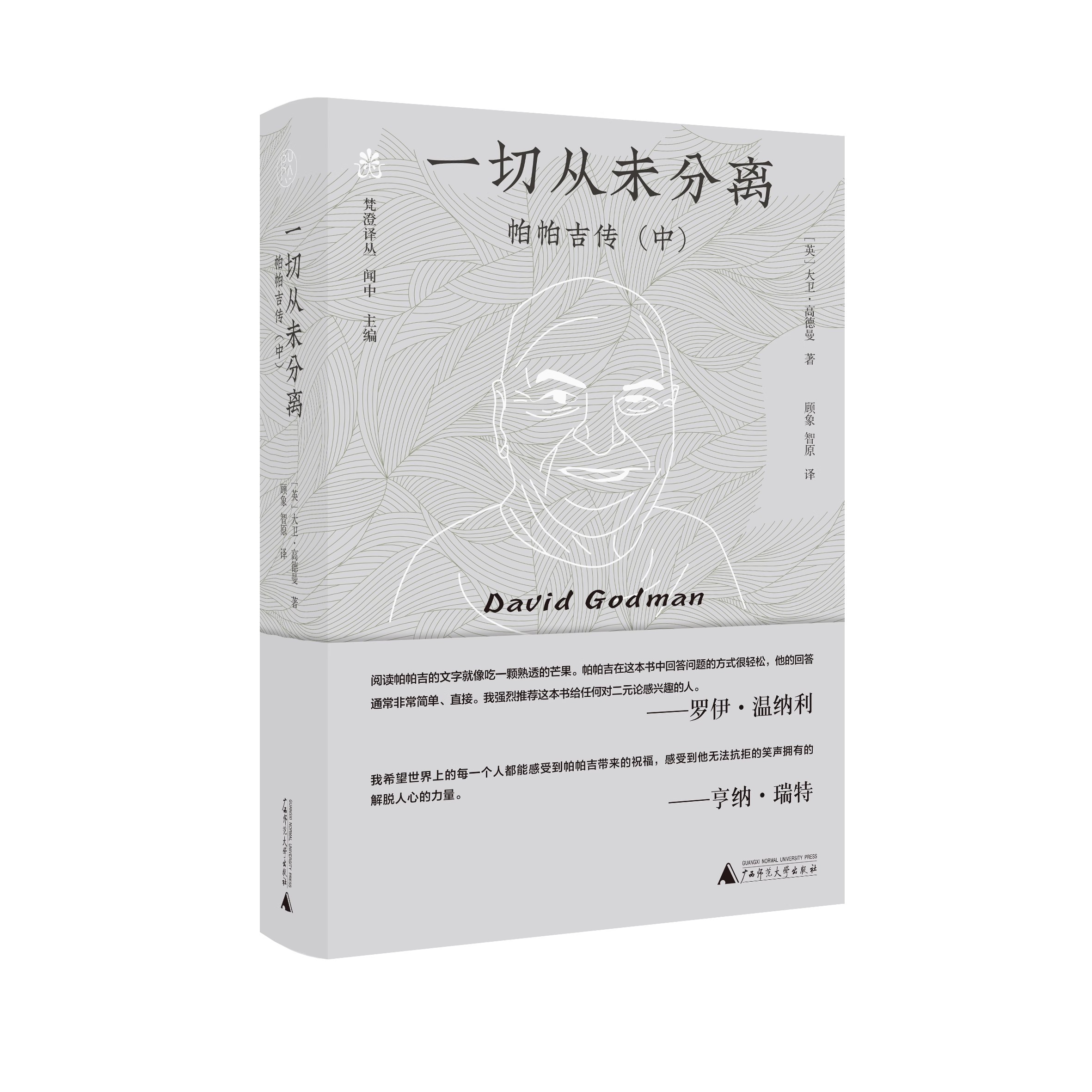 《帕帕吉传》通过帕帕吉这一传奇式的人物的生平故事,描写印度文化、思想和修为等,借由他与众多的欧美人士的接触、多次访问欧美各国的经历,在丰富的细节上使读者身临其境,切实体会印度智慧的独到之处及其对世界的影响和启发。其中,《一切从未分离 帕帕吉传》(中)主要记述了帕帕吉1966年退休后游历印度及出访欧美的经历,描绘出一幅广阔的跨文化画卷,主要内容包括哈德瓦、瑞诗凯诗,海外旅行(1971—1974)等章节。