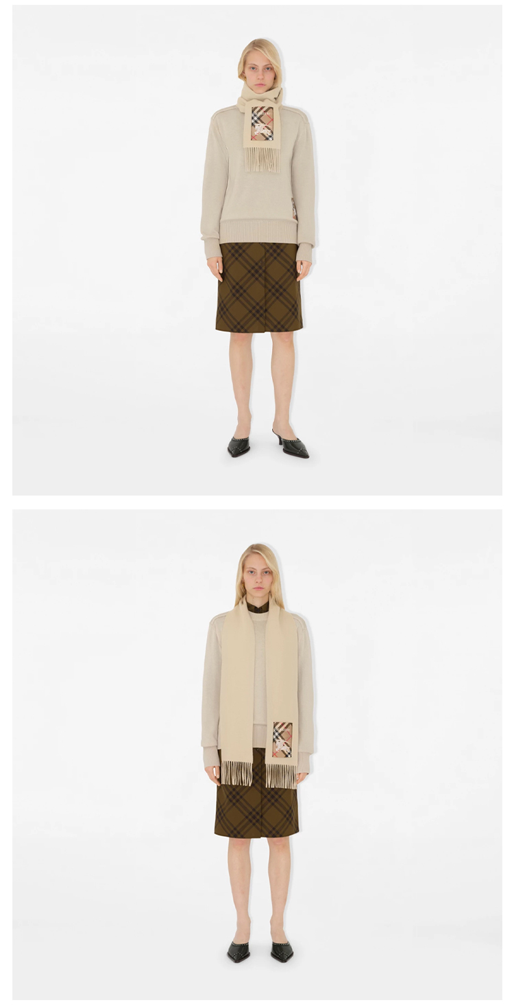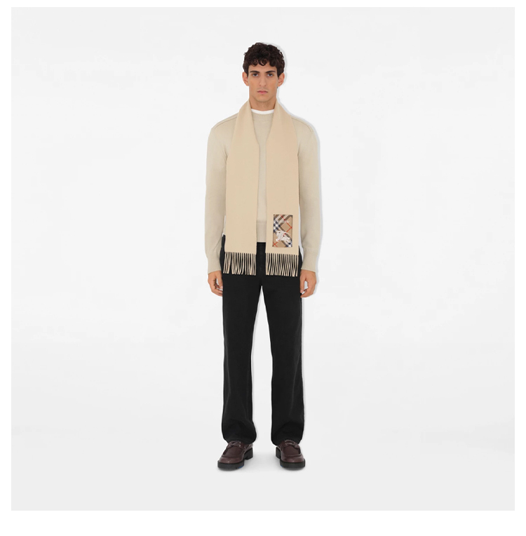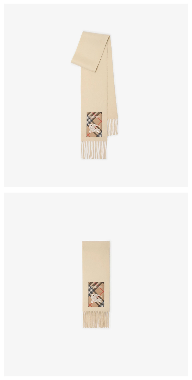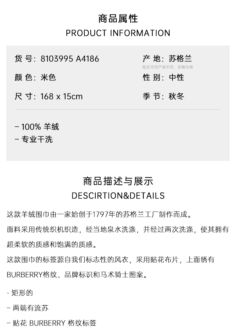 【二】BURBERRY 巴宝莉 中性马术骑士徽标格纹标签羊绒围巾 米色 8103995 A4186