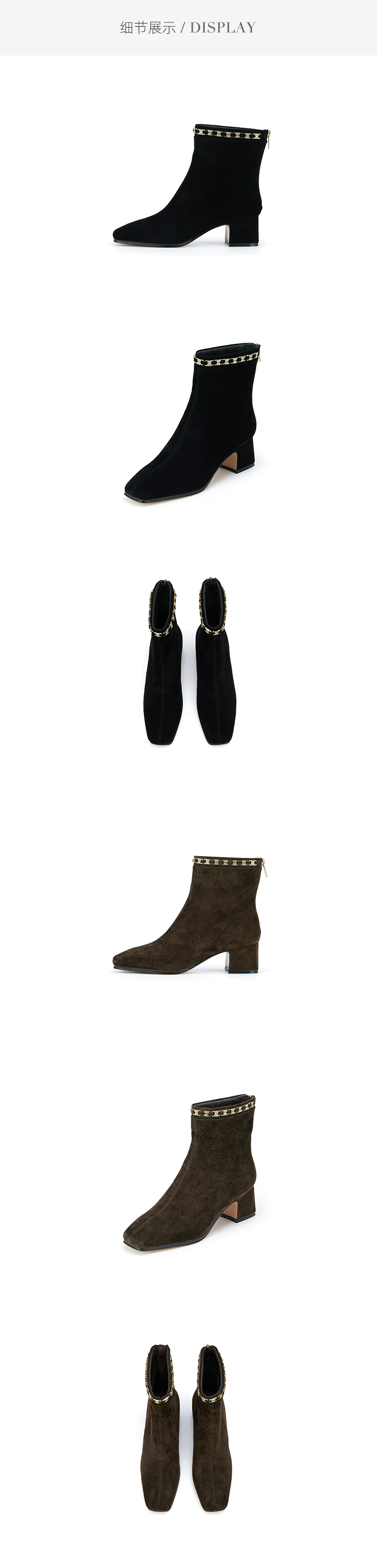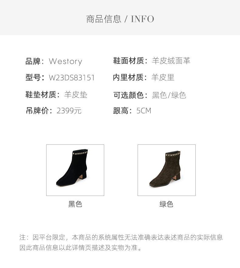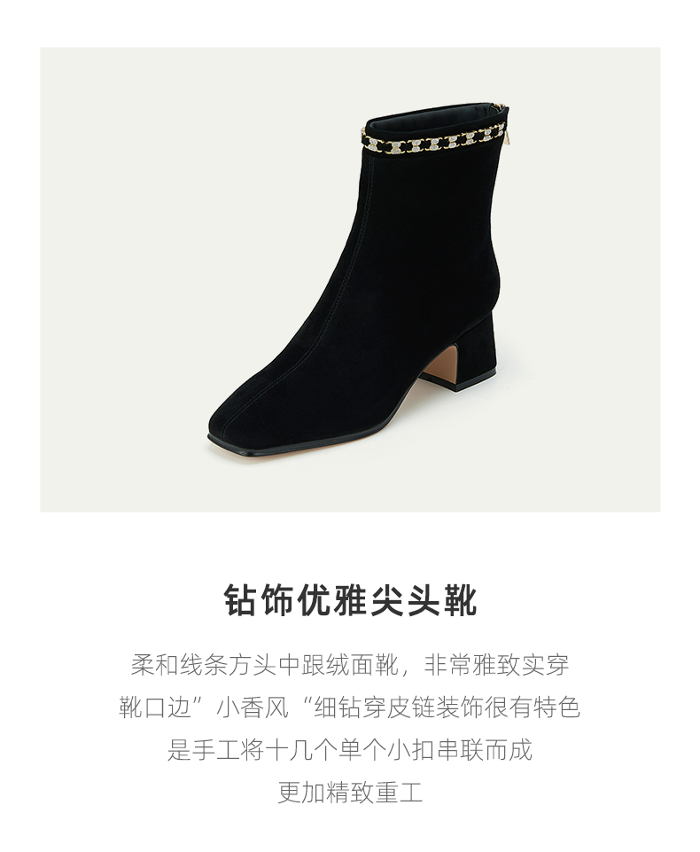 westory2023年秋季新品钻饰尖头靴方头中跟绒面靴时尚靴W23DS83151