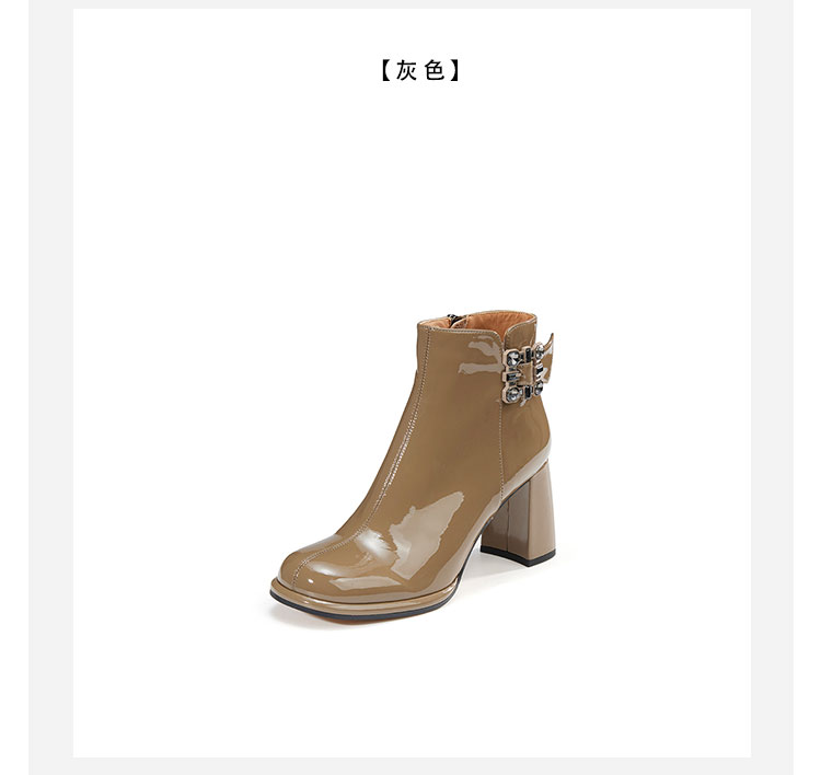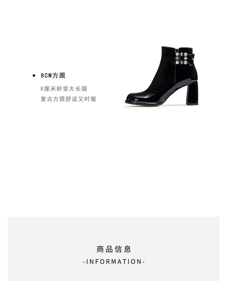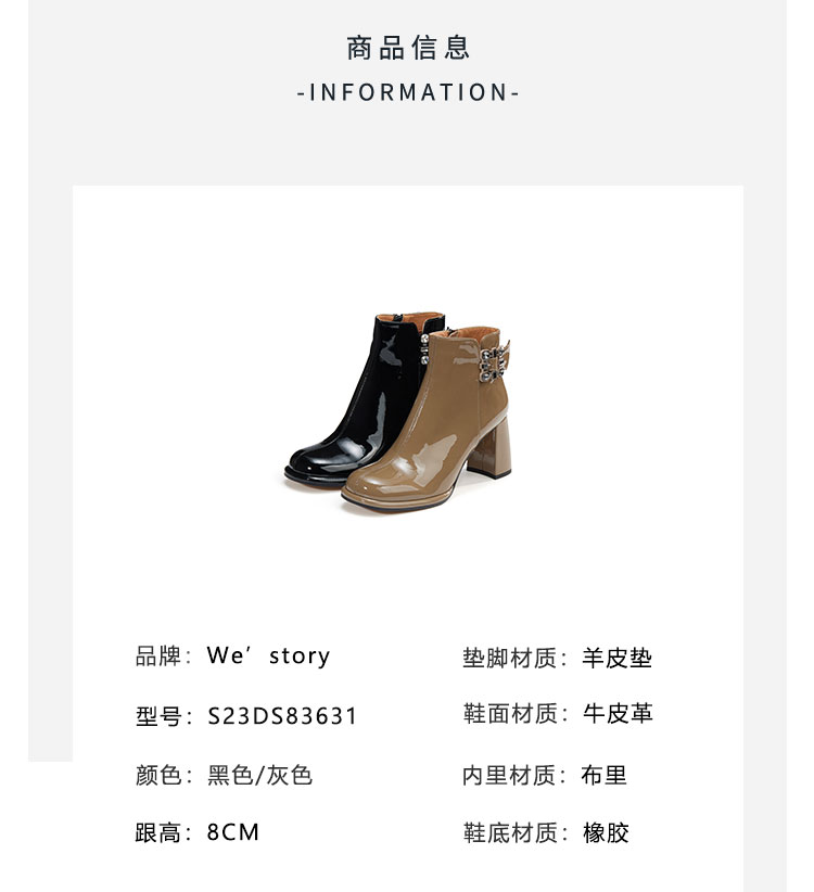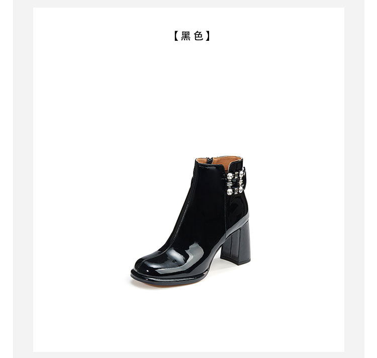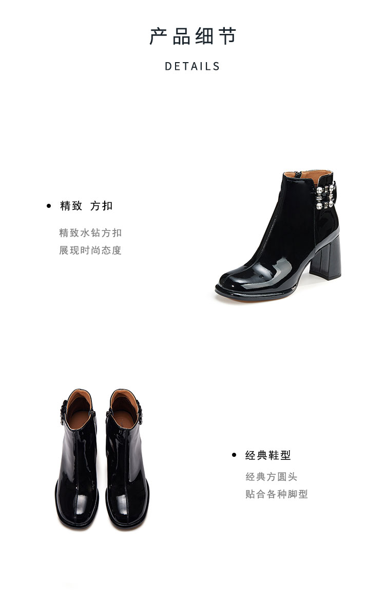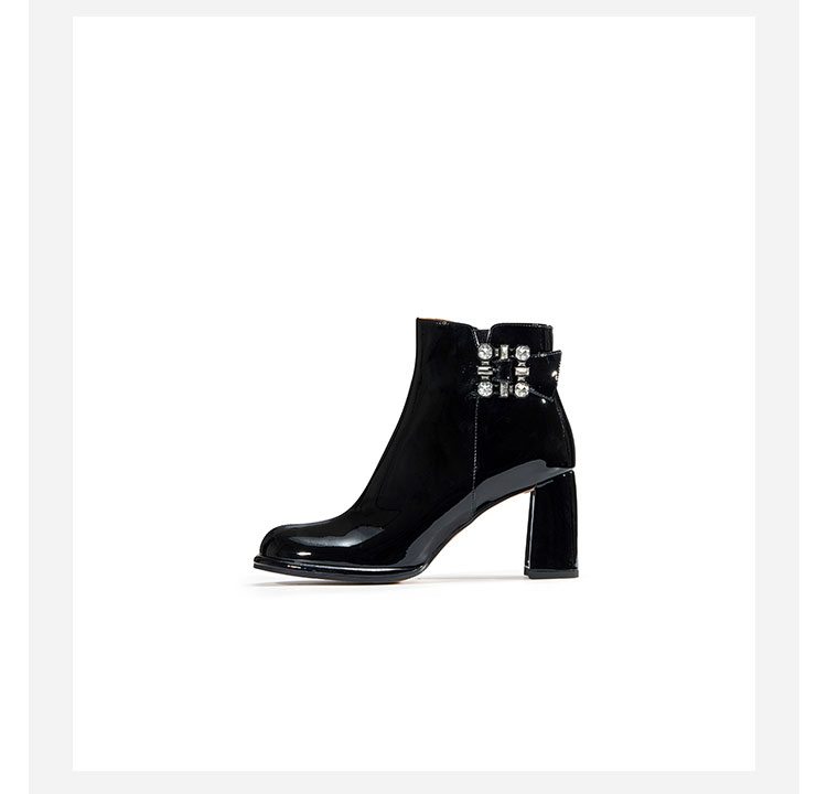 WESTORY2023年冬季新款圆头粗高跟靴亮面时髦大钻扣时装靴百搭短靴女S23DS83631