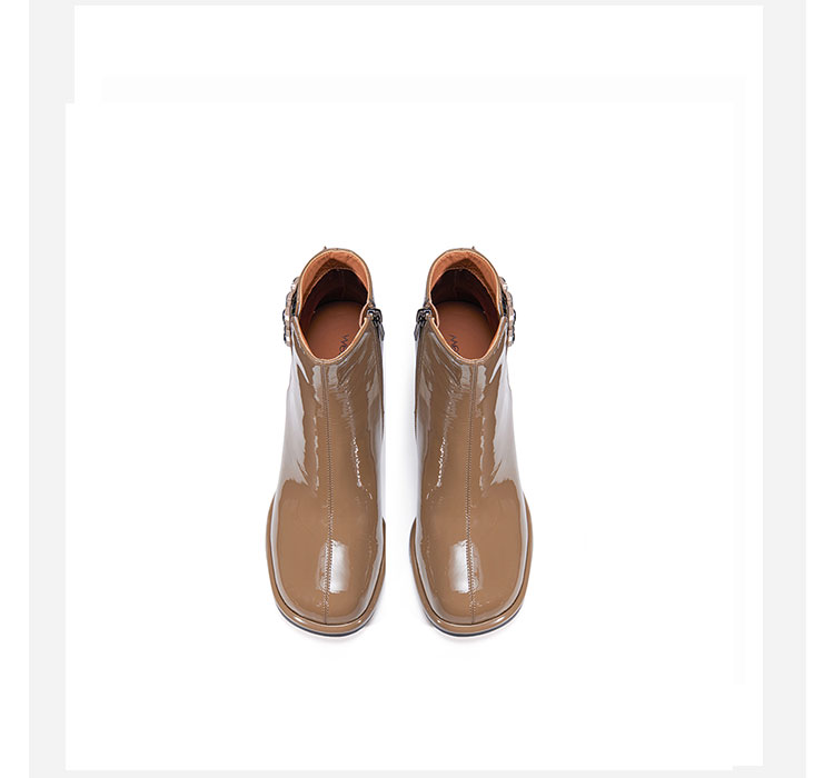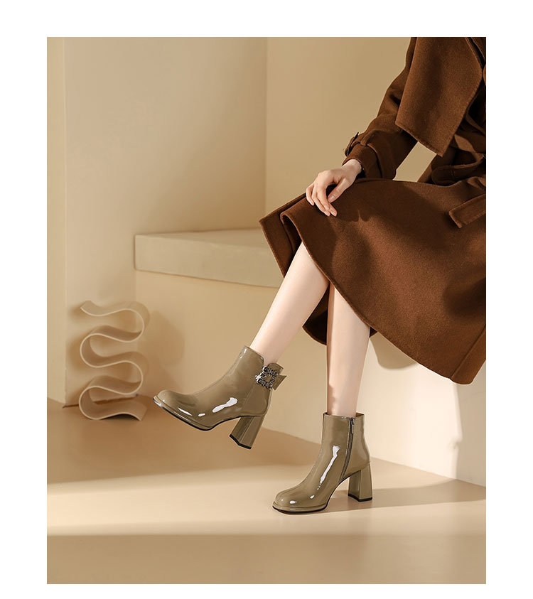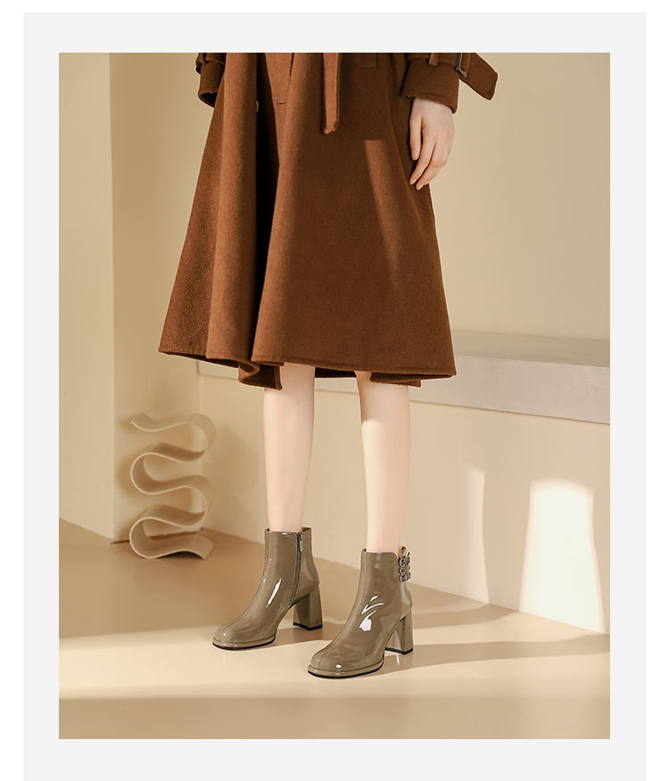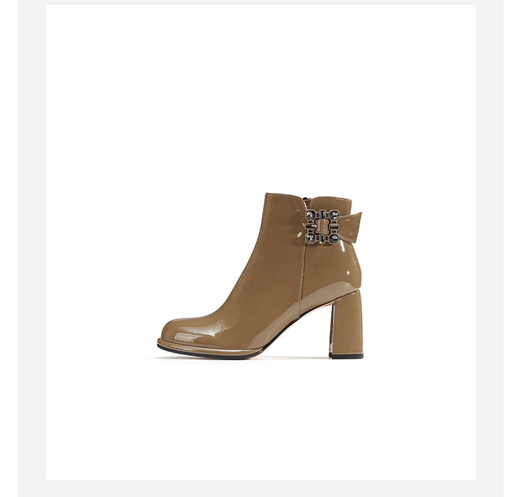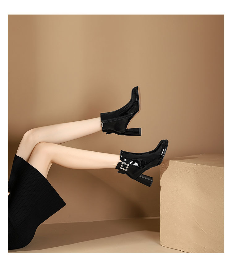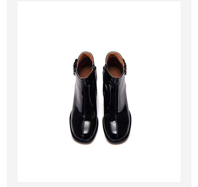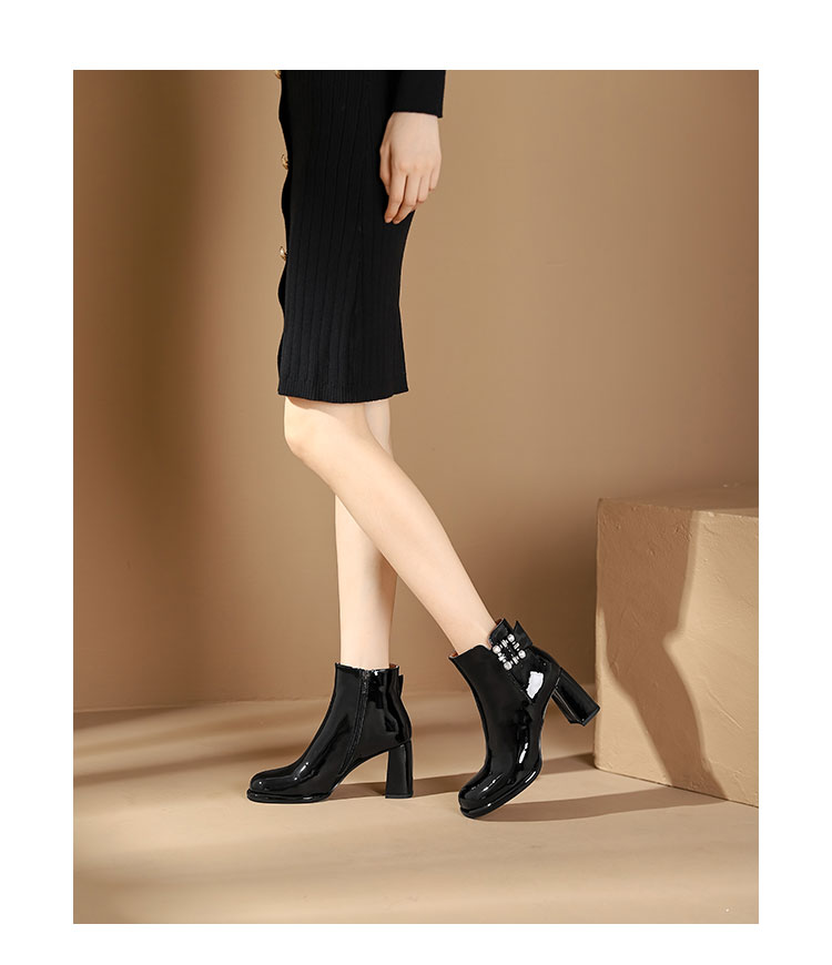 WESTORY2023年冬季新款圆头粗高跟靴亮面时髦大钻扣时装靴百搭短靴女S23DS83631