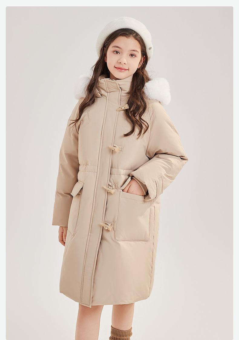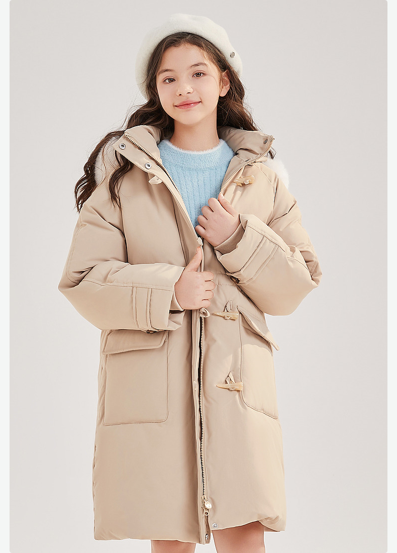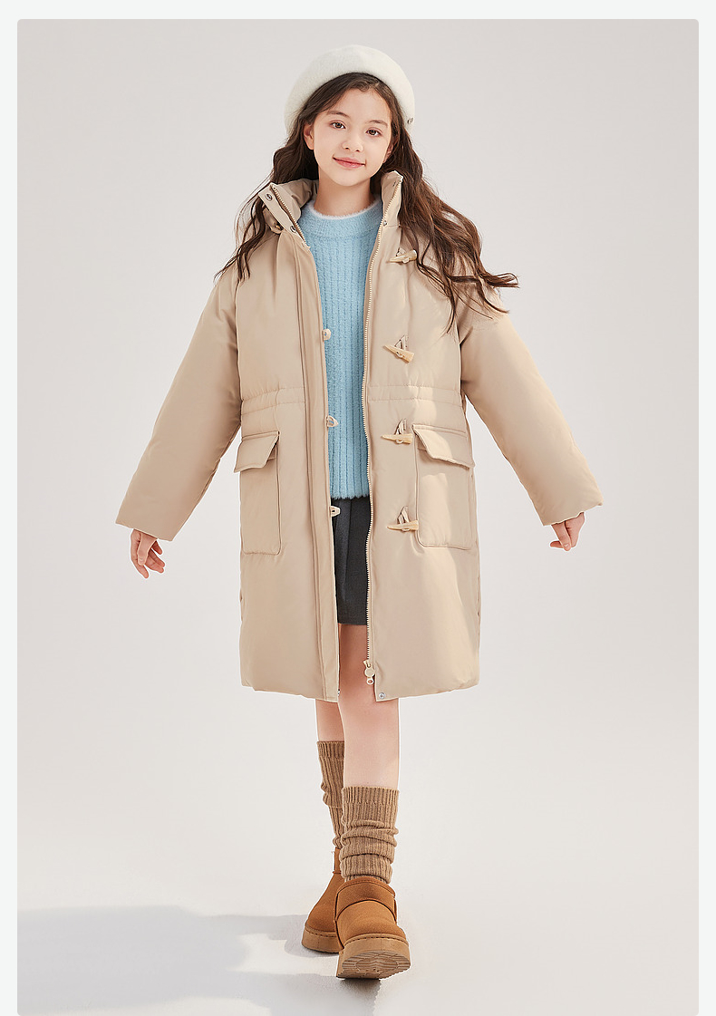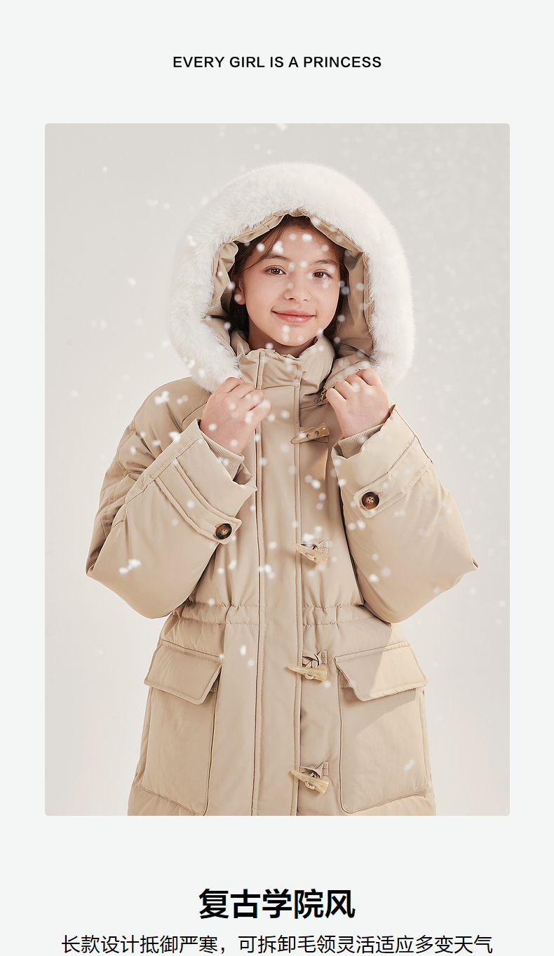 笛莎Deesha青少年女童羽绒服2024冬季新款复古学院风中长款连帽羽绒服