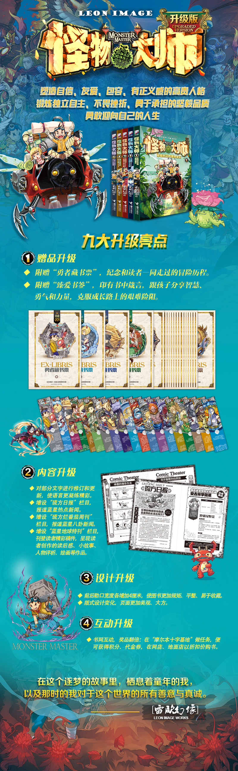 “怪物大师升级版”系列已成为中国孩子的正能量人生励志教科书。 该系列以布布路、赛琳娜、饺子和帝奇——四位怀揣梦想的少年为核心,讲述他们一步步成长为*秀的怪物大师的历练之路,并通过四大主人公传递出四大正能量生命气质,帮助孩子塑造高*人格与品质。