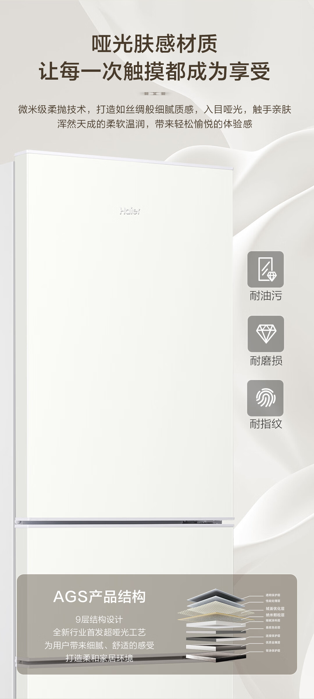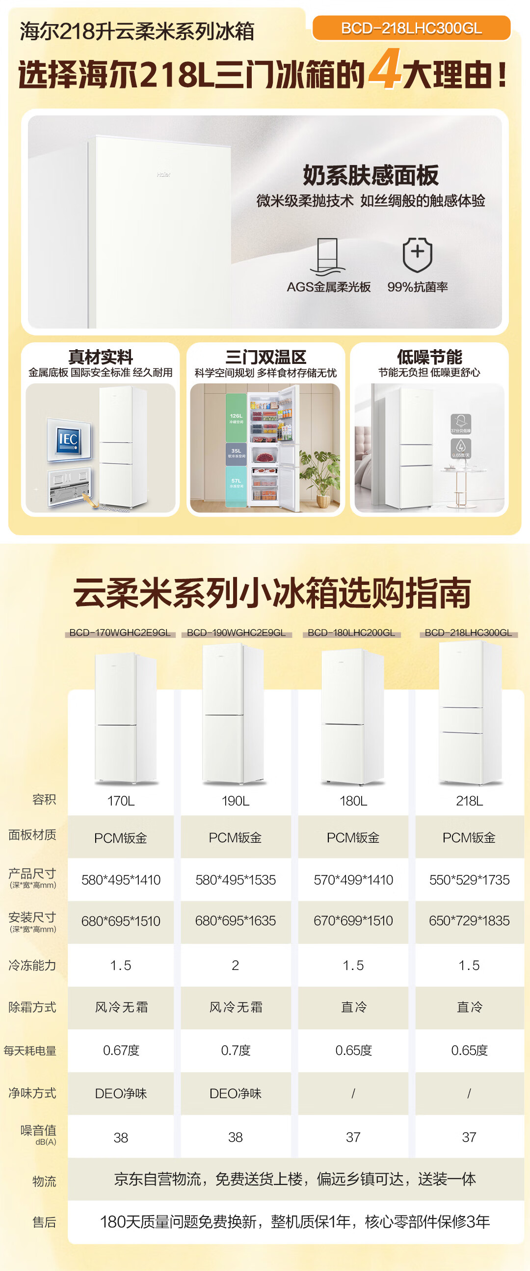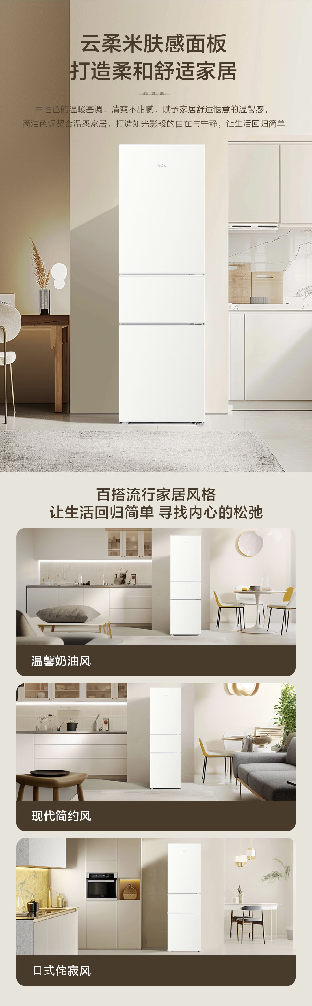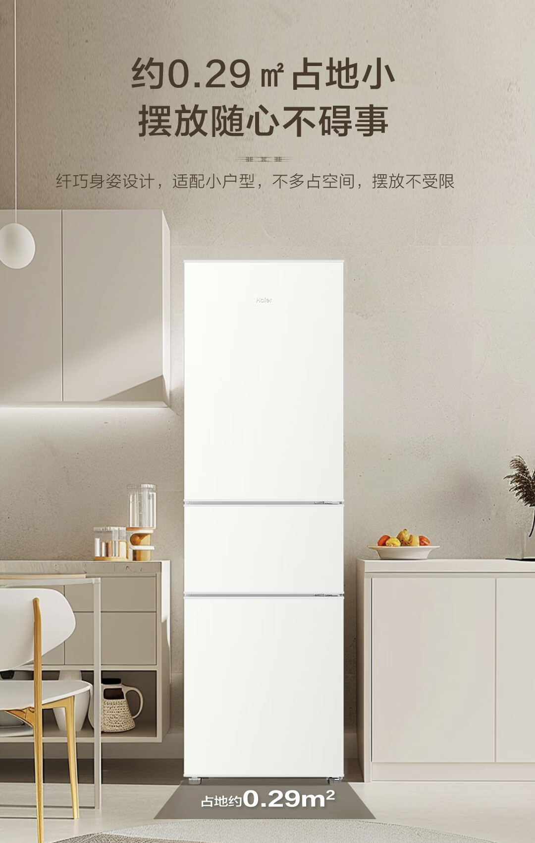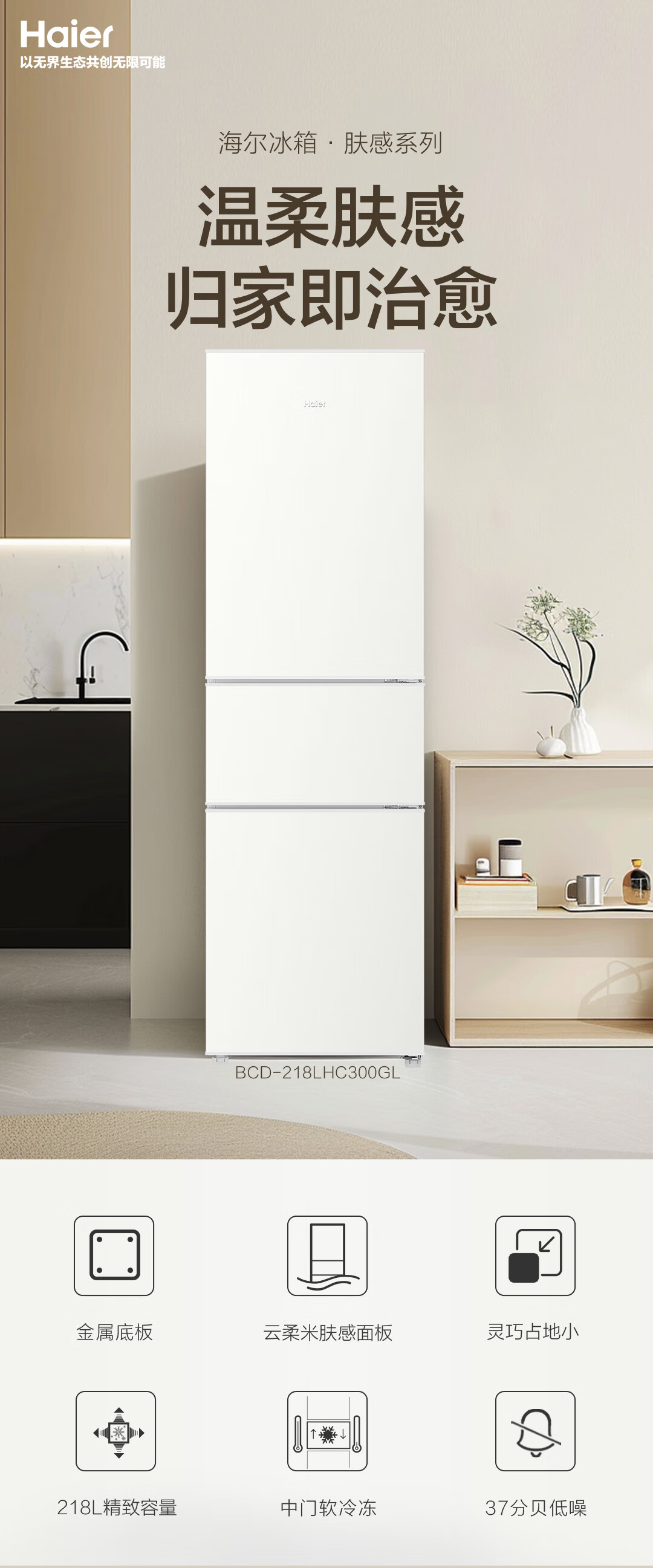 海尔(Haier)218升 肤感系列 三门冰箱 节能省电 小户型迷你 家用宿舍租房 中门软冷冻BCD-218LHC300GL