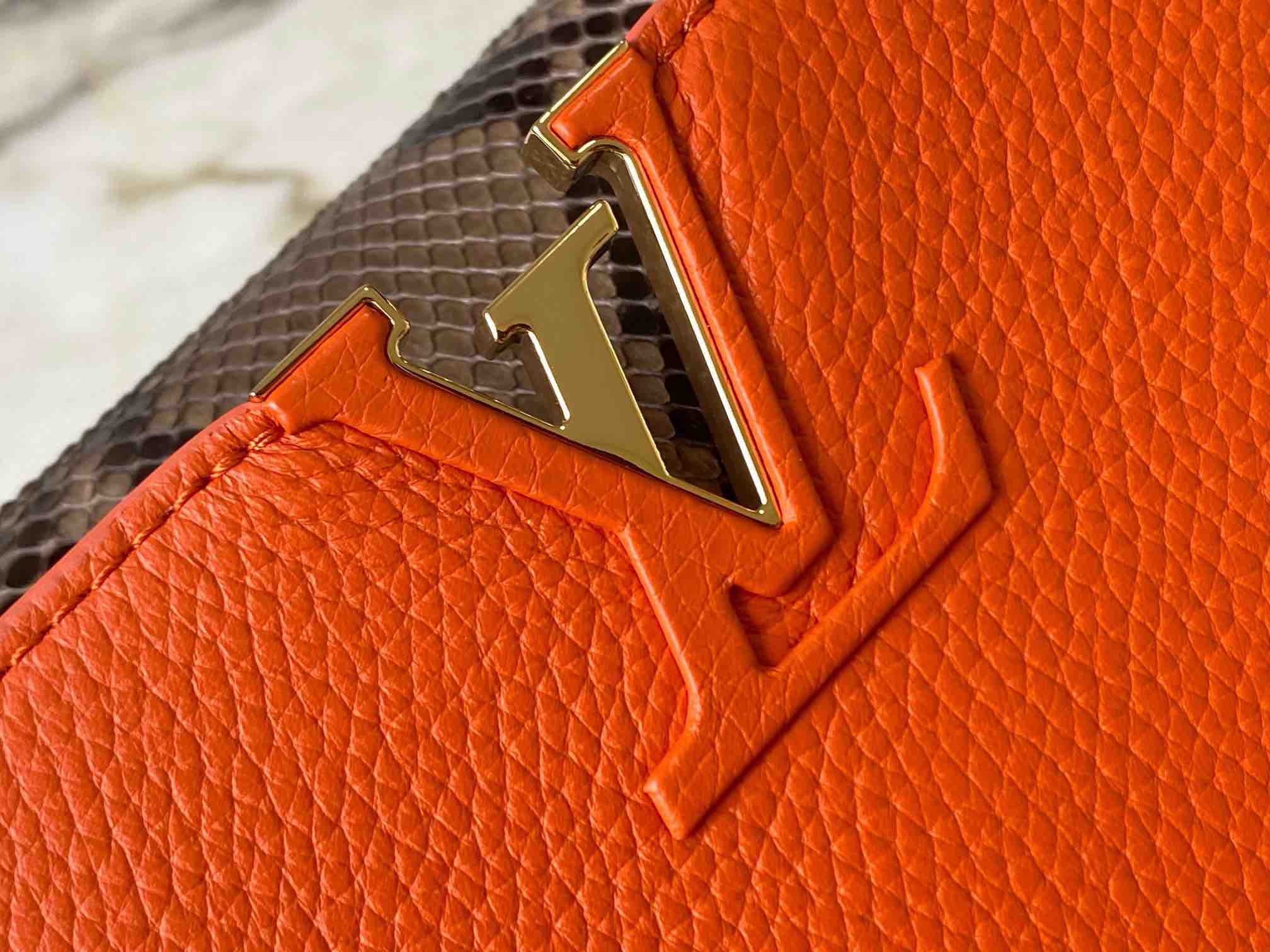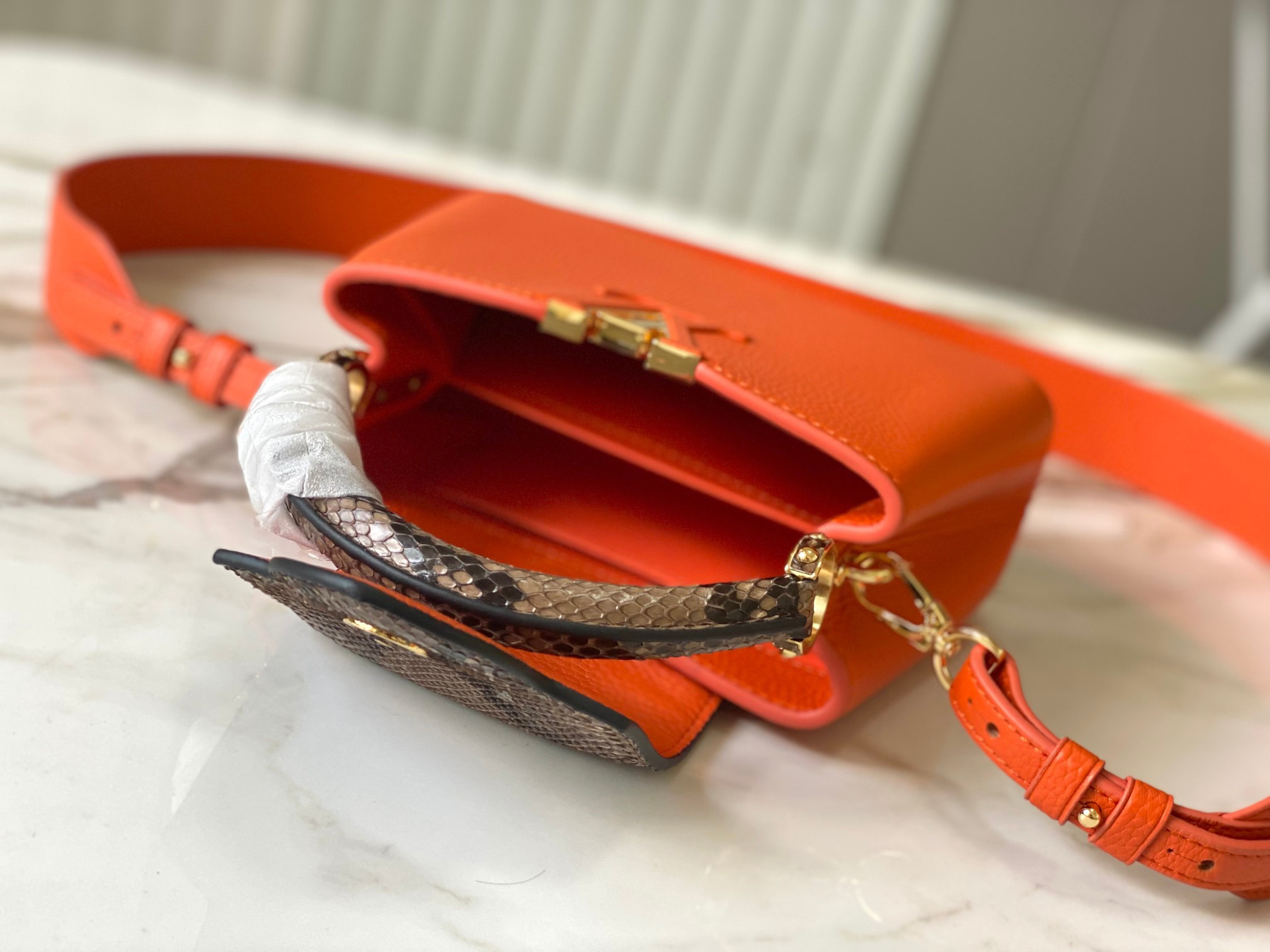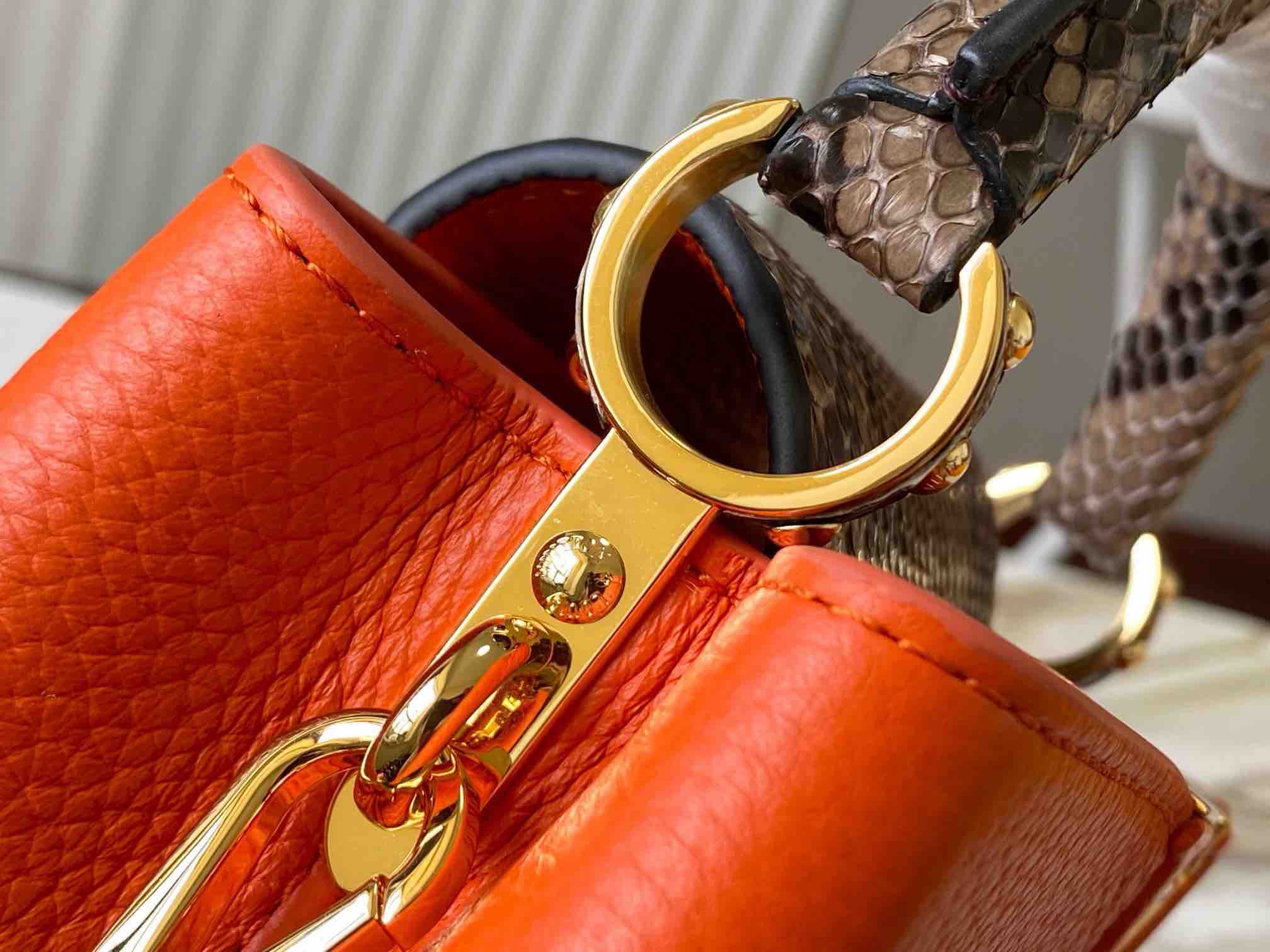 秋冬特惠💰1600 渠道级LV te级LV 全套包装 N80007/M48865艳橙 本款 Capucines 迷你号手袋以全粒面 Taurillon 皮革塑造精巧构型 搭配ding部手柄、两式翻盖及莹泽蟒蛇皮勾勒的 标识 成就昼夜皆宜的华美之选 可拆卸宽肩带令肩背或斜挎展露前卫气息 Size: 21 *14 * 8 cm