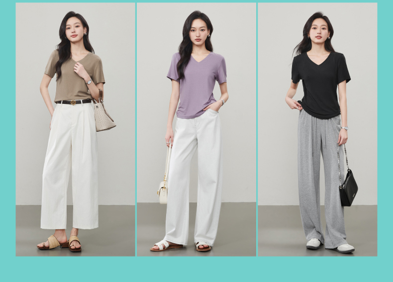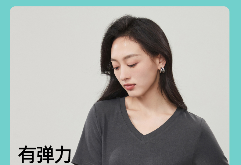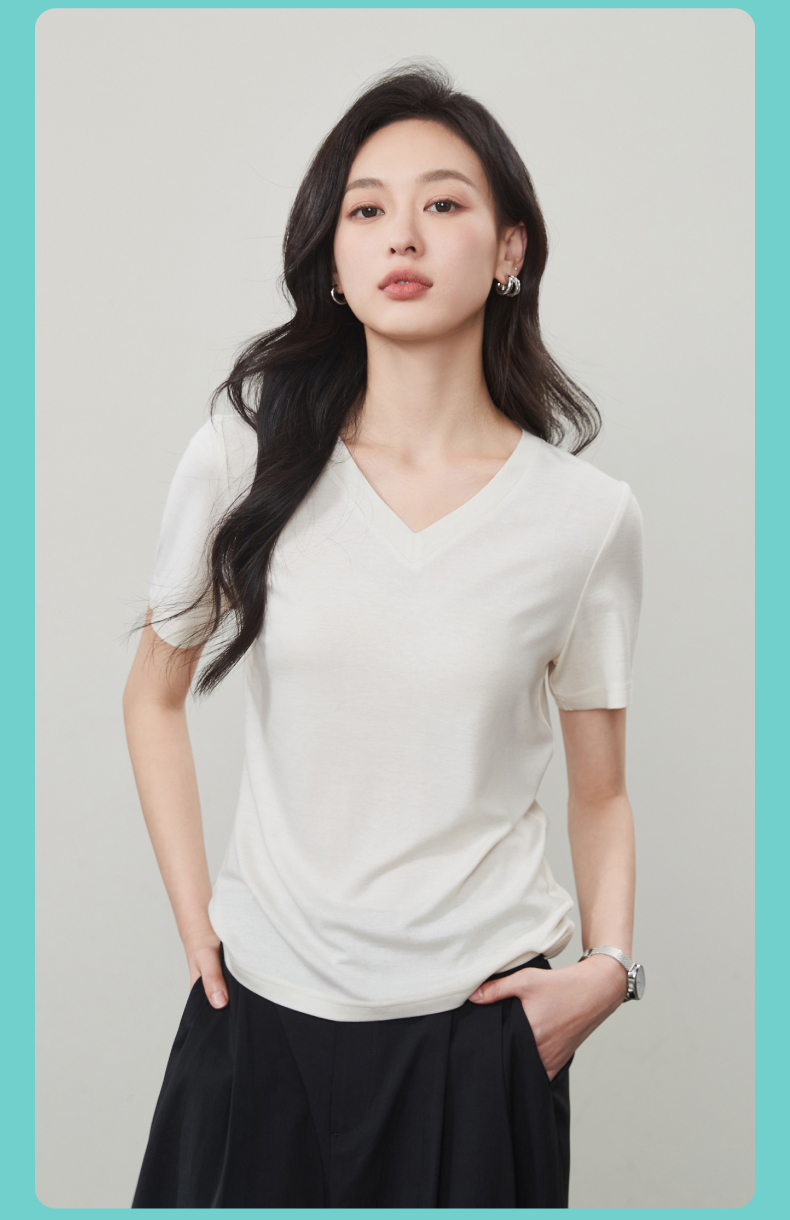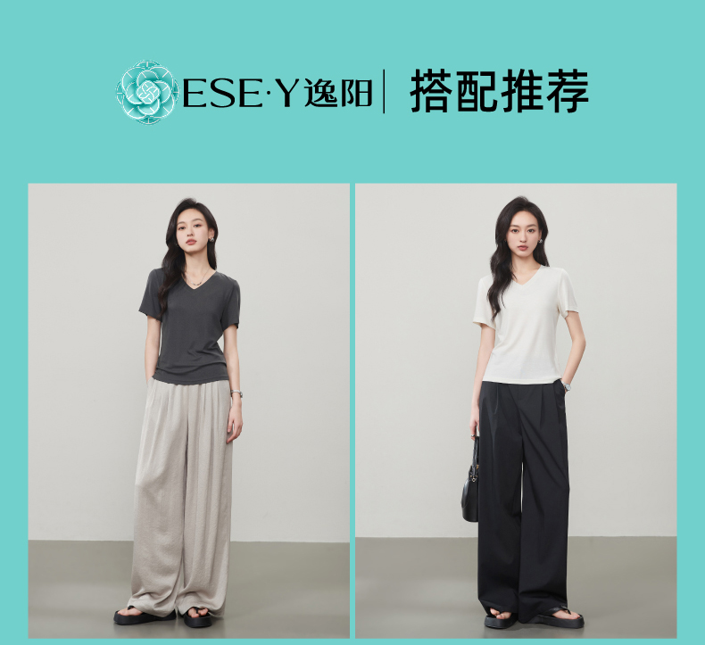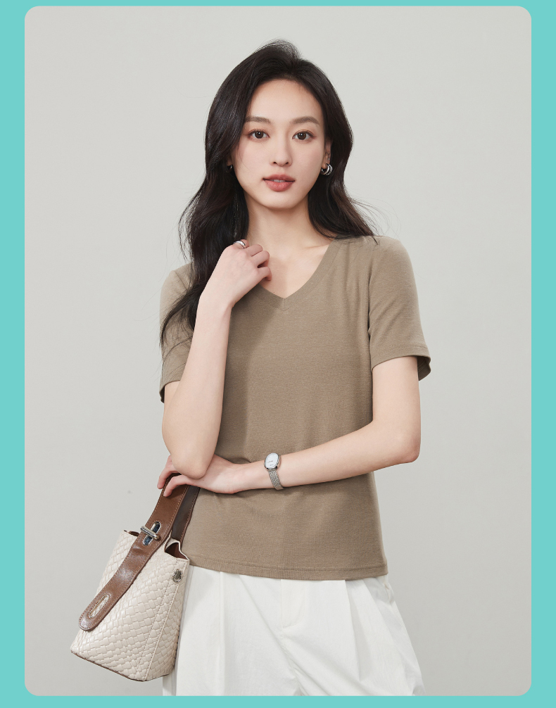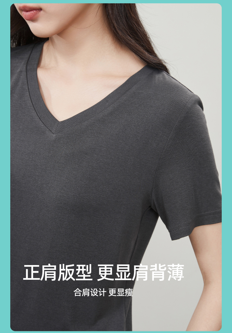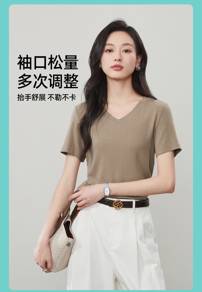【醋酸面膜V领T恤】逸阳夏新款裸感显瘦轻薄正肩短袖上衣5141