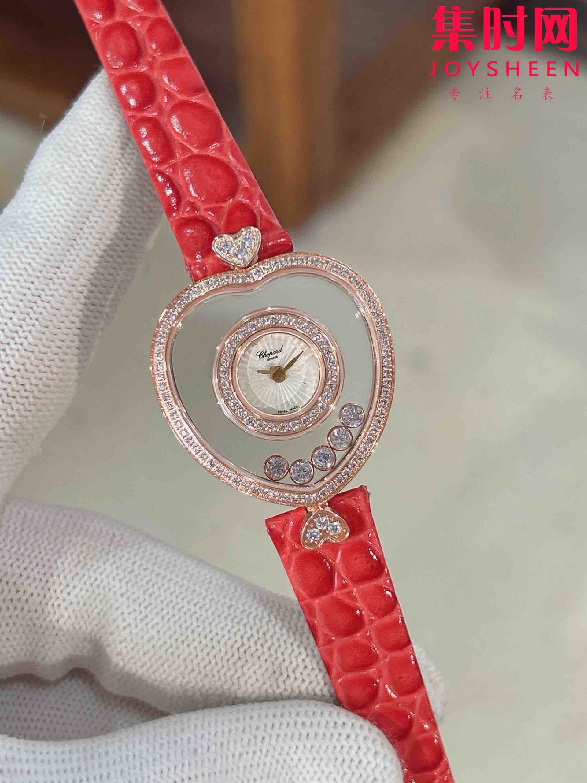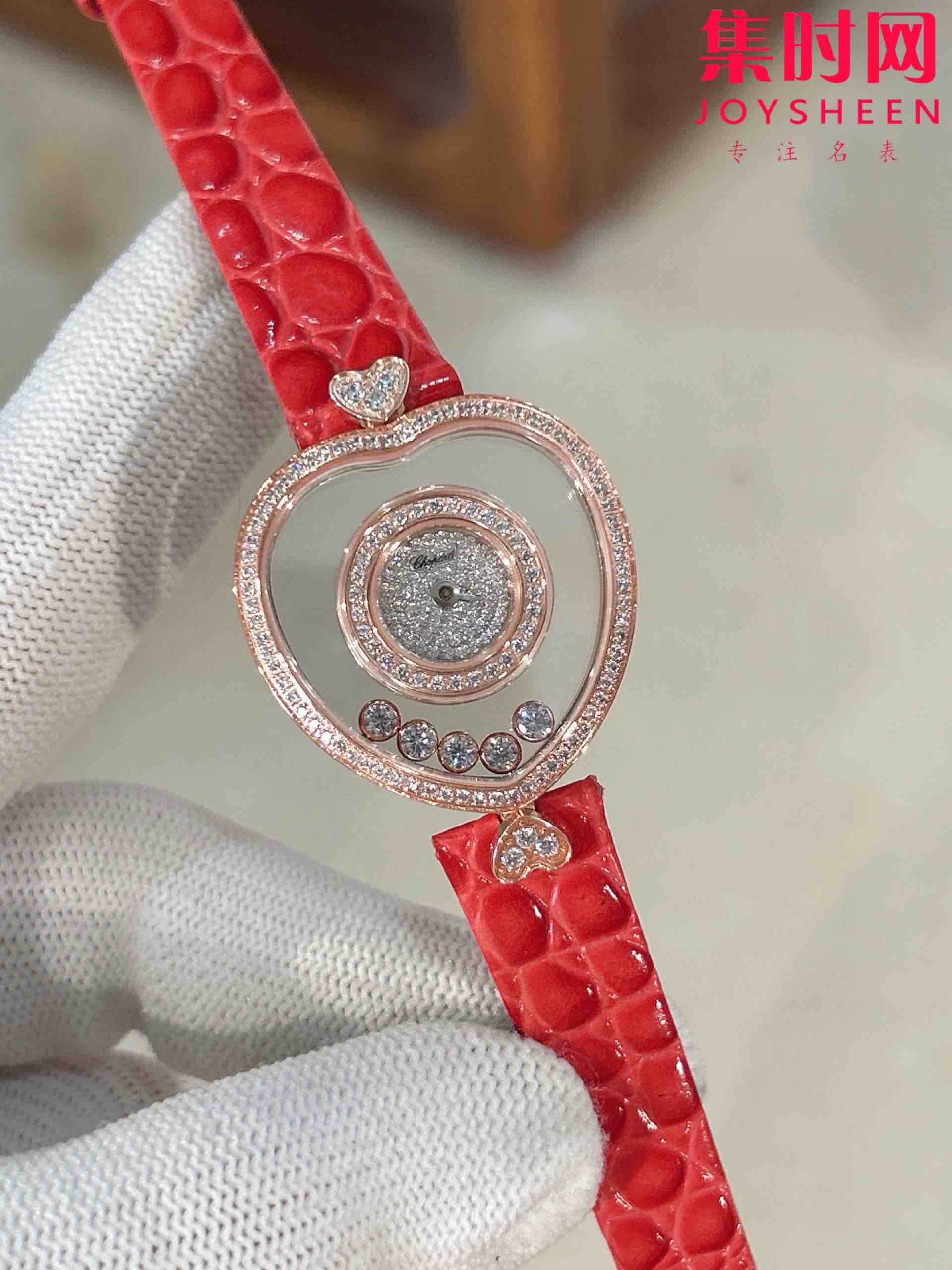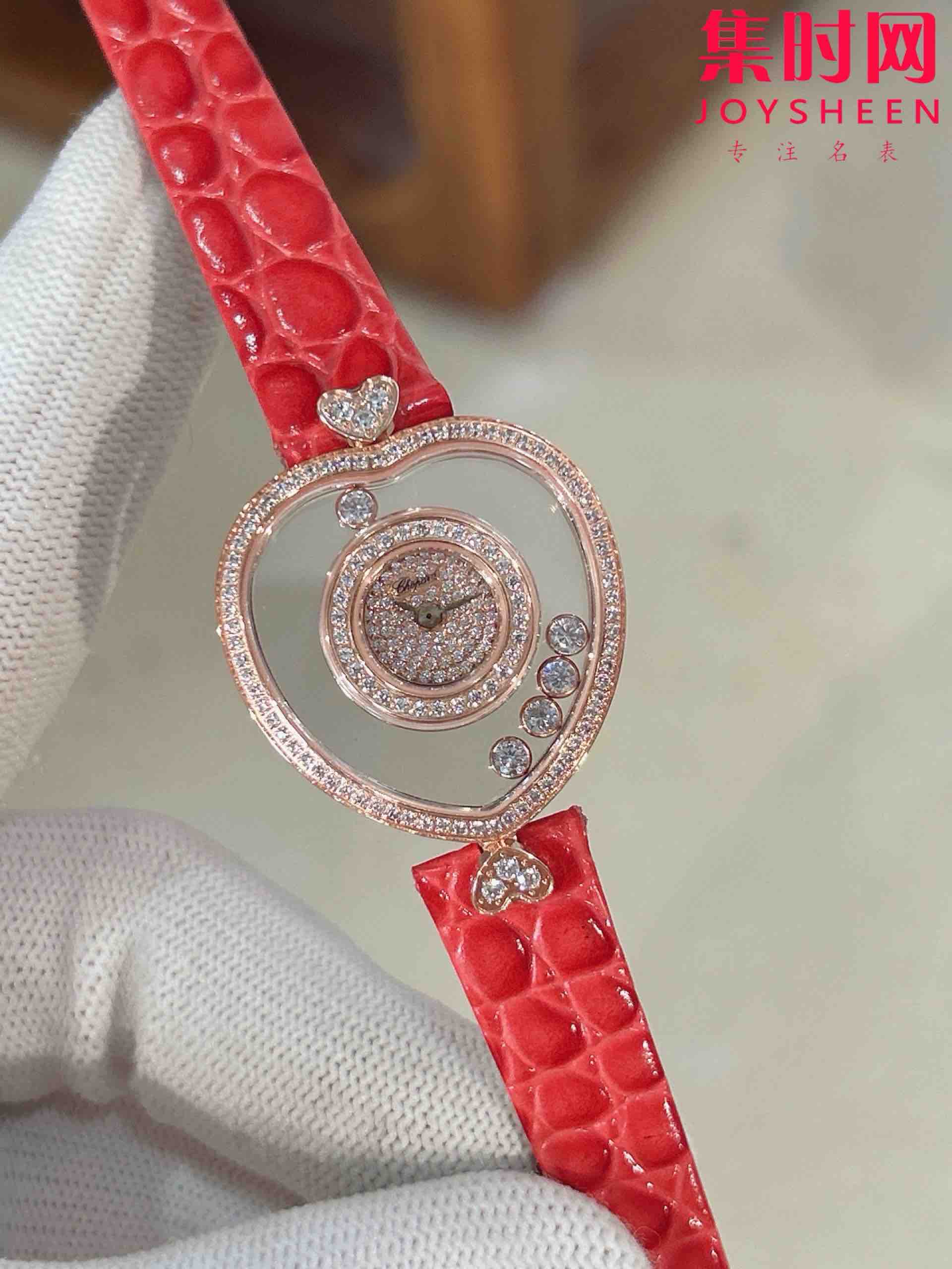 萧邦经典Happy diamonds系列 新款女款爱心心形快乐钻系列 女士腕表 表径26mm 心形钻圈表盘 瑞士石英机芯 镜面内五颗快乐钻自由转动 活动钻石围绕表盘回旋起舞 制作精巧的表壳玩味透明概念 chopard家标志性的Happy钻石在两片蓝宝石水晶玻璃 形成的空间内自由滑动 充分展现自由和欢快的感觉 表壳ding端与底端各缀有一粒单颗心形钻石 树叶形指针 较小的同心圆为珍珠母贝质地 呈圆满的球型 两个同心圆环上皆全手工镶有钻石 五颗灵动钻石如悬空漂浮一般 细节见真知