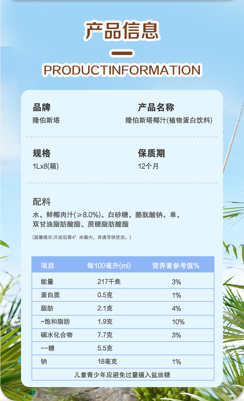 隆伯斯塔椰汁 1L/瓶(1L*8瓶)