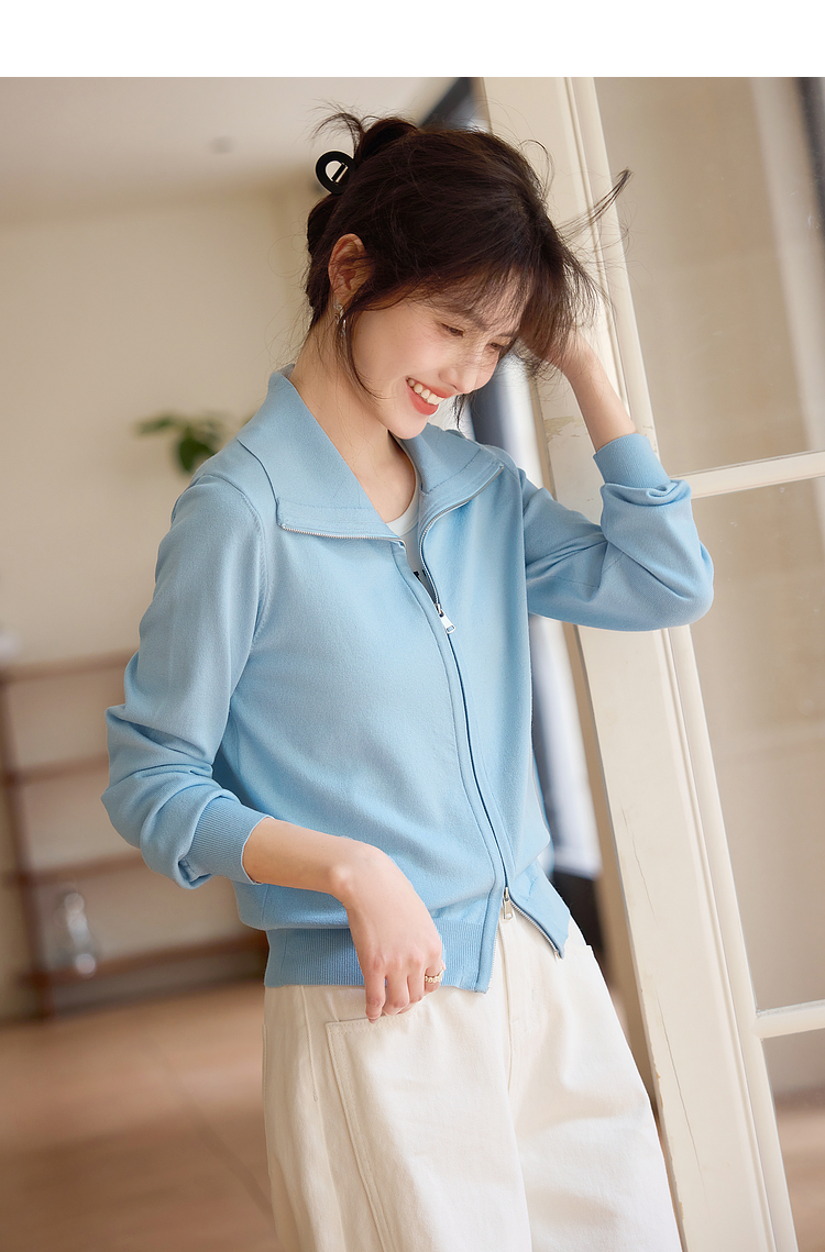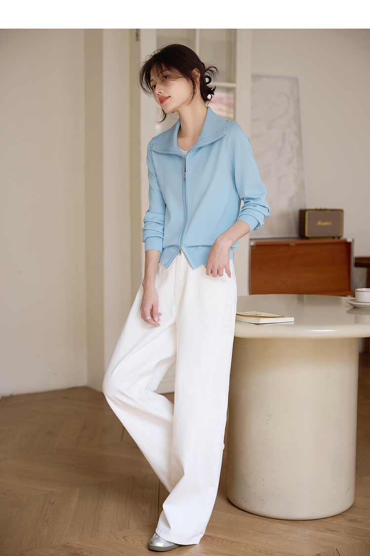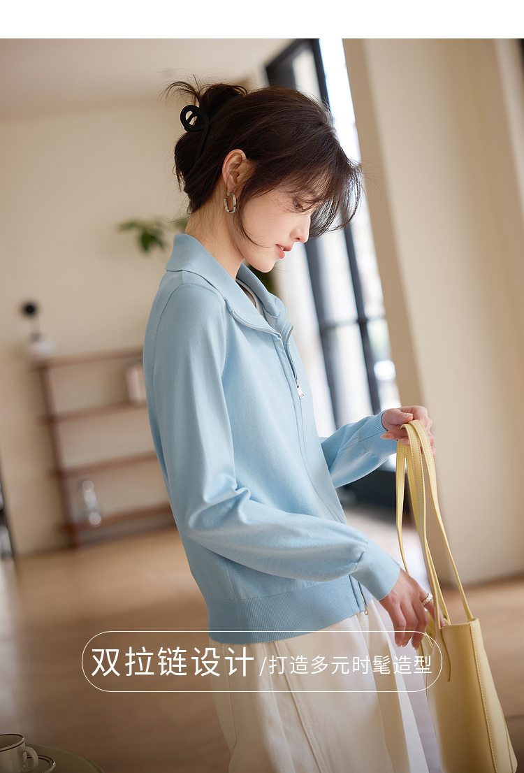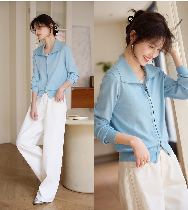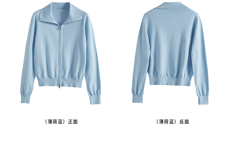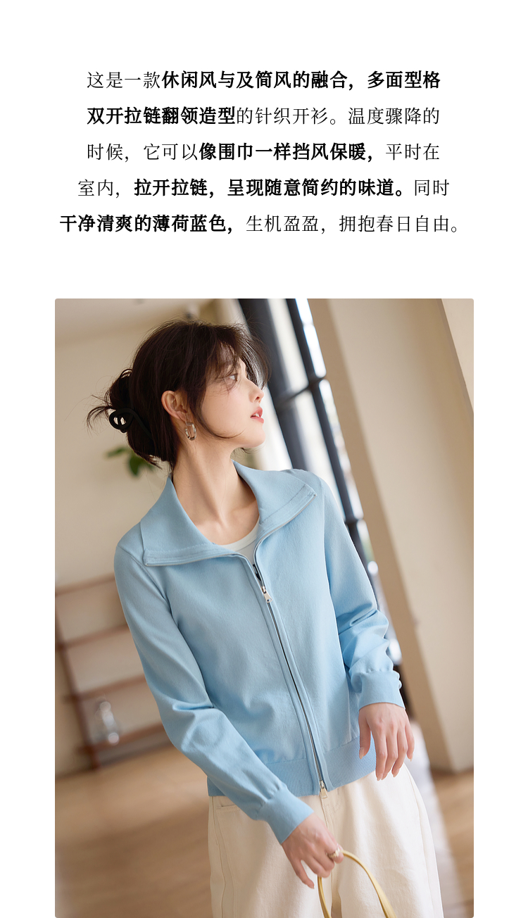 【专属特价】熙世界薄荷蓝双拉链翻领针织衫女设计感休闲开衫外套2025春装新款
