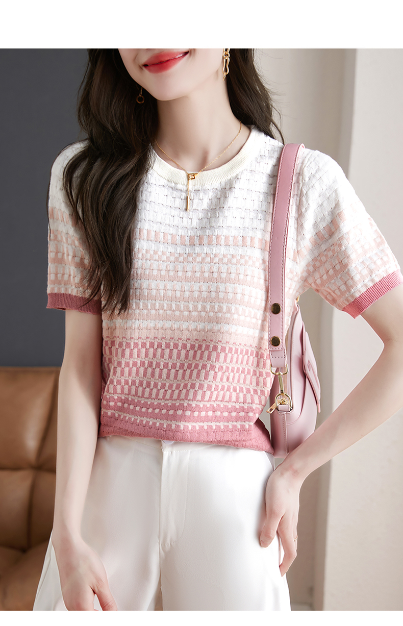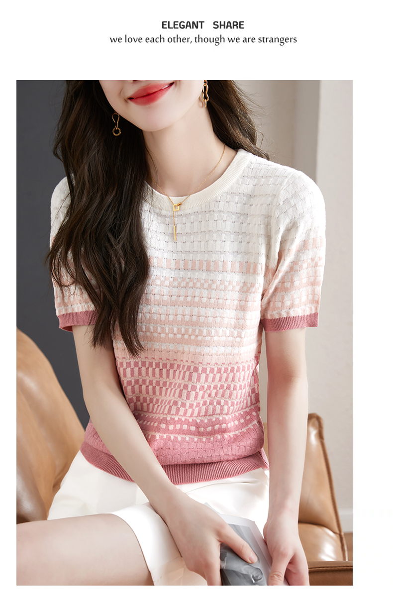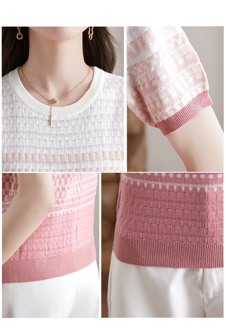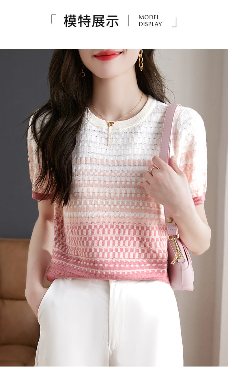 镂空显瘦短袖条纹针织衫,夏季新款短款百搭上衣薄半袖小衫CC-MLX367