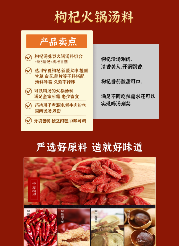 产品规格:228g枸杞清汤*2袋+225g枸杞番茄*1袋+80g麻婆豆腐2袋+120g蘸料随机发1袋