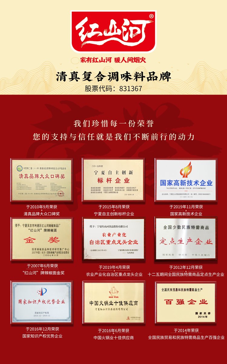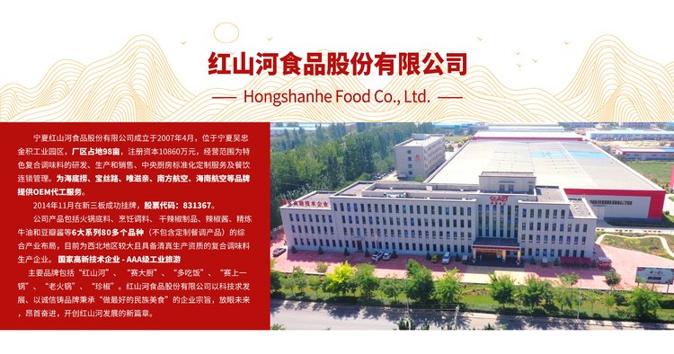 ❶ 生产实力:为海底捞、宝丝路、唯滋亲、南方航空、海南航空等品牌提供OEM代工服务;❷ 公司优势:2014年11月在新三板成功挂牌,股票代码:831367。专注复合调味料的研发、生产和销售、中央厨房标准化定制服务及餐饮连锁管理;❸ 公司实力:目前为西北地区较大且具备清真生产资质的复合调味料生产企业,是国家高新技术企业-AAA级工业旅游企业;❹ 科研背书:依托院校合作,37项专利技术保障加工生产全流程标准化。