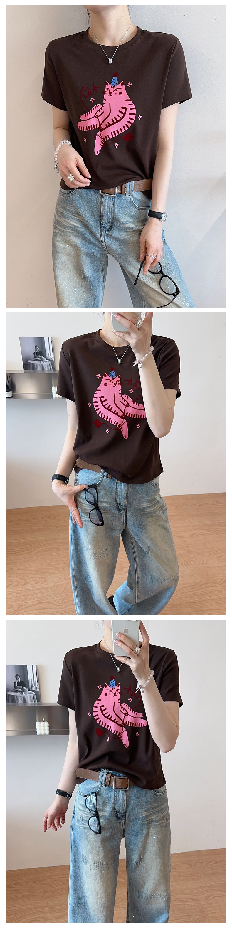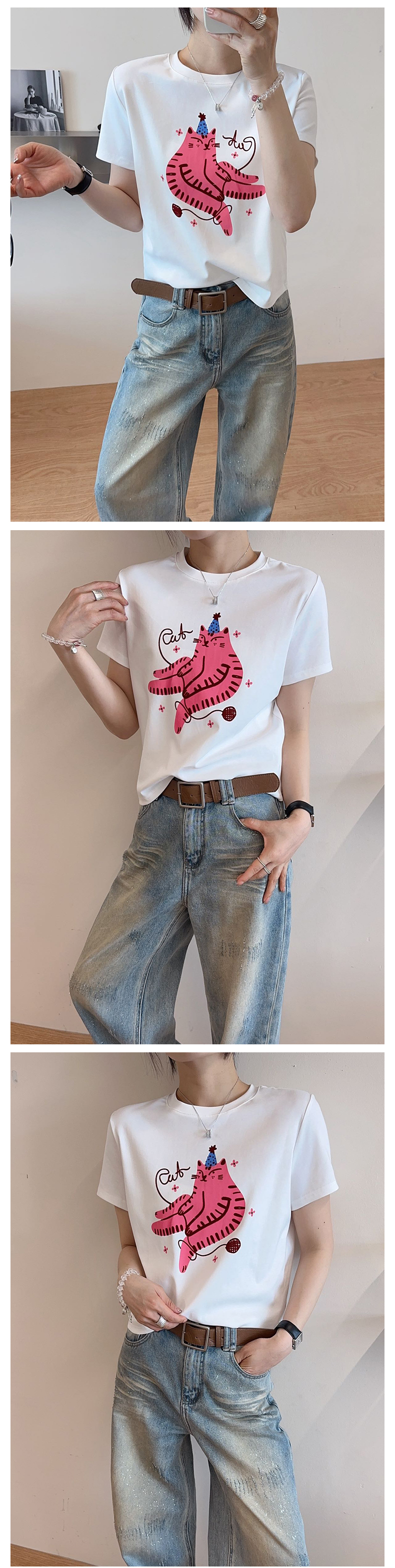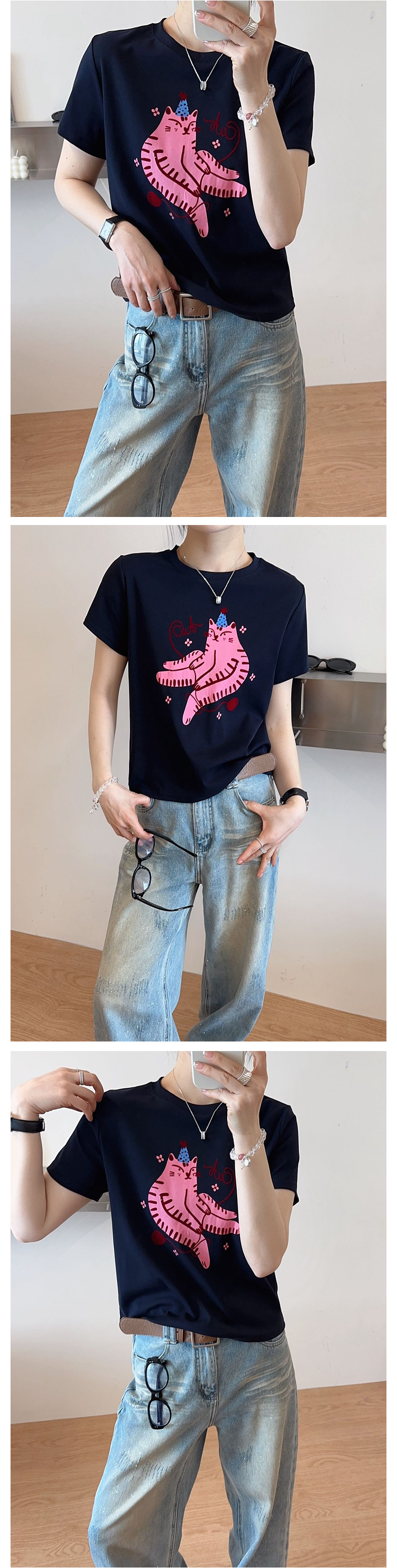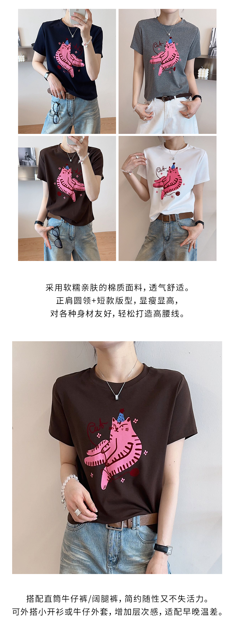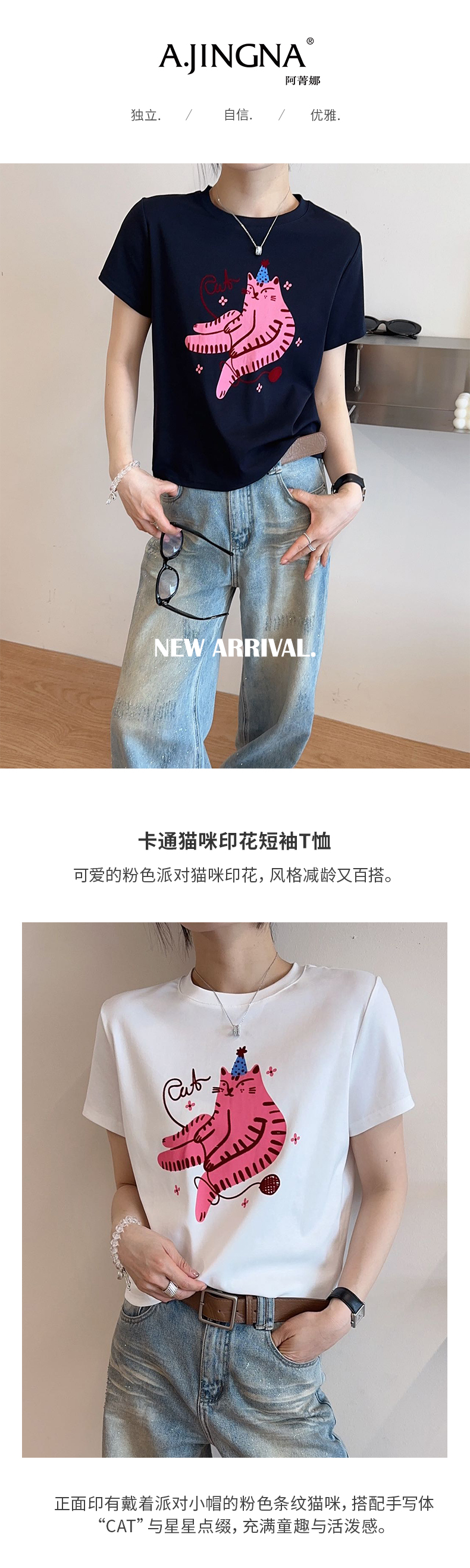【减龄百搭】阿菁娜春季新款卡通猫咪印花AB面短袖T恤F31C301023