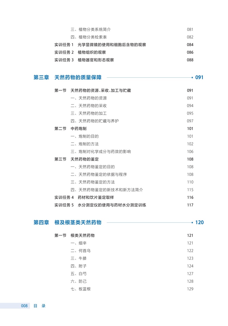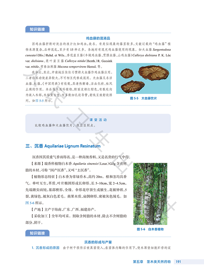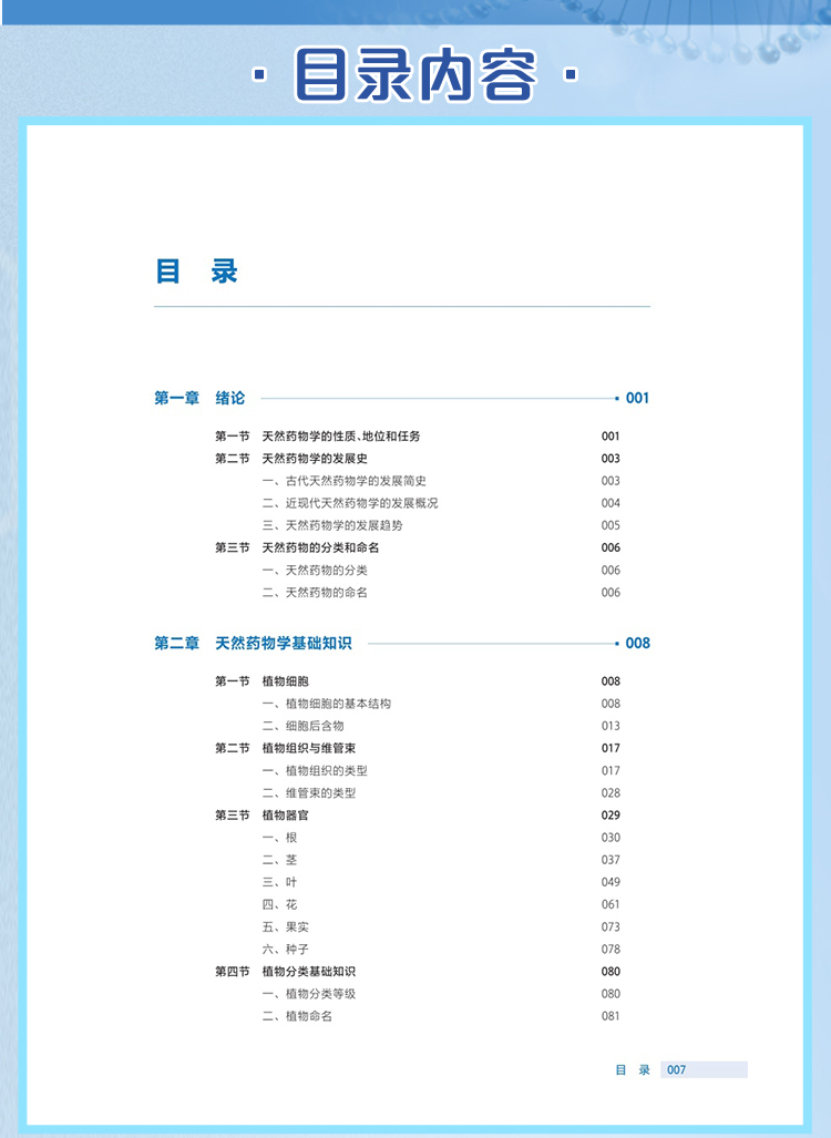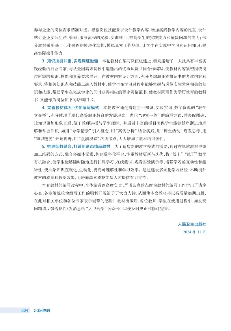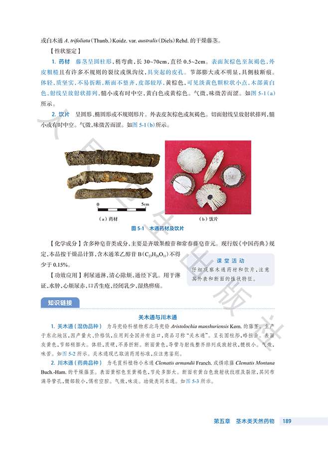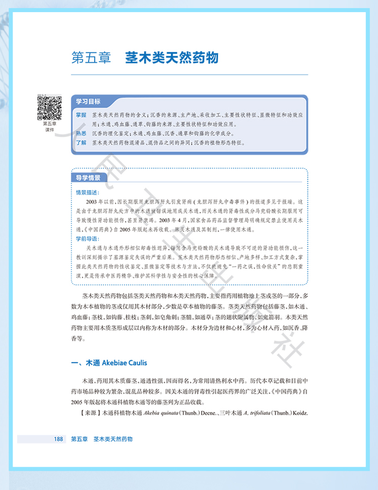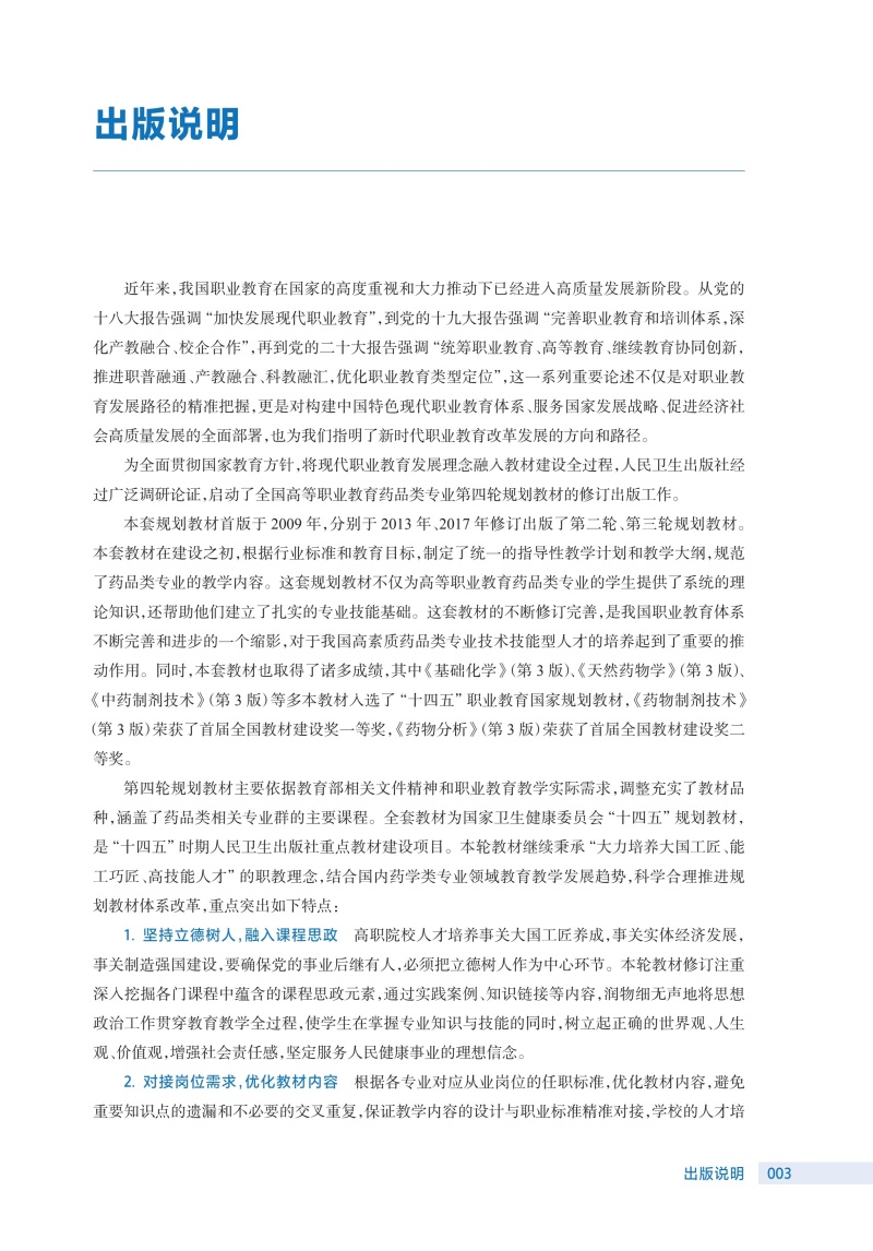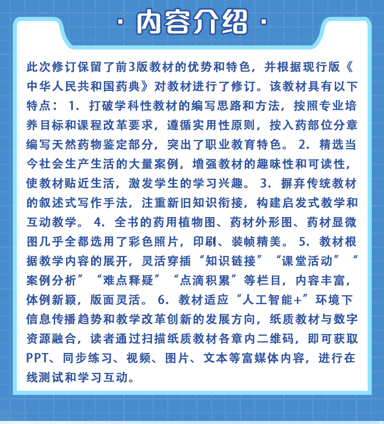 此次修订保留了前3版教材的优势和特色,并根据现行版《中华人民共和国药典》对教材进行了修订。该教材具有以下特点: 1.打破学科性教材的编写思路和方法,按照专业培养目标和课程改革要求,遵循实用性原则,按入药部位分章编写天然药物鉴定部分,突出了职业教育特色。 2.精选当今社会生产生活的大量案例,增强教材的趣味性和可读性,使教材贴近生活,激发学生的学习兴趣。 3.摒弃传统教材的叙述式写作手法,注重新旧知识衔接,构建启发式教学和互动教学。 4.全书的药用植物图、药材外形图、药材显微图几乎全都选用了彩色照片,印刷、装帧精美。 5.教材根据教学内容的展开,灵活穿插“知识链接”“课堂活动”“案例分析”“难点释疑”“点滴积累”等栏目,内容丰富,体例新颖,版面灵活。 6.教材适应“人工智能+”环境下信息传播趋势和教学改革创新的发展方向,纸质教材与数字资源融合,读者通过扫描纸质教材各章内二维码,即可获取PPT、同步练习、视频、图片、文本等富媒体内容,进行在线测试和学习互动。