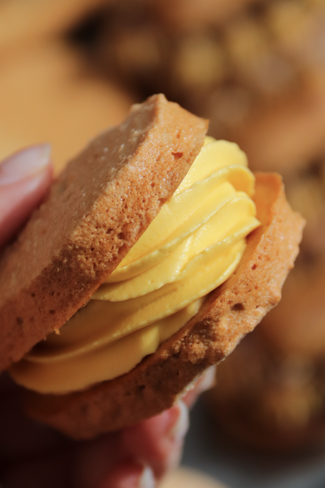 达克瓦滋 达克瓦滋在日本又被称作“珍珠盘”。由于表面撒上细腻均匀的糖粉,高温烘烤后形成颗粒状脆皮,因此而得名。它表层的酥脆和内部柔软轻盈,搭配不同馅料,口感富有很强的层次感。