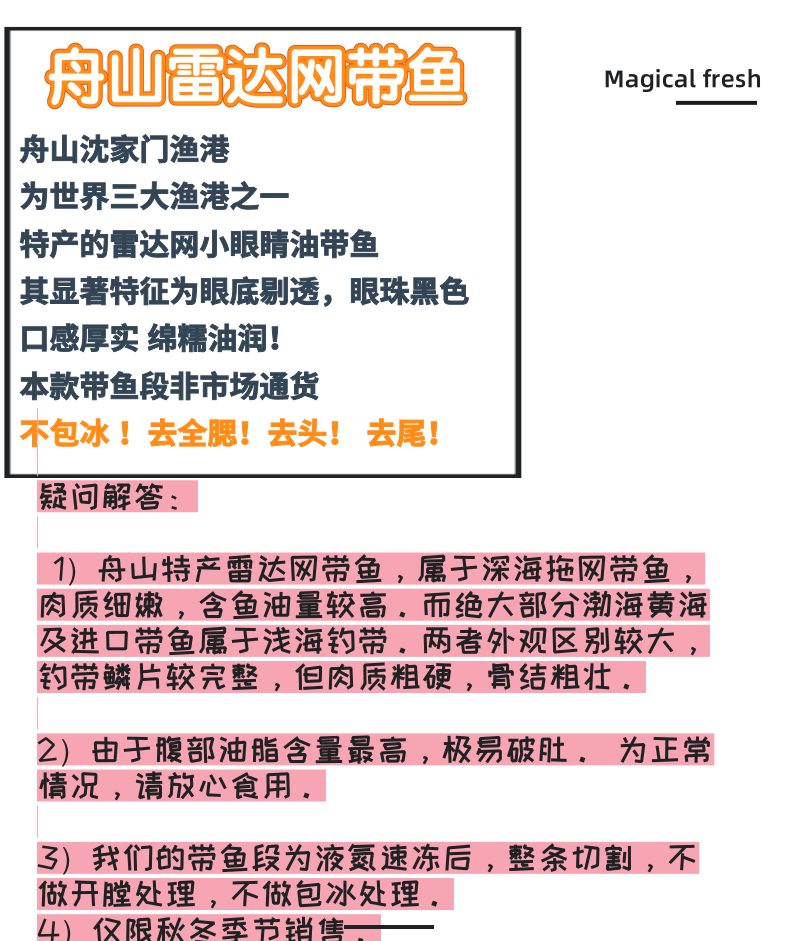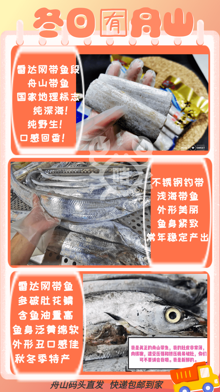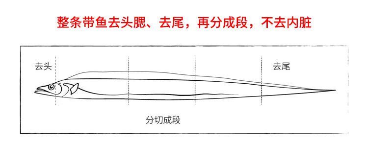 温馨提示:带鱼是野生海捕,到岸后急速预冷锁鲜,只去头鳃和尾巴,不二次清洗不去内脏,鱼内脏多少克总问题不售后!给用户提供是原材料!