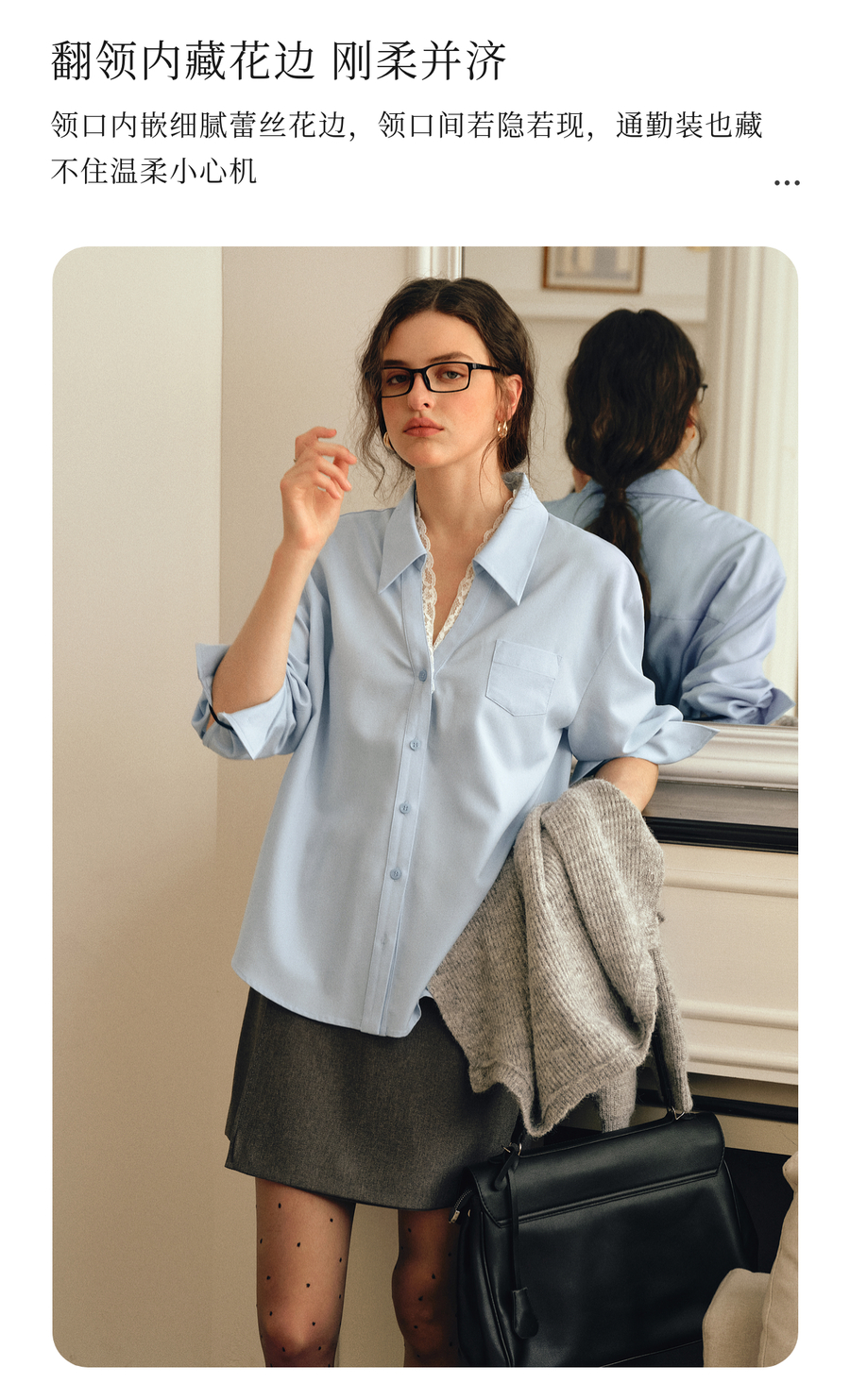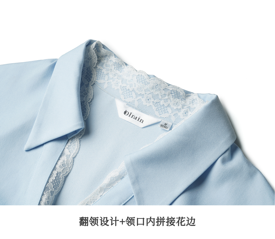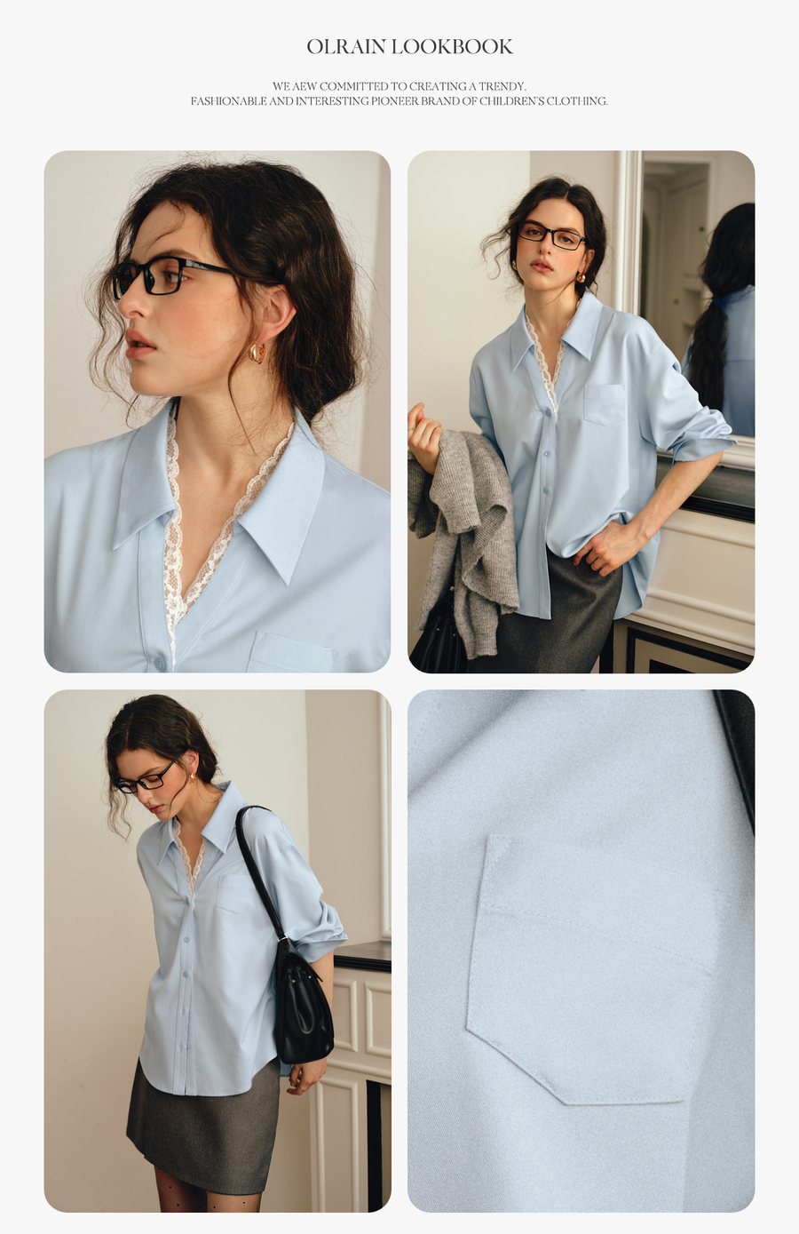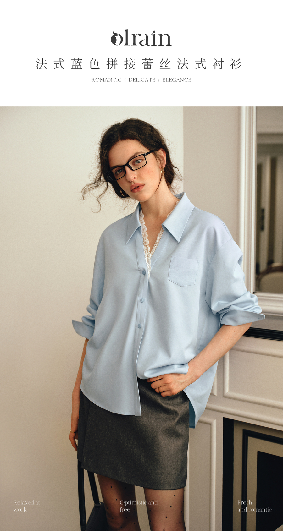 OLrain欧芮儿2025新款女秋季法式蓝色拼接蕾丝花边衬衫长袖衬衣