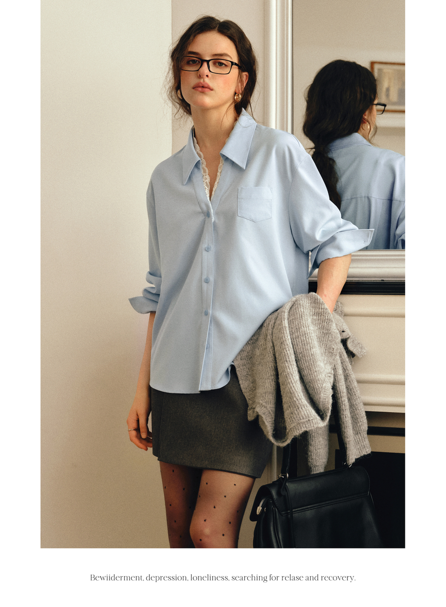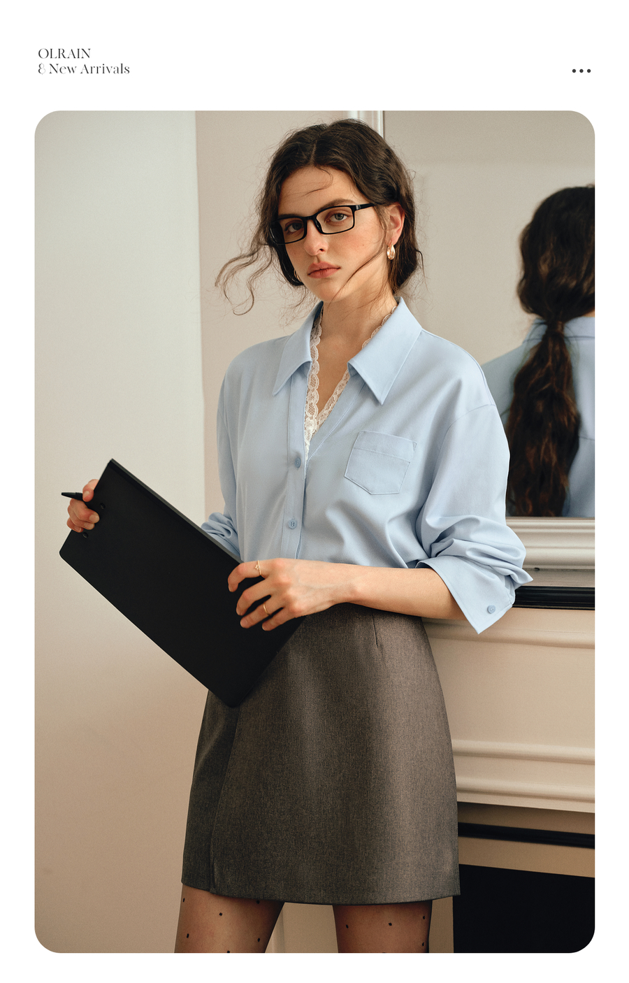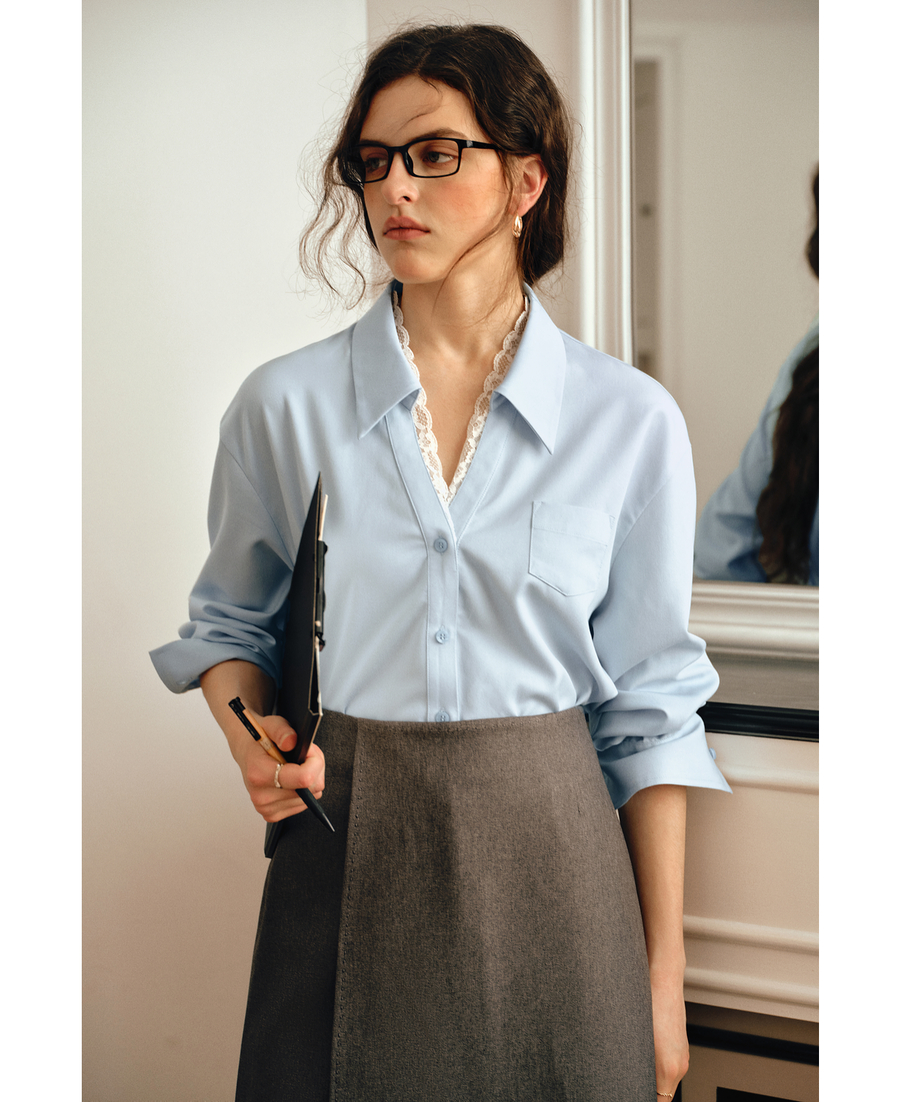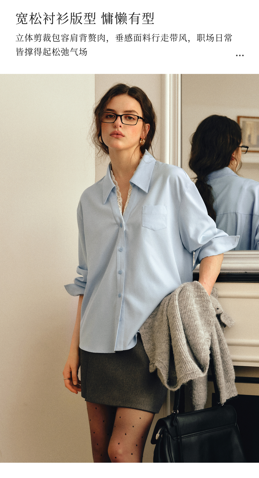 OLrain欧芮儿2025新款女秋季法式蓝色拼接蕾丝花边衬衫长袖衬衣