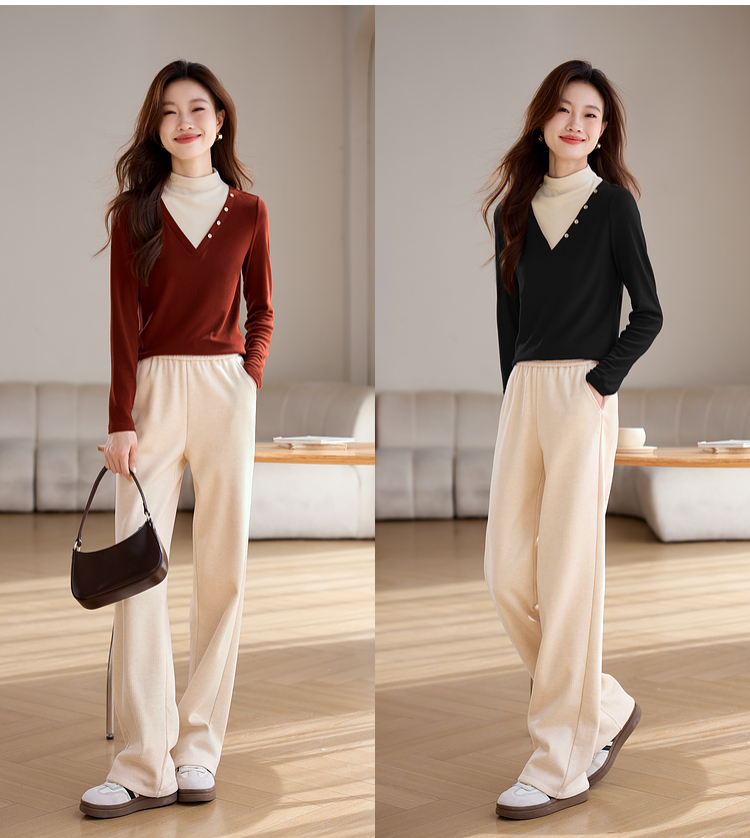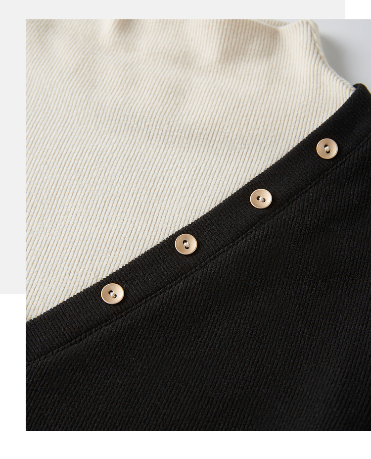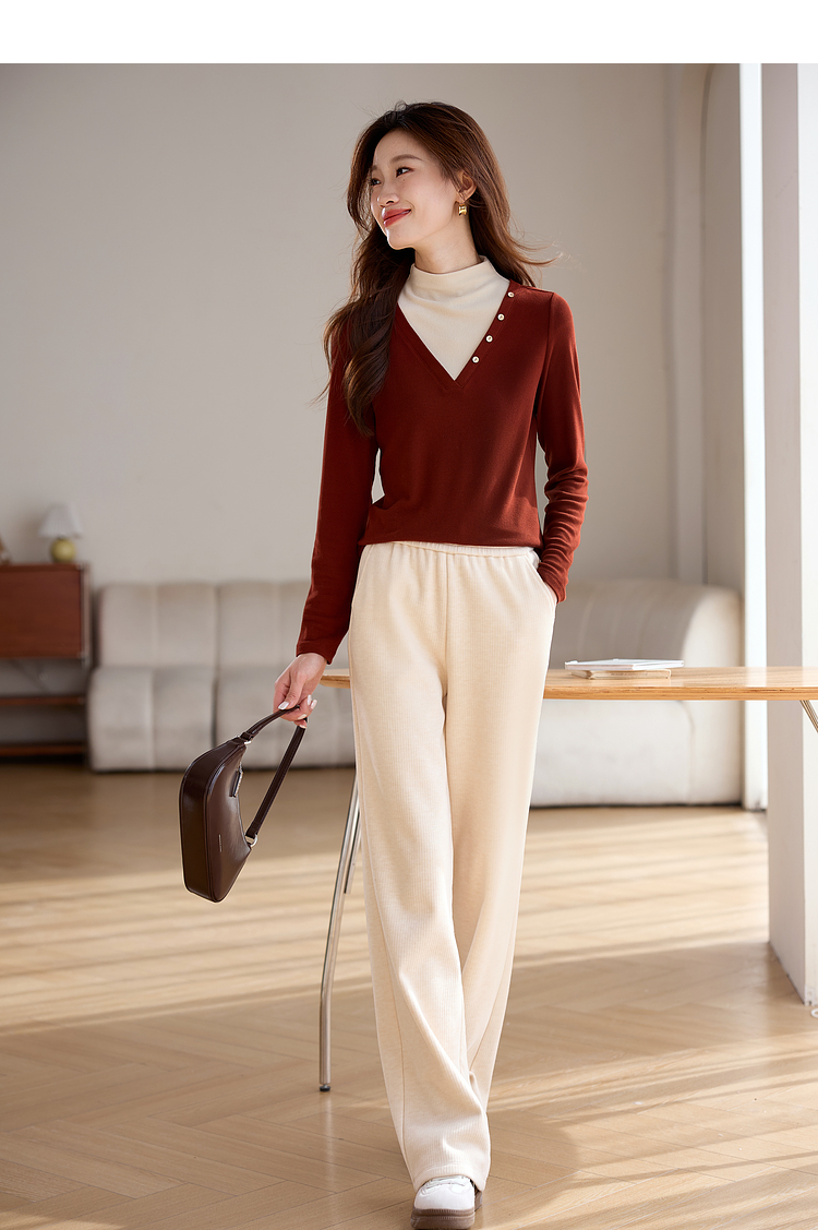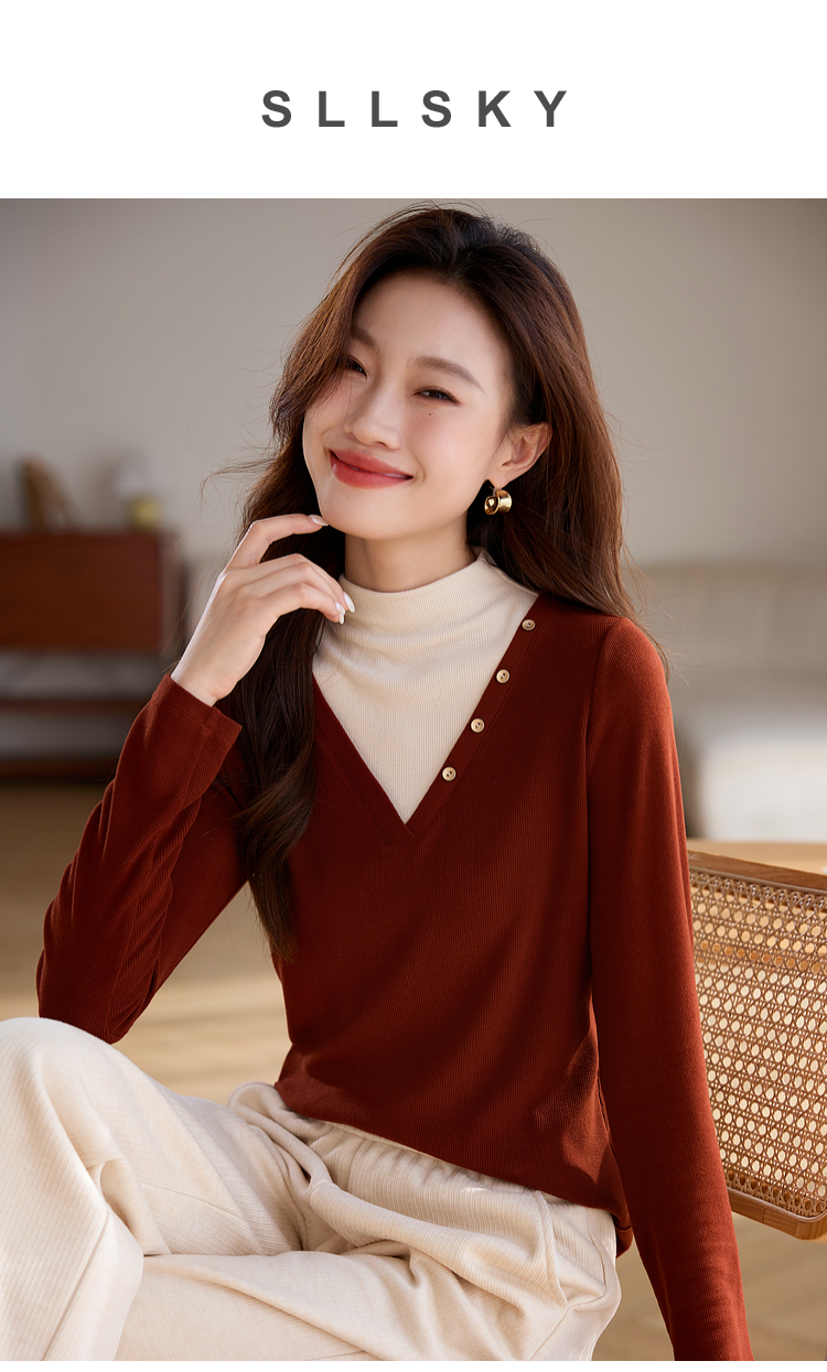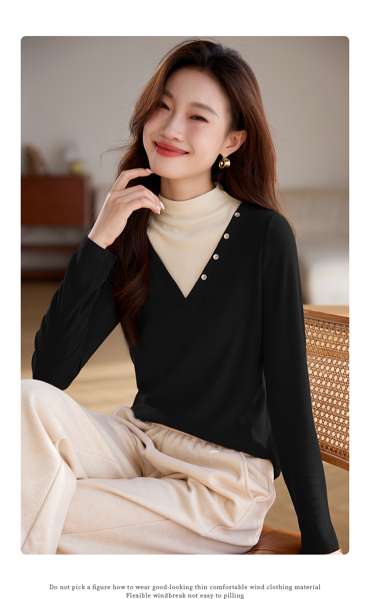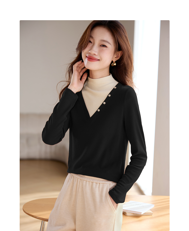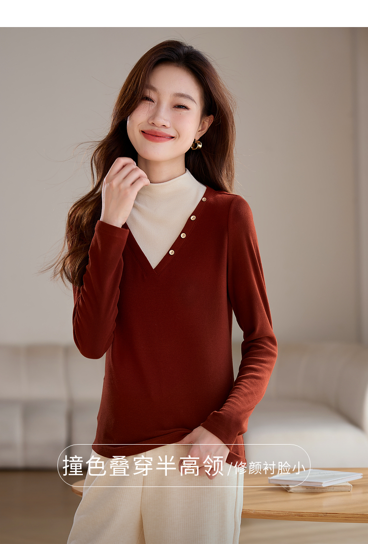 【1件75折】熙世界撞色半高领假两件打底衫女2025秋冬内搭仿羊绒磨毛针织上衣