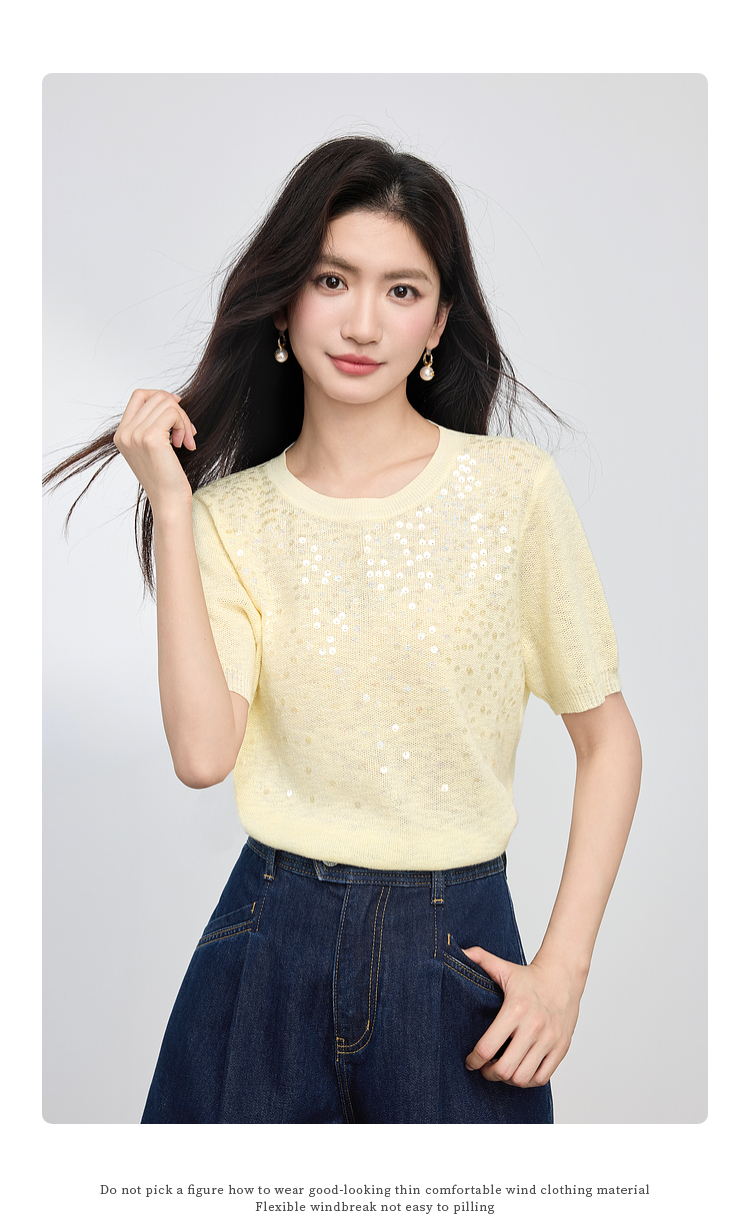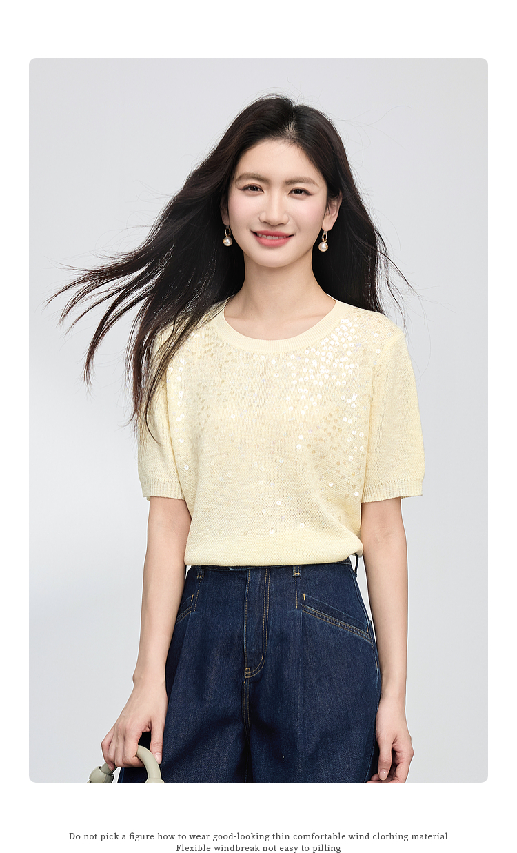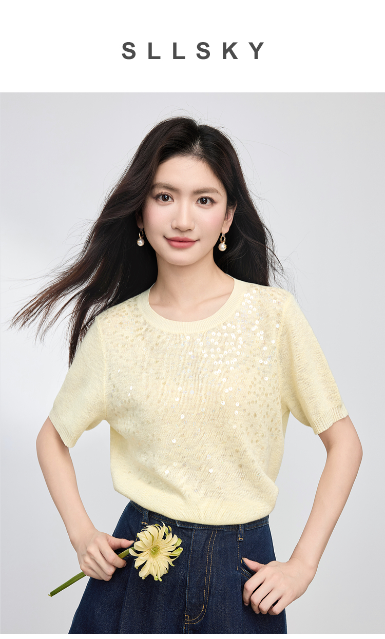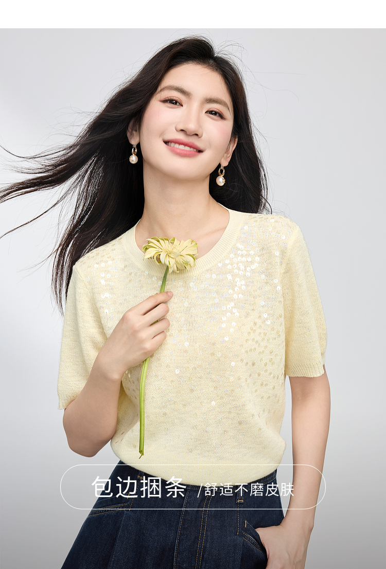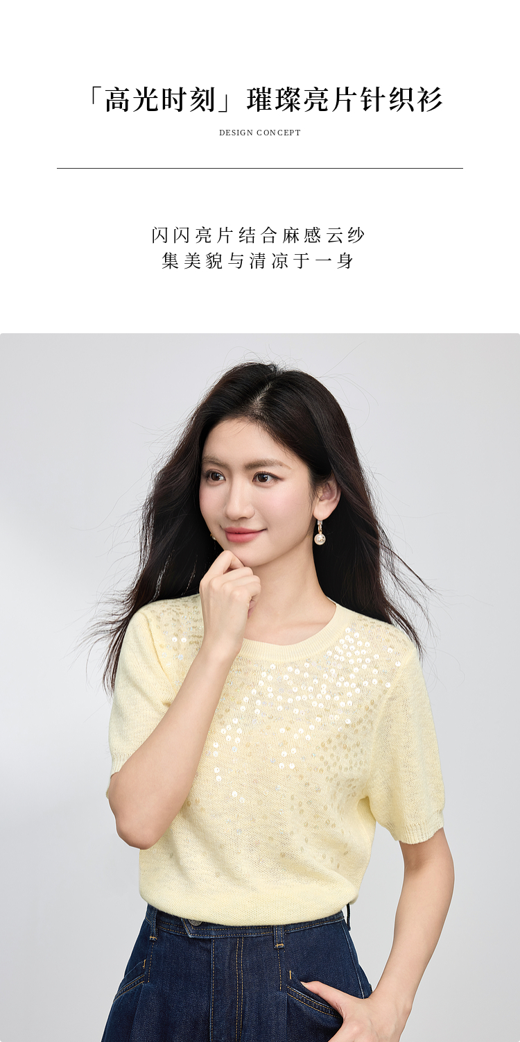 熙世界法式亮片冰丝针织衫女夏季薄款2025新款圆领独特漂亮的上衣