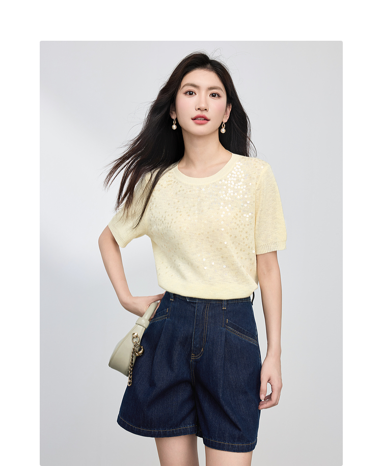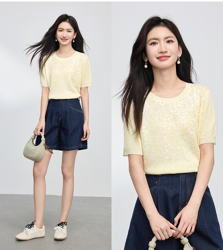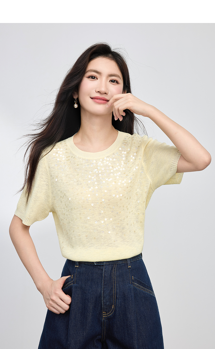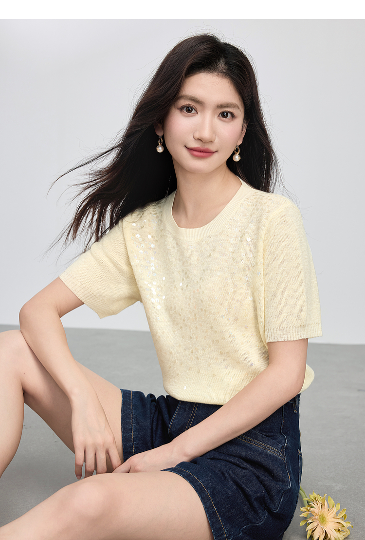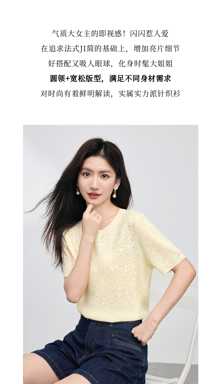 熙世界法式亮片冰丝针织衫女夏季薄款2025新款圆领独特漂亮的上衣