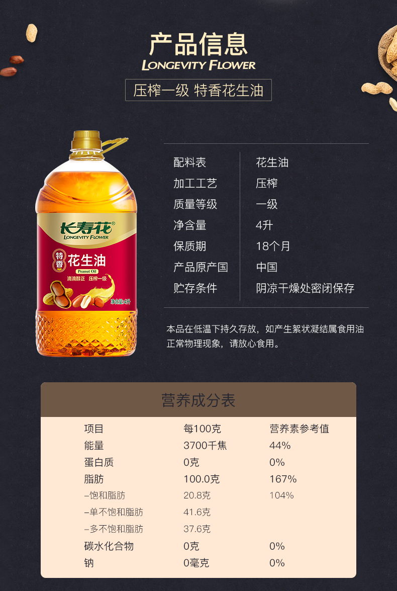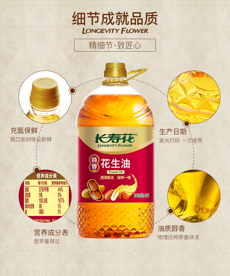 长寿花特香花生4L/桶 压榨一级 物理压榨食用油 新日期