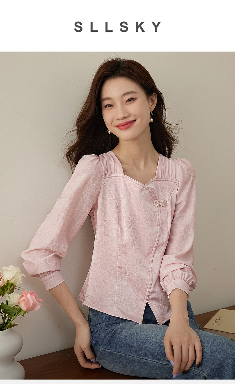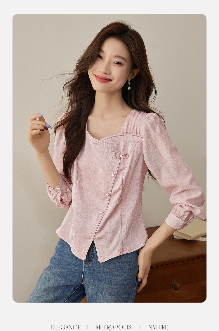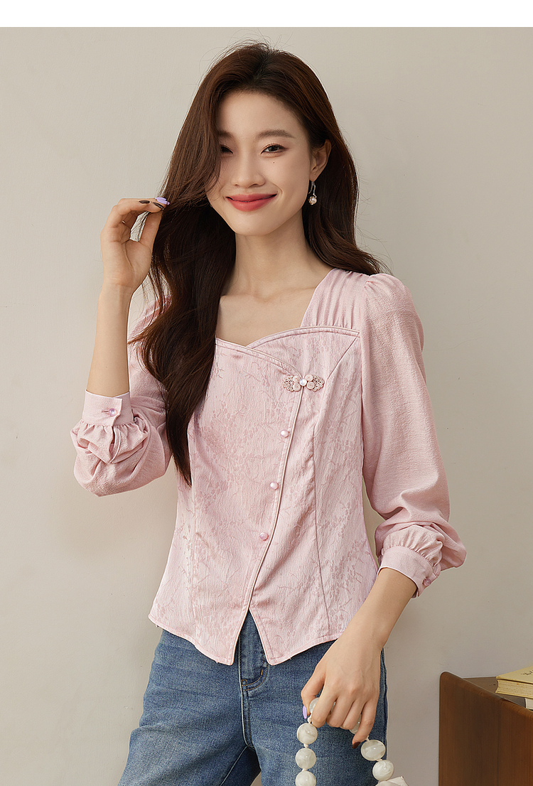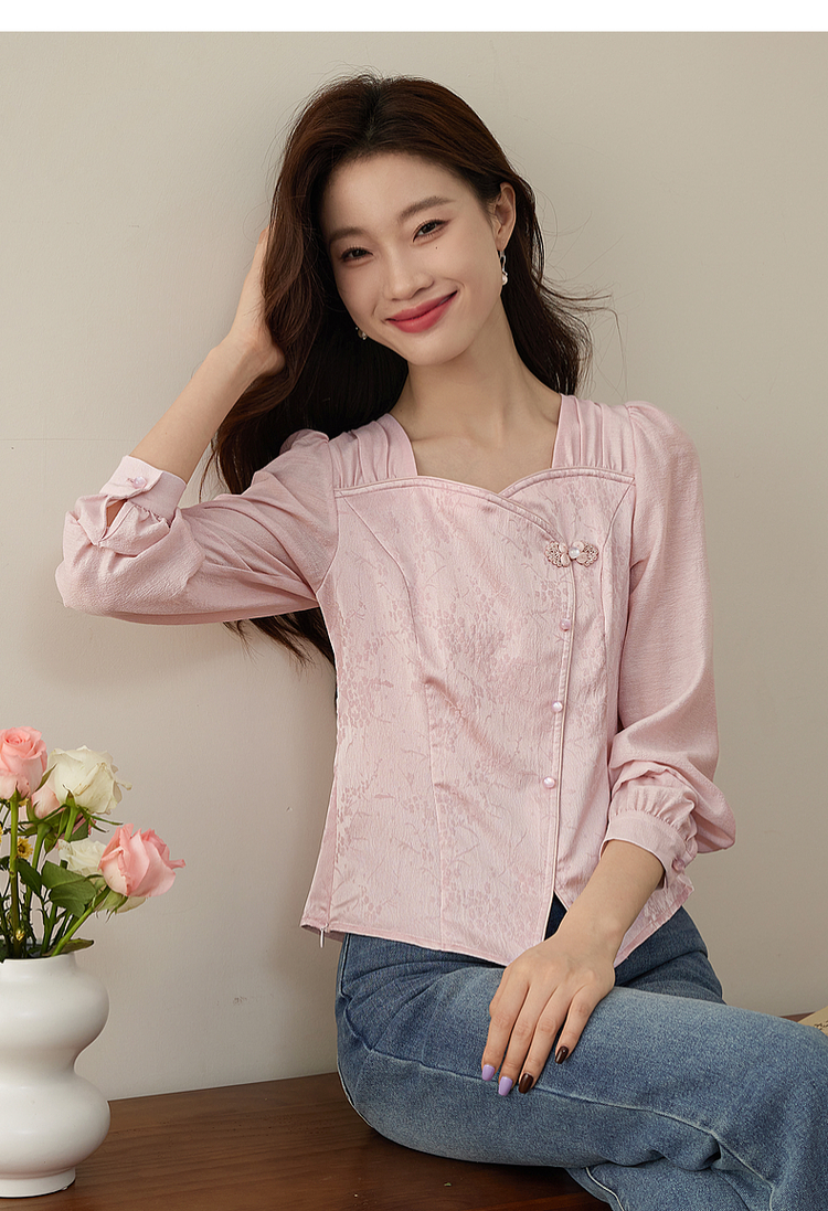 【年终特卖】熙世界《花笺》新中式提花衬衫女春2025新款国风长袖粉色方领上衣