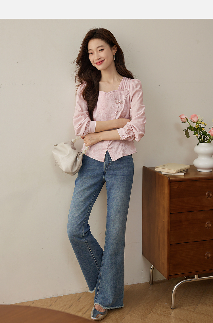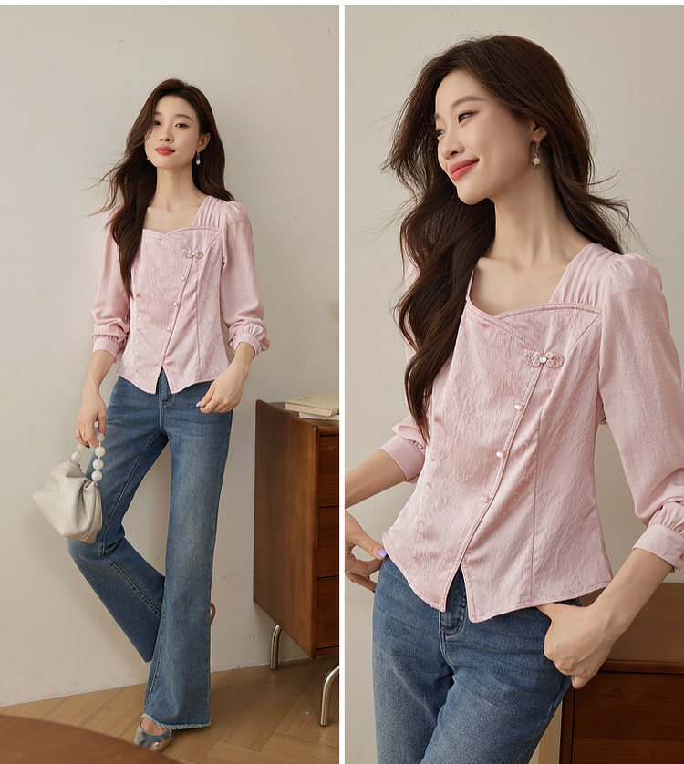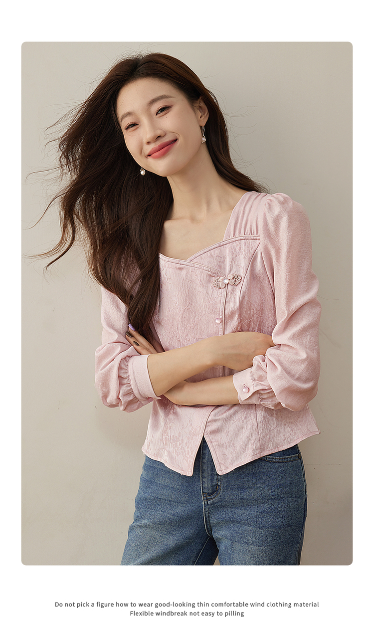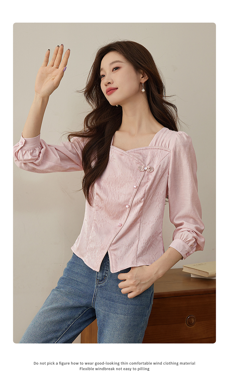 【年终特卖】熙世界《花笺》新中式提花衬衫女春2025新款国风长袖粉色方领上衣
