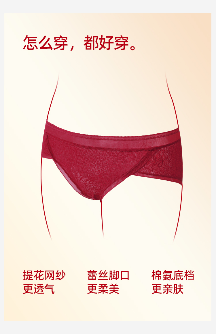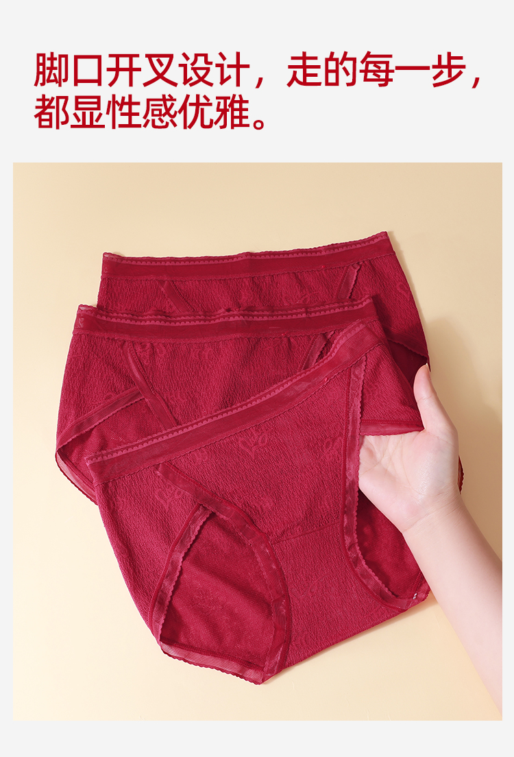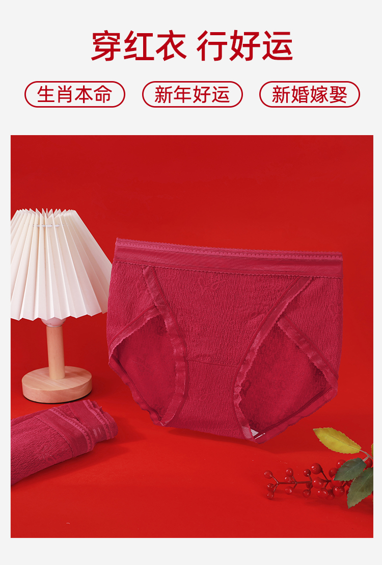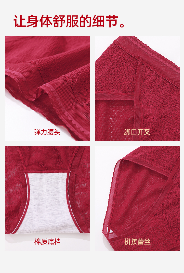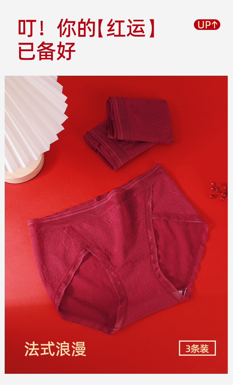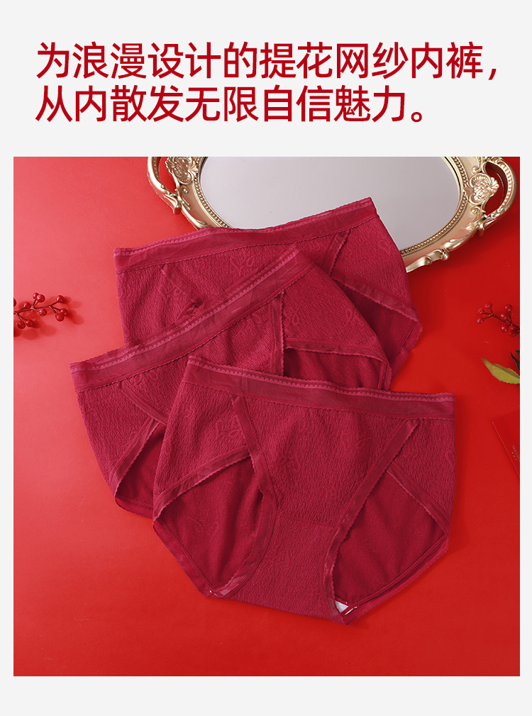 【3条装】熳洁儿 红色女士内裤新年本命年包臀蕾丝提花网纱24762125