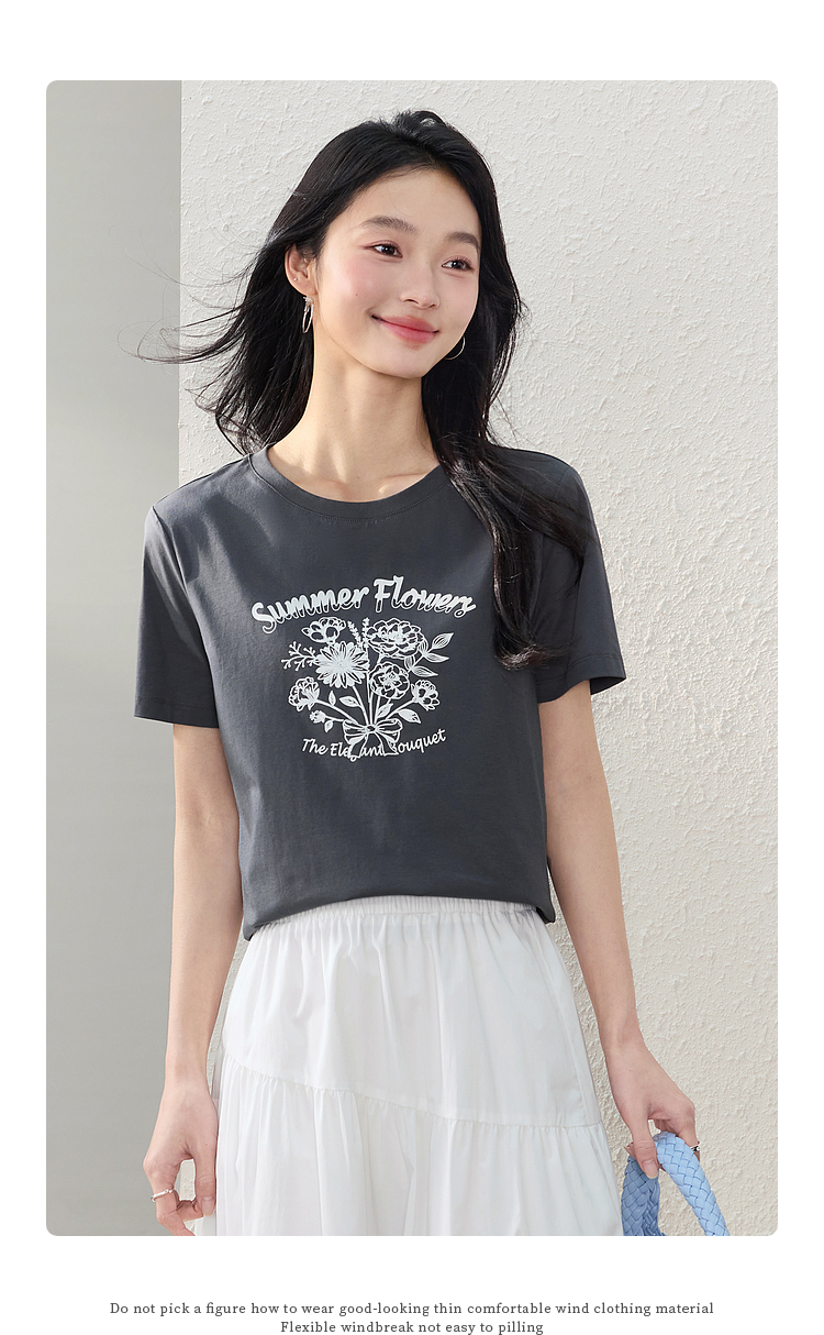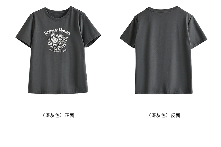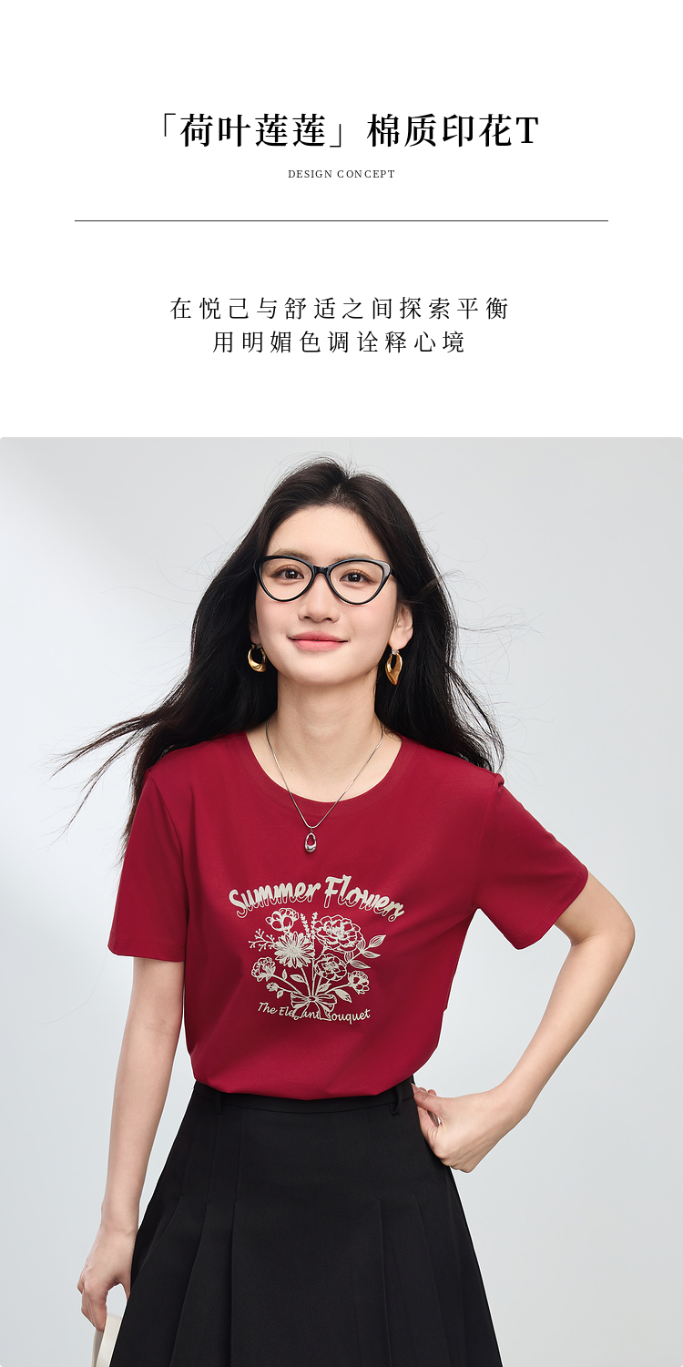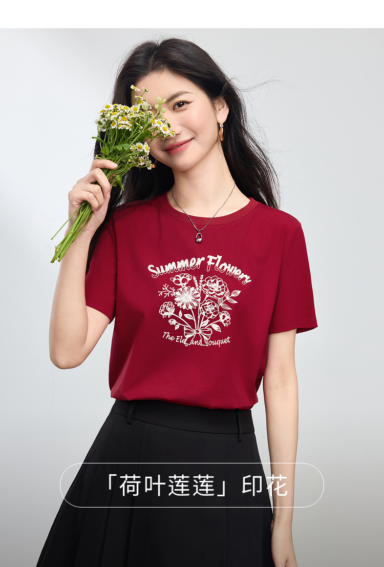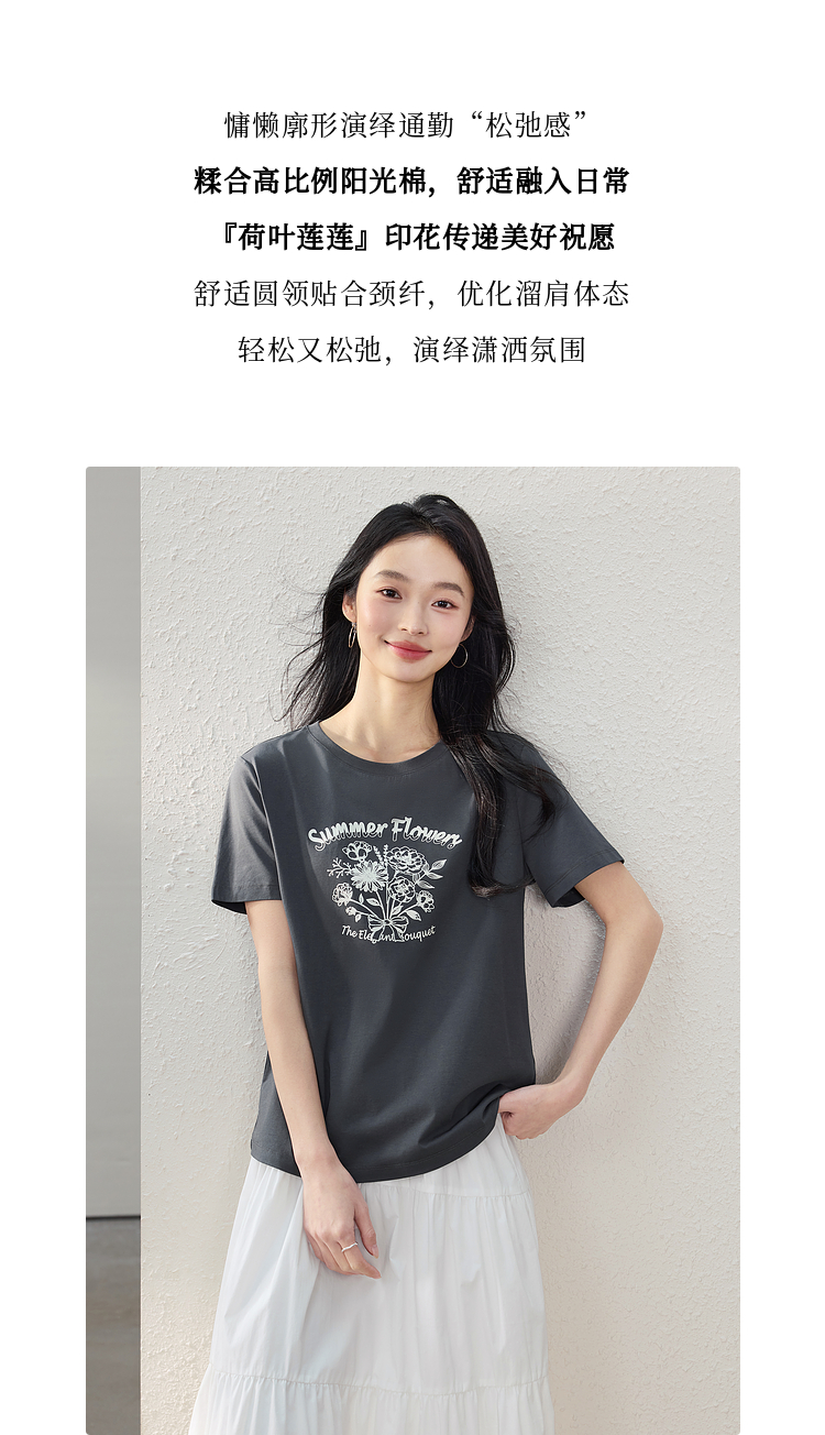 【专属特价】熙世界荷叶莲花印花正肩T恤女夏季2025新款宽松显瘦圆领短袖上衣