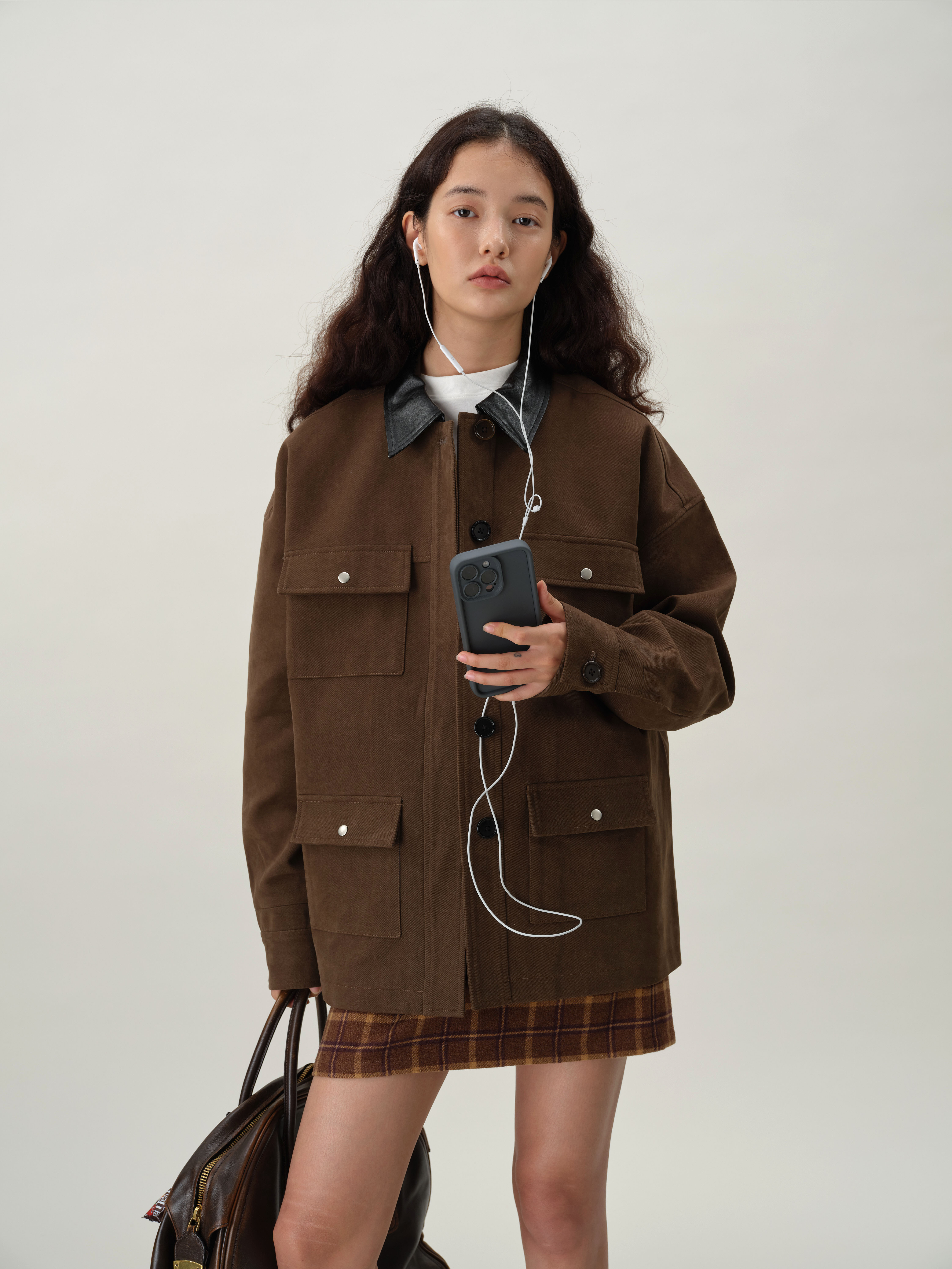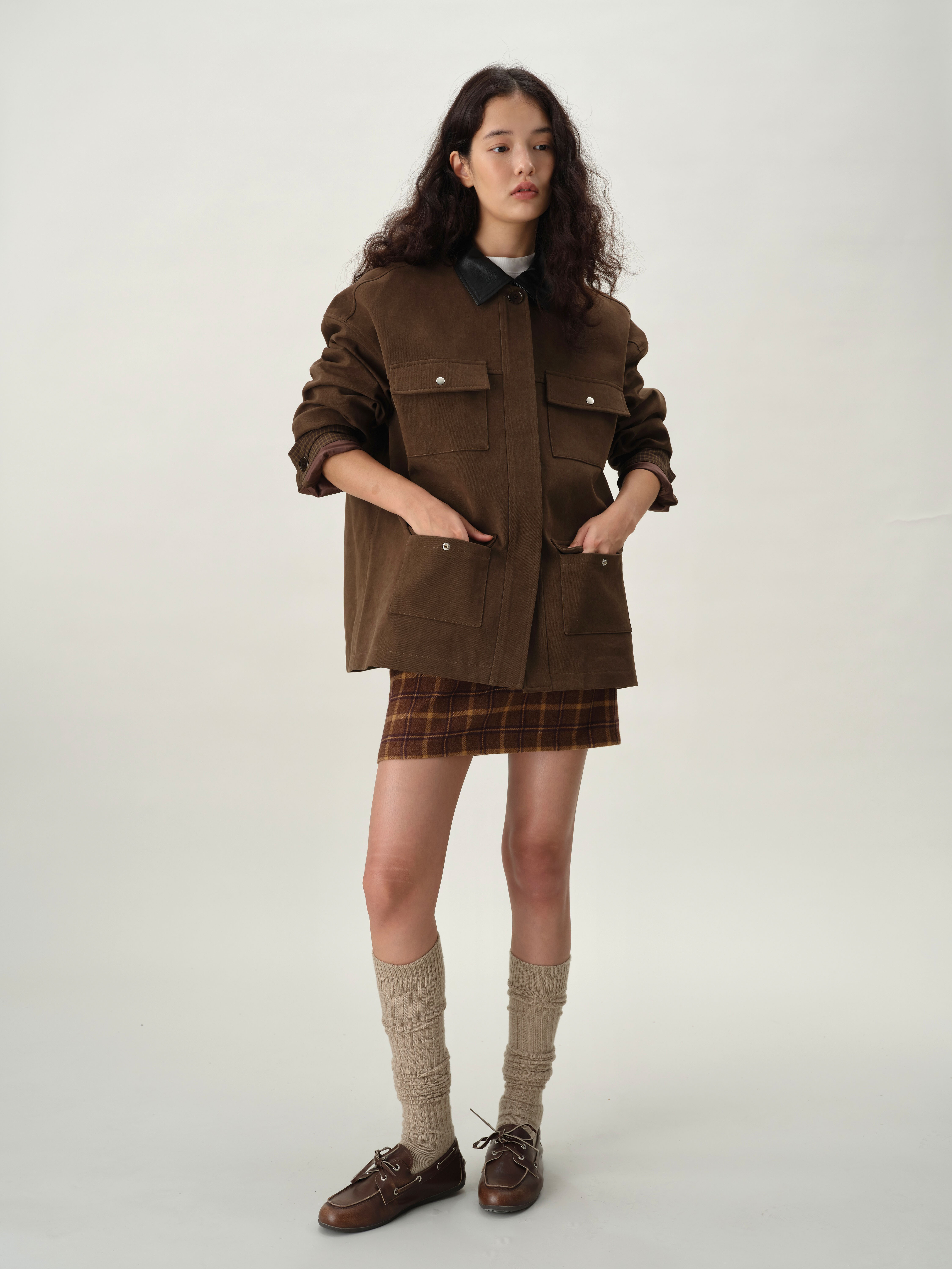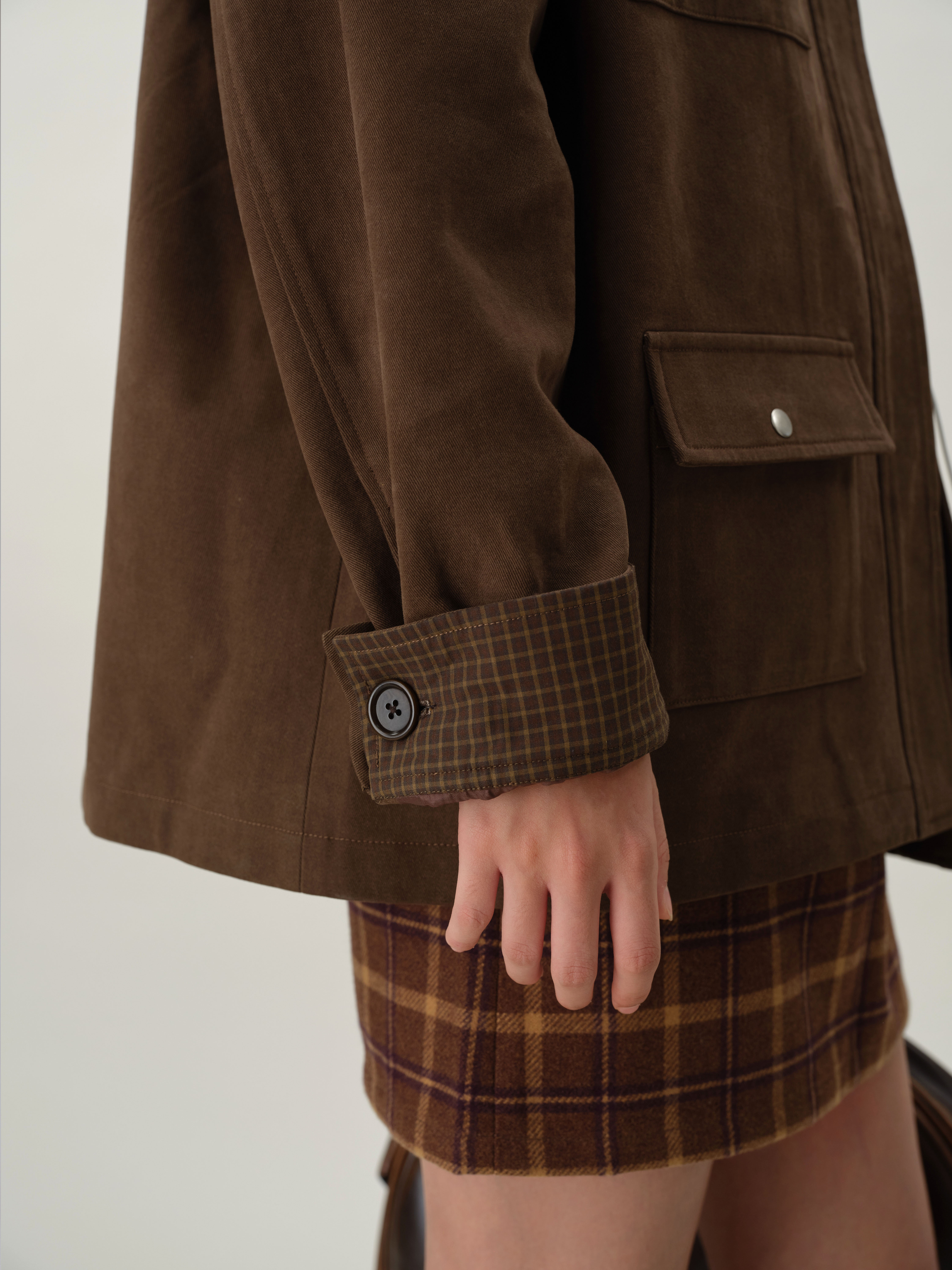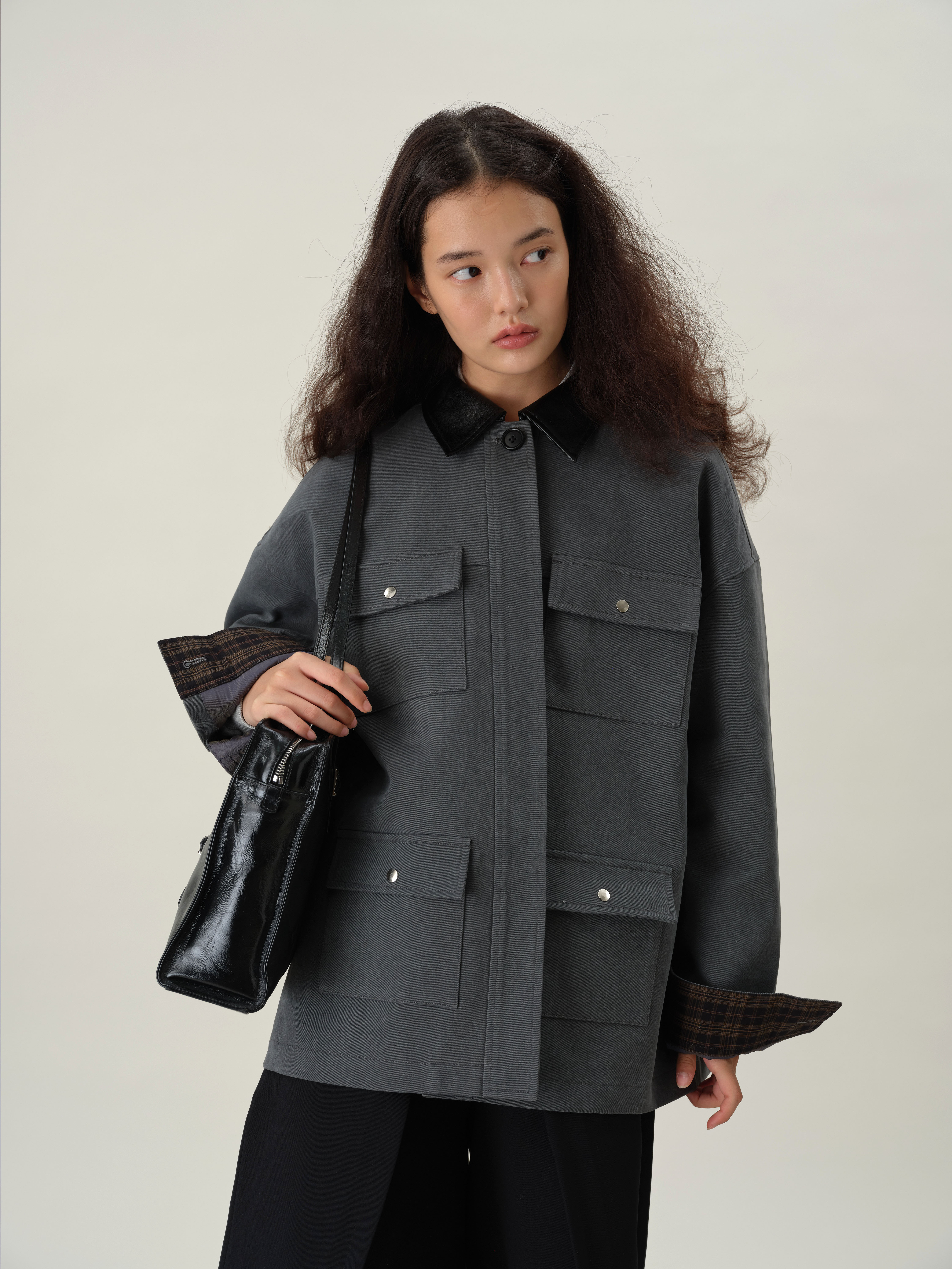 shyshystill/shy202408008/重工水洗棉好版型工装口袋格纹拼袖口拼领夹克