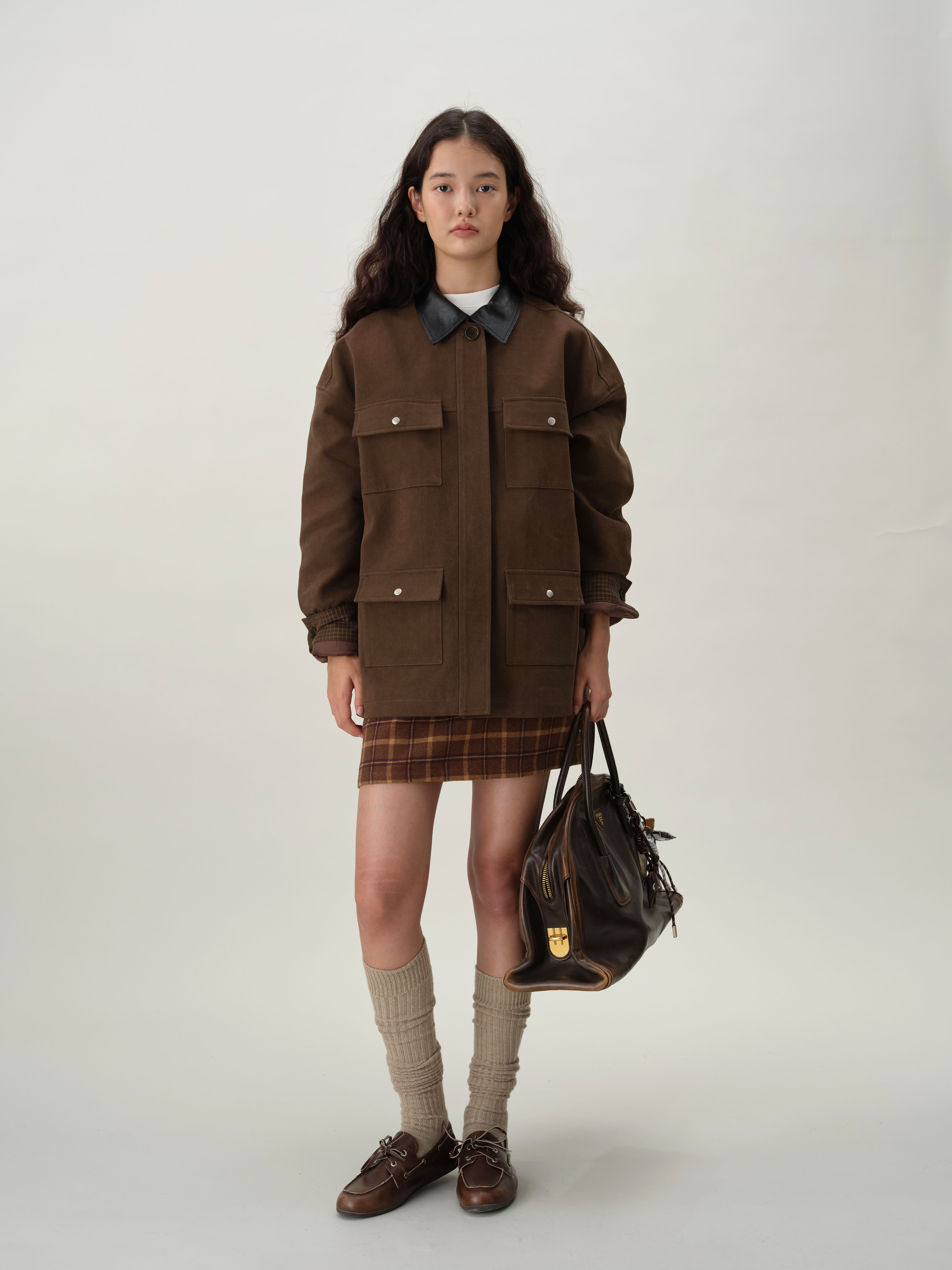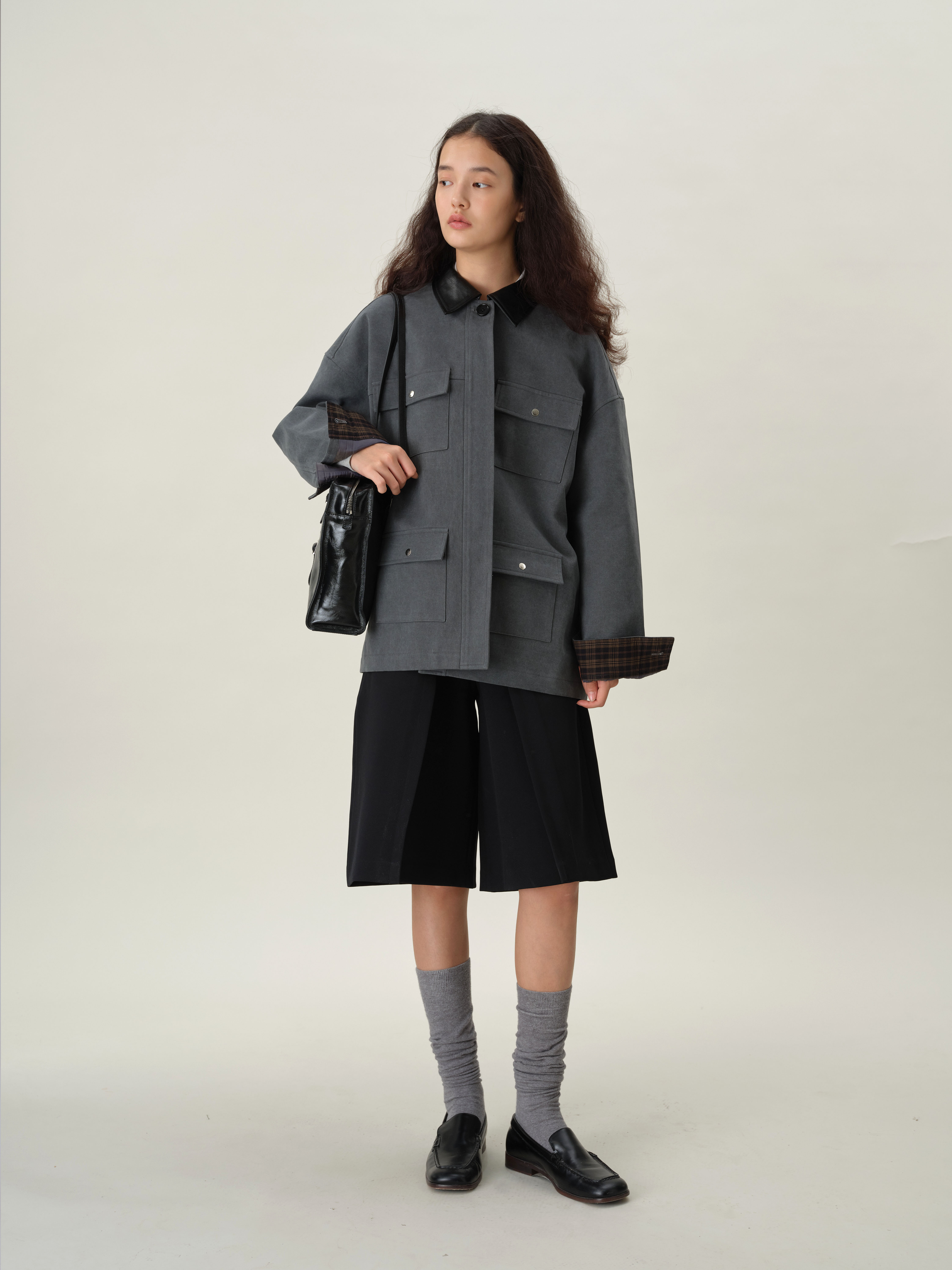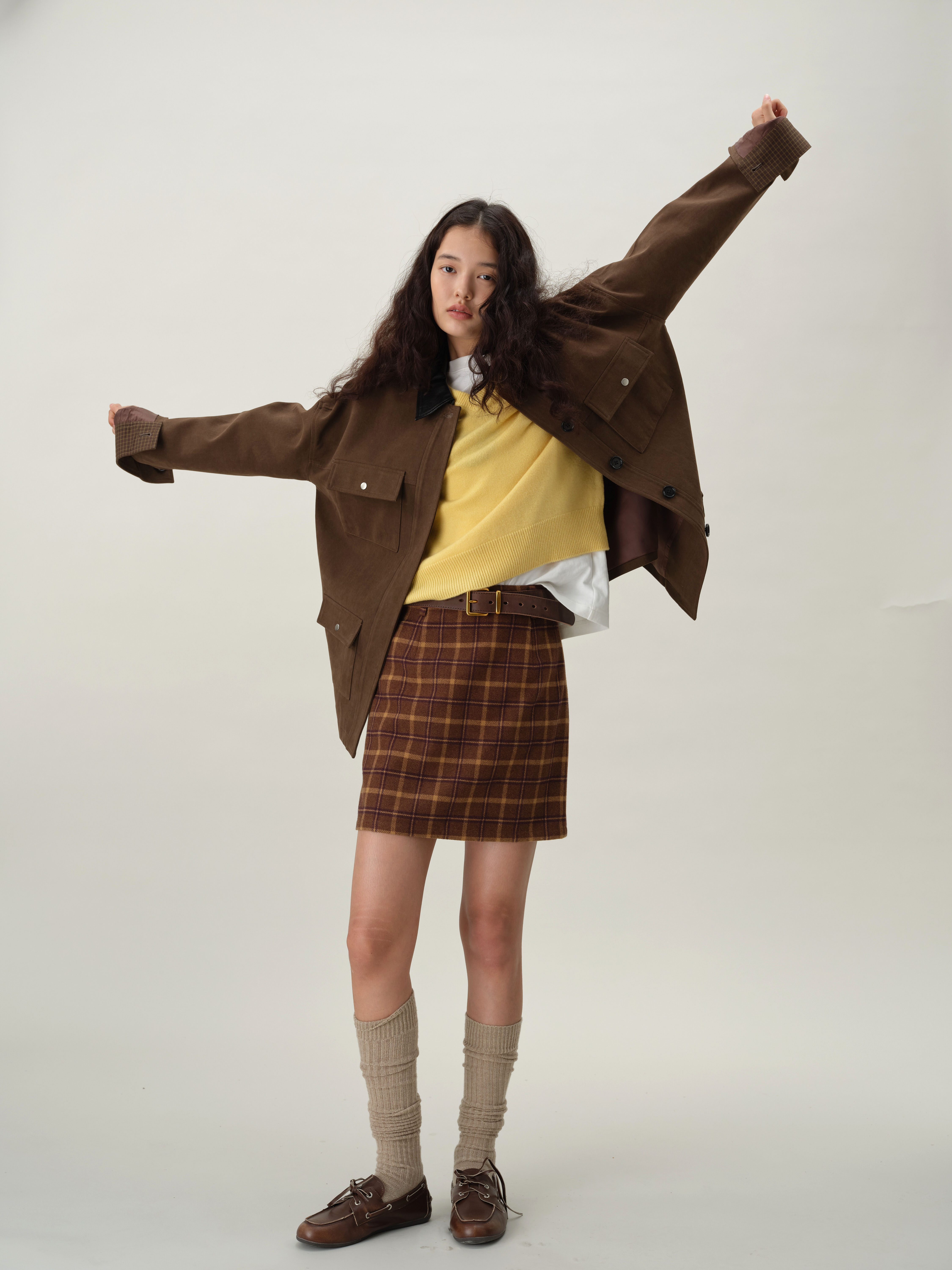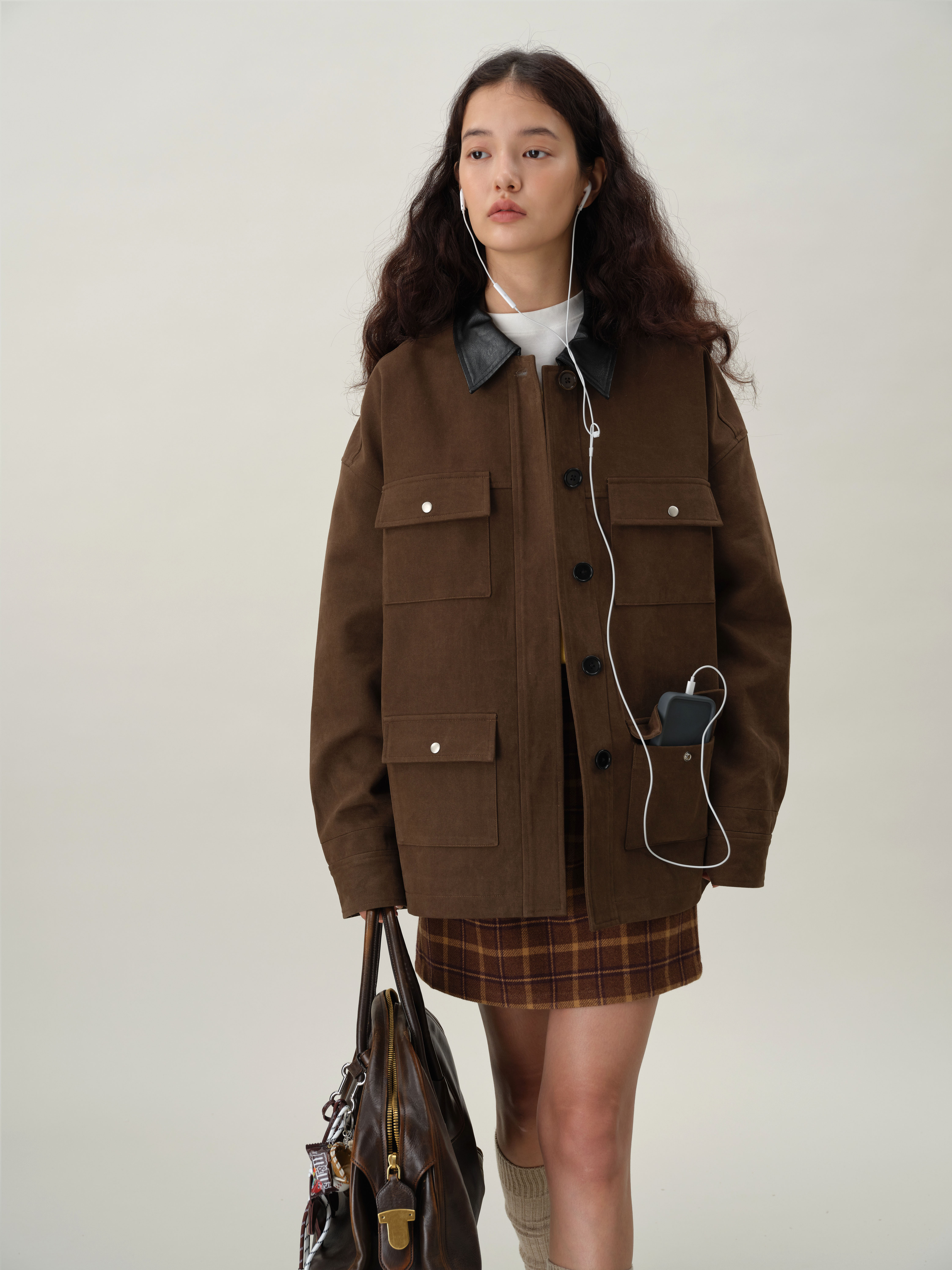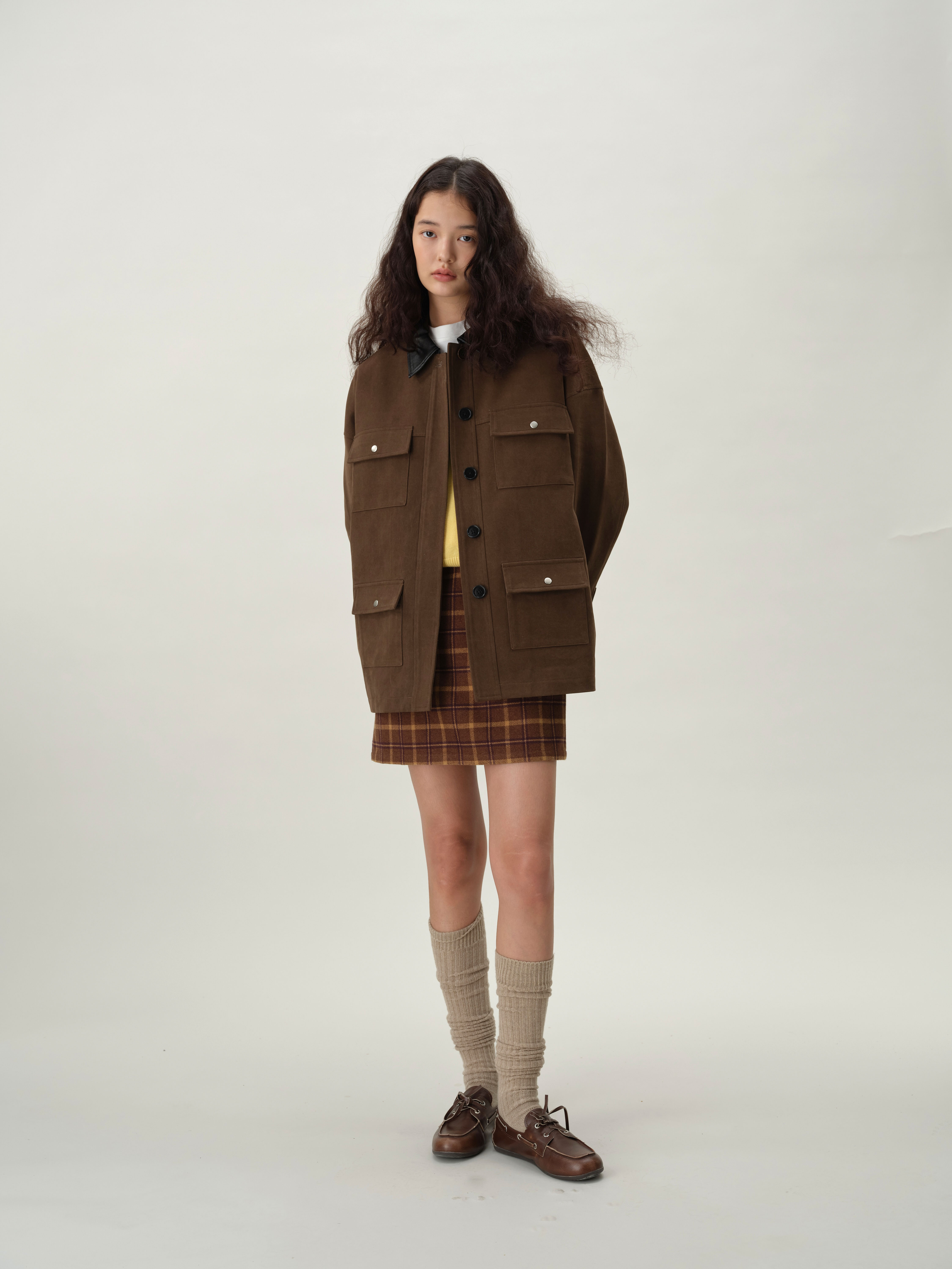 shyshystill/shy202408008/重工水洗棉好版型工装口袋格纹拼袖口拼领夹克