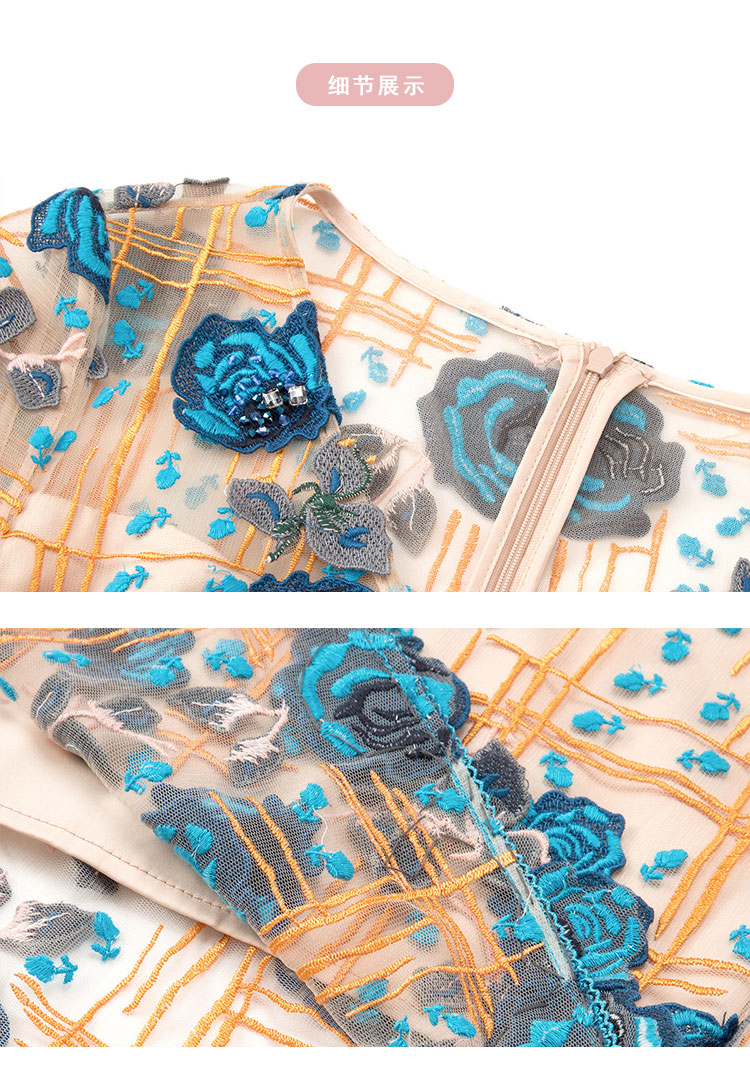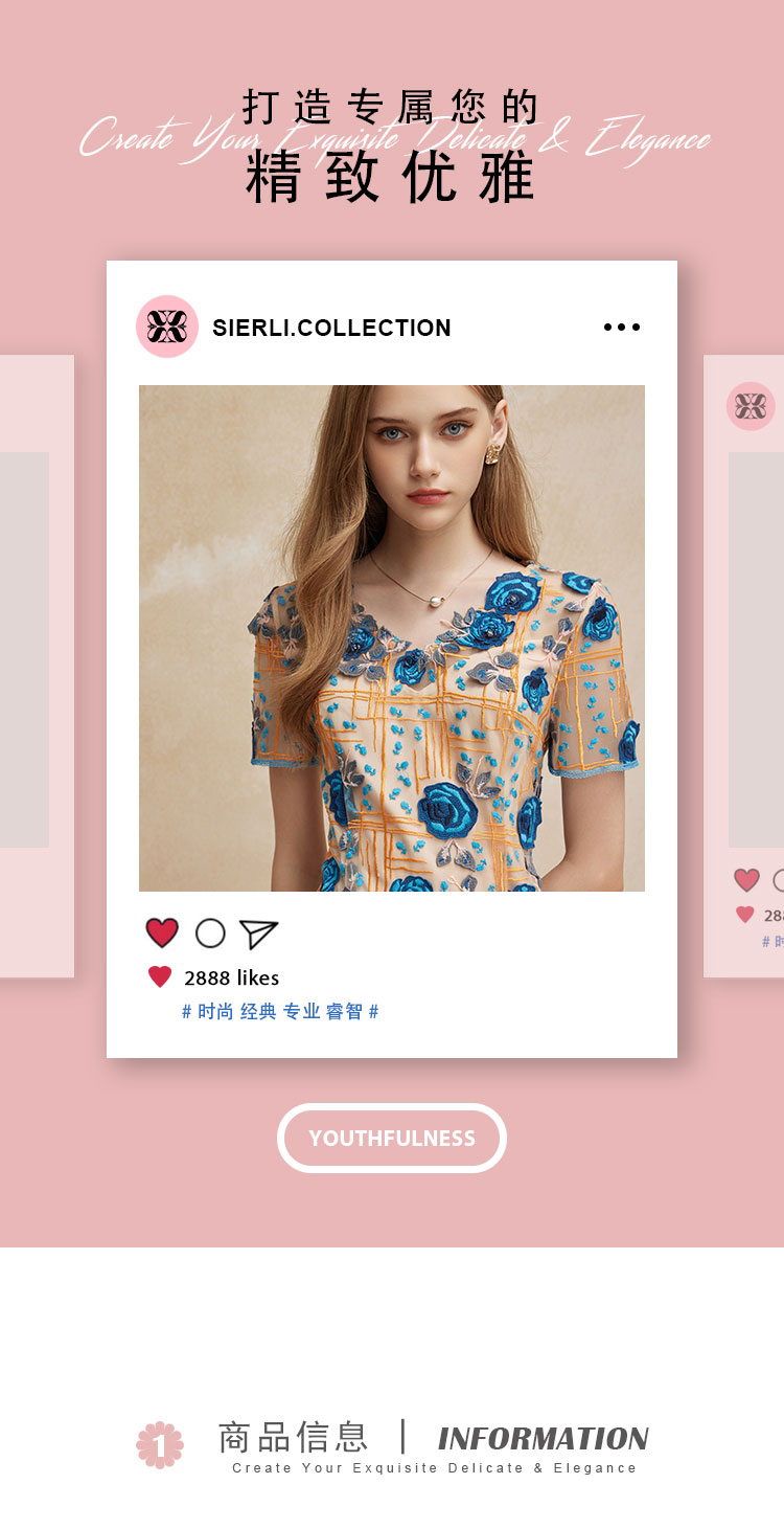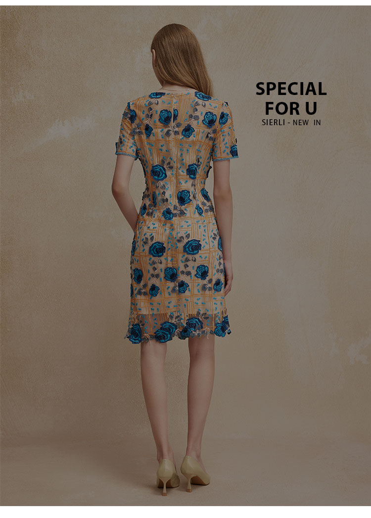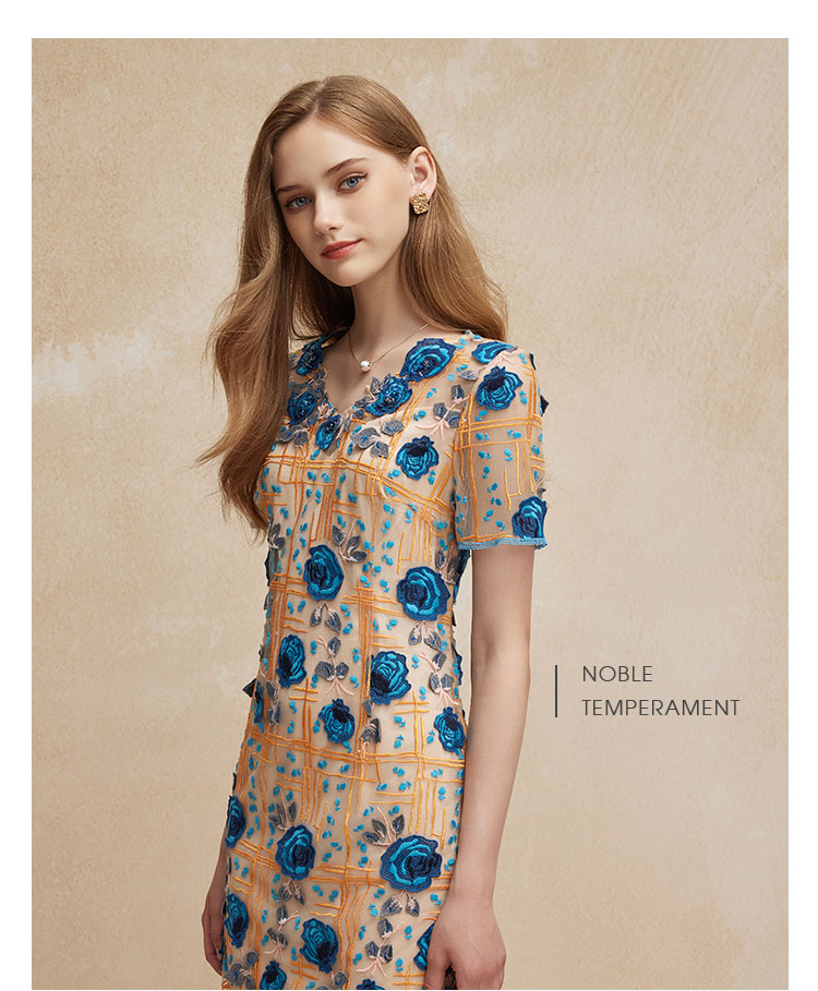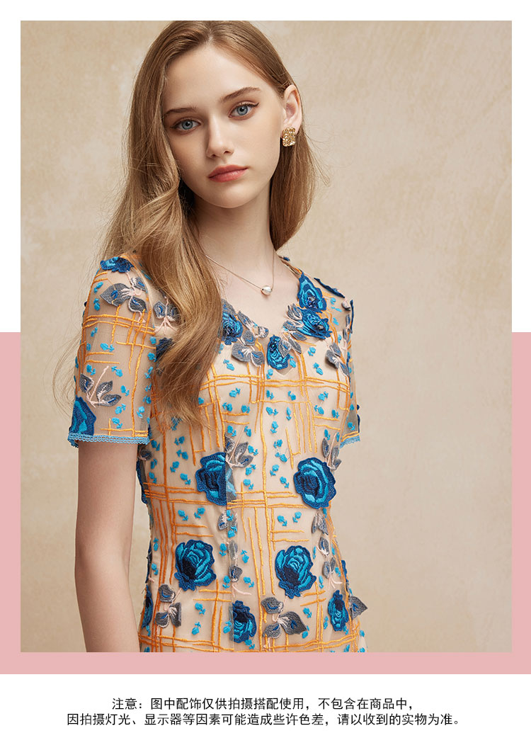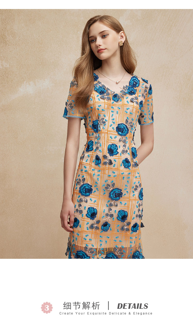 PF84A斯尔丽夏季新品 蕾丝全身贴花 短袖修身V领 中款连衣裙