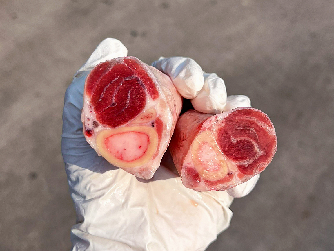 肌间脂肪分布均匀,骨肉连接紧密,肥瘦均匀。