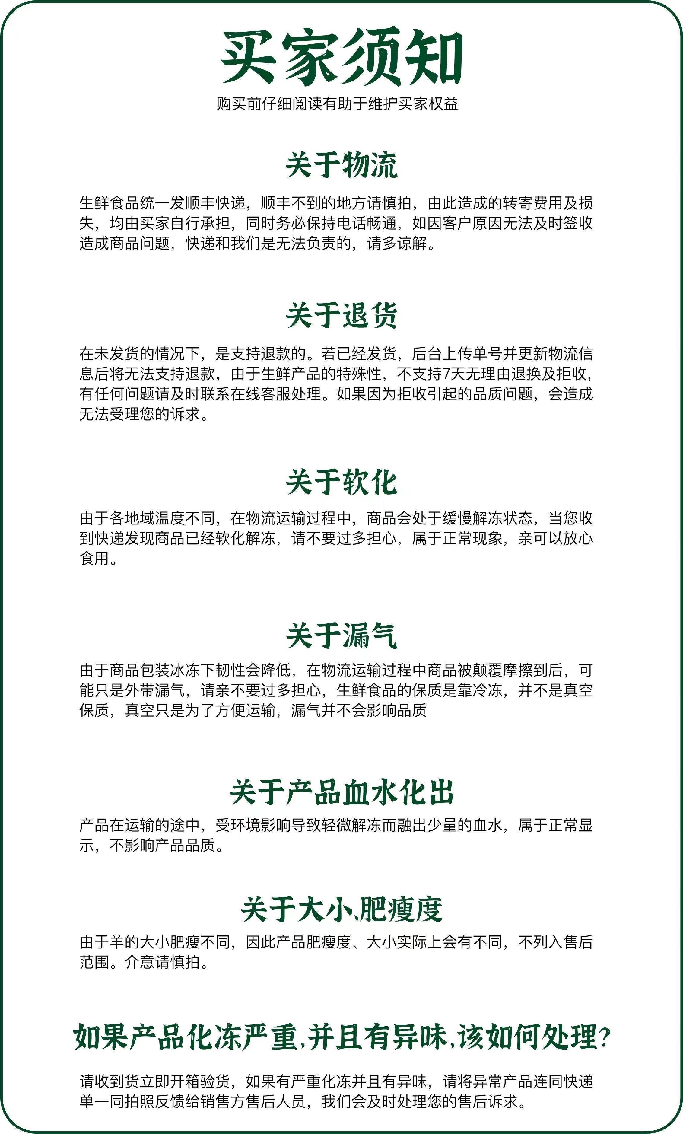3.羊肉冷冻发货,真空包装仅用于方便分装、发货,不起到保鲜作用;经过运输过程中的颠簸,真空袋漏气属于正常现象,不影响食用。